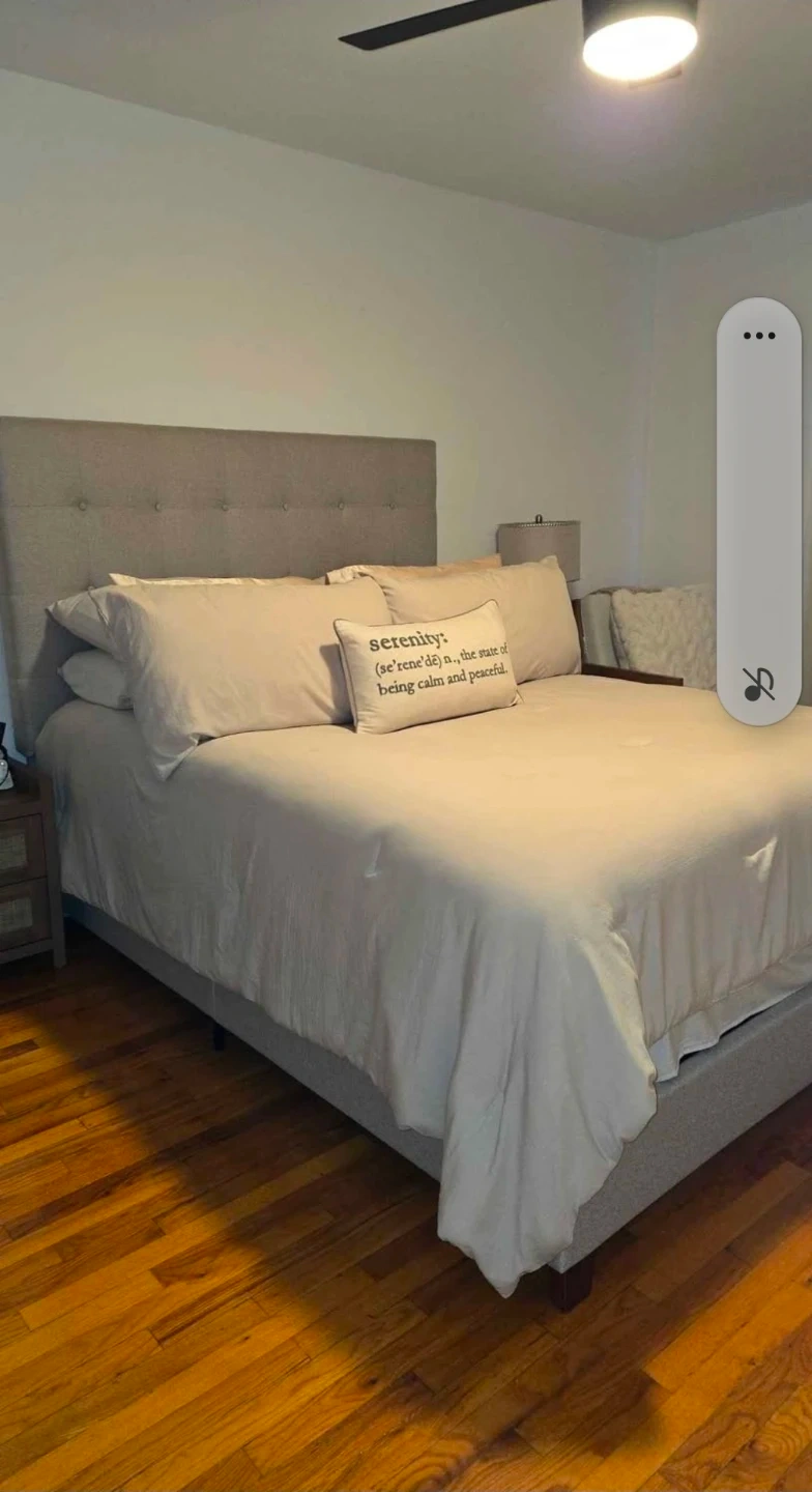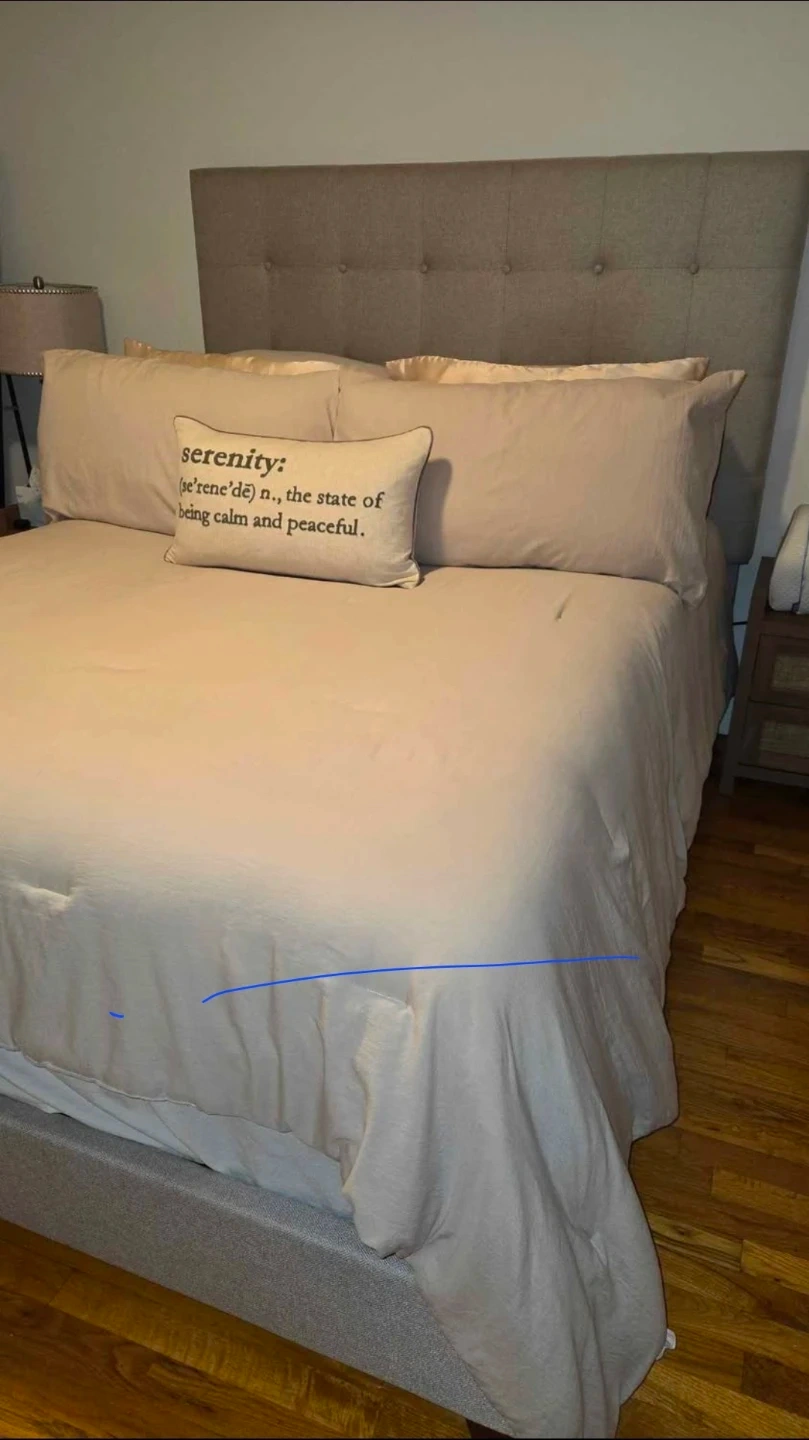 Queen size bed frame. Features a tall, tufted headboard. Upholstered in a neutral, light grey fabric. Sturdy construction.