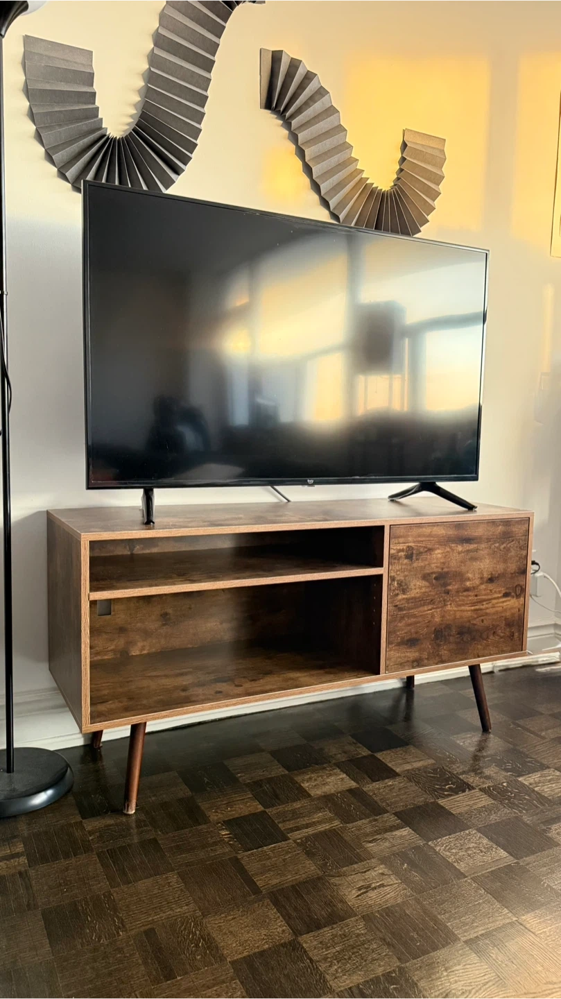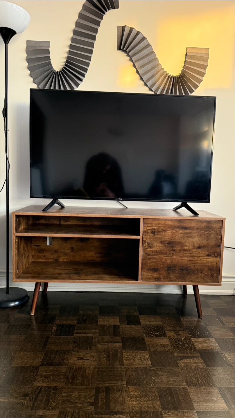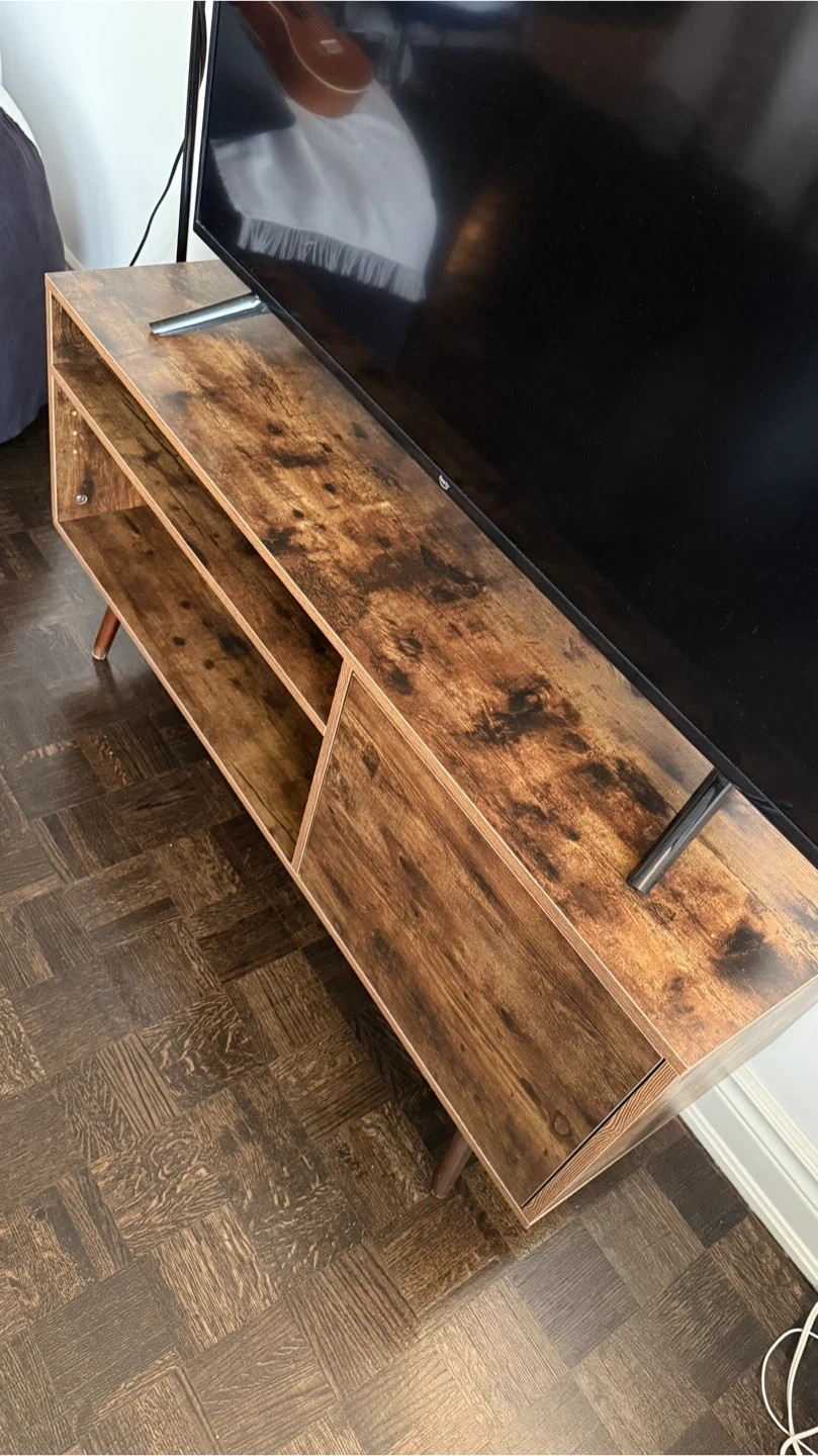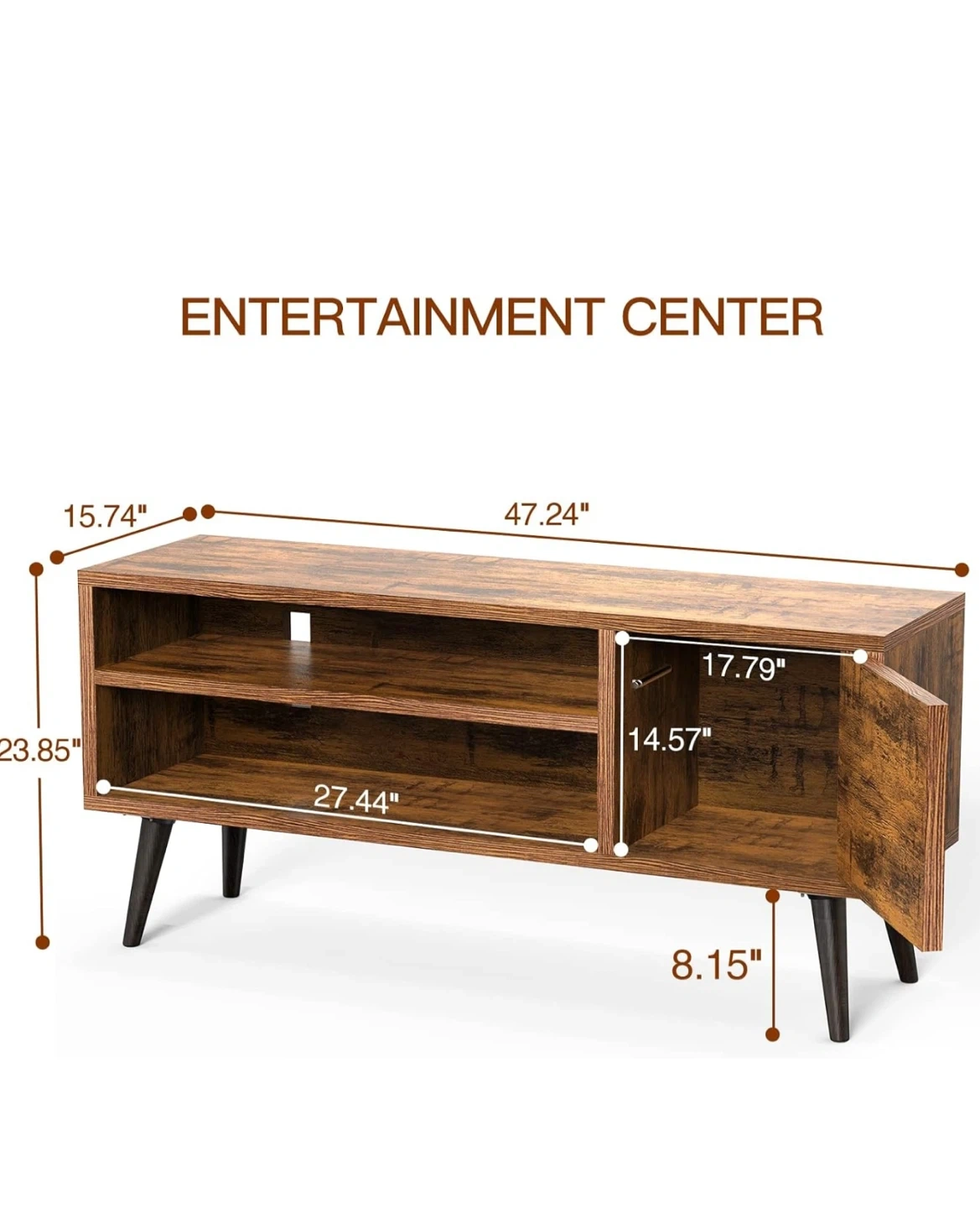 This rustic brown entertainment center is perfect for your living room! It features open shelving and a cabinet for storage. The dimensions are approximately 47.24" x 15.74" x 23.85".
