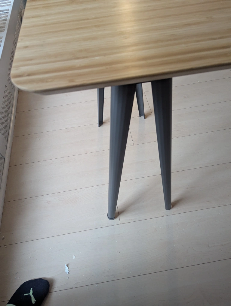 Simple table, great for small spaces. Features a light coloured bamboo top and dark grey metal legs. Lightweight and easy to move.