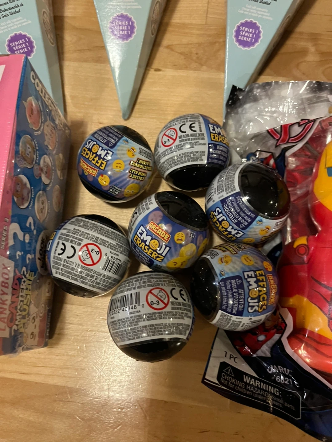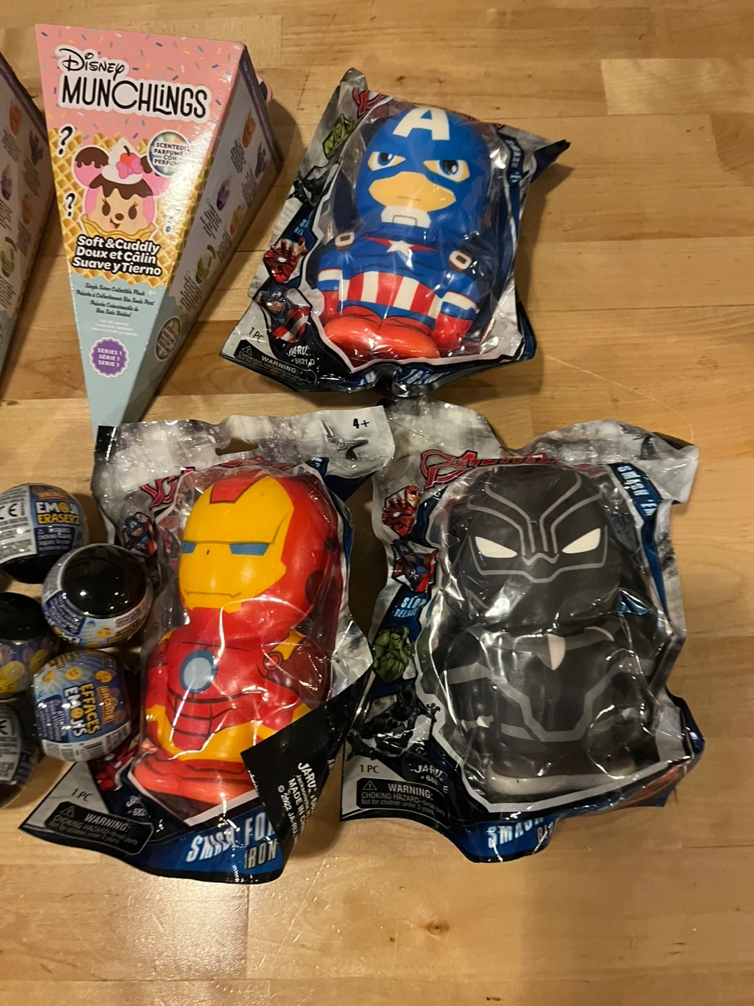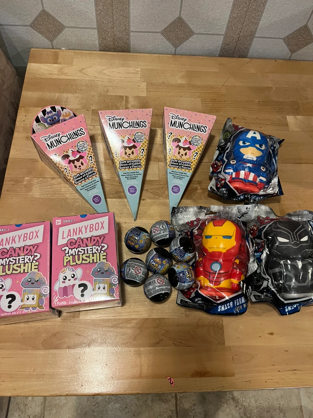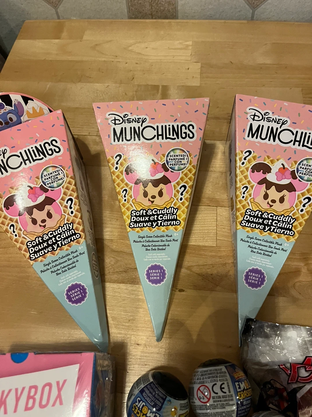Includes three Disney Munchlings Soft & Cuddly plushies, two Lankybox Candy Mystery Plushies, and six Emoji Eraser balls. These collectibles are Series 1 and Series 3. Great for fans of Disney and Lankybox characters! $49 for everything