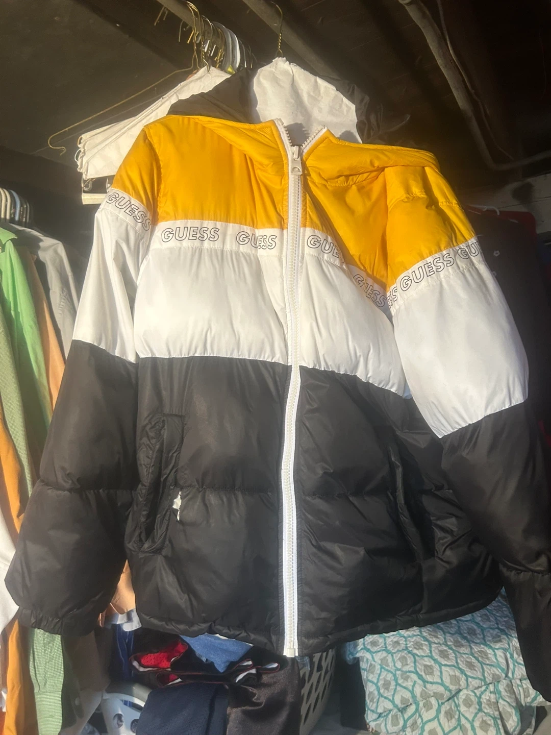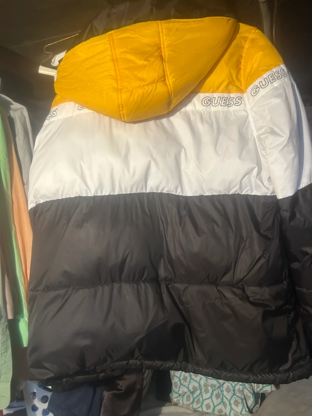This Guess puffer jacket features a color-block design with yellow, white, and black sections. It has a zip-up front and a hood. A cool jacket for cooler weather!