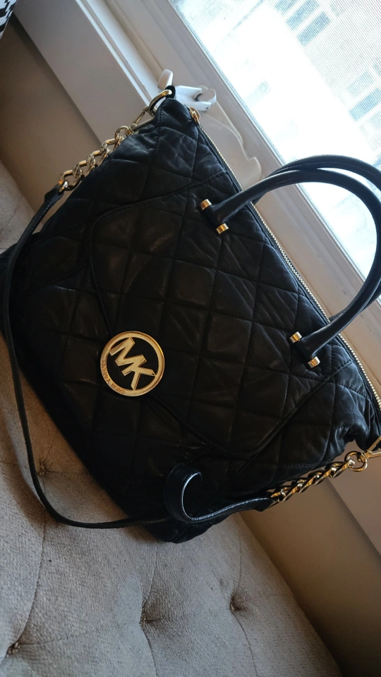 Black quilted super soft calf leather handbag. Features gold-tone hardware, double top handles, and a detachable shoulder strap. Includes a zipper closure and interior pockets. Classic MK logo.