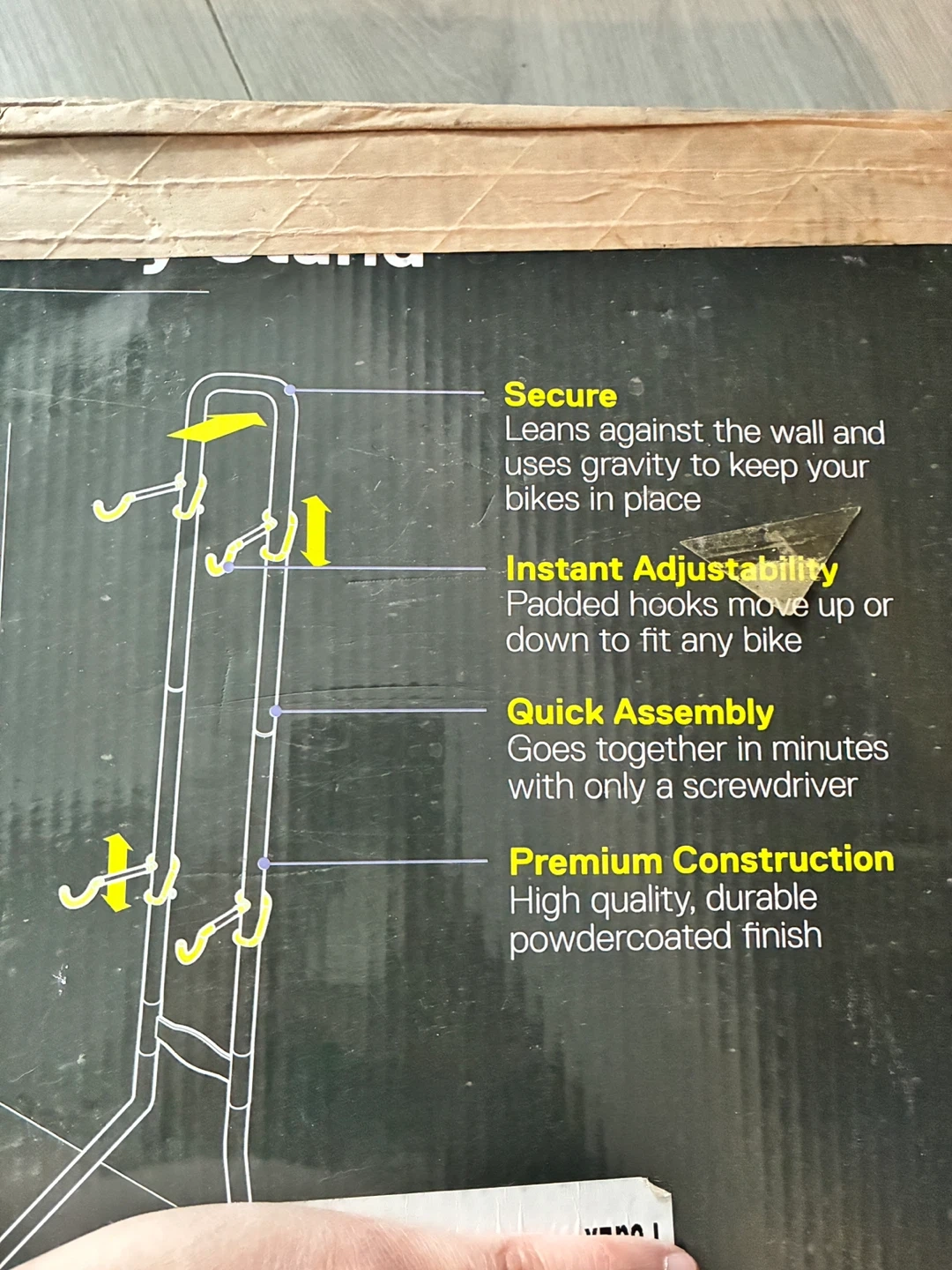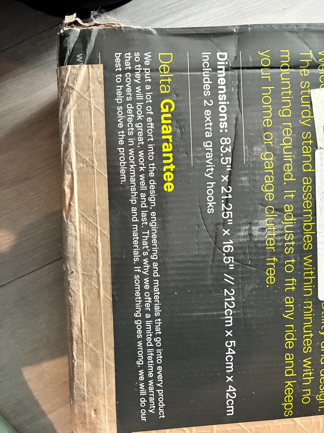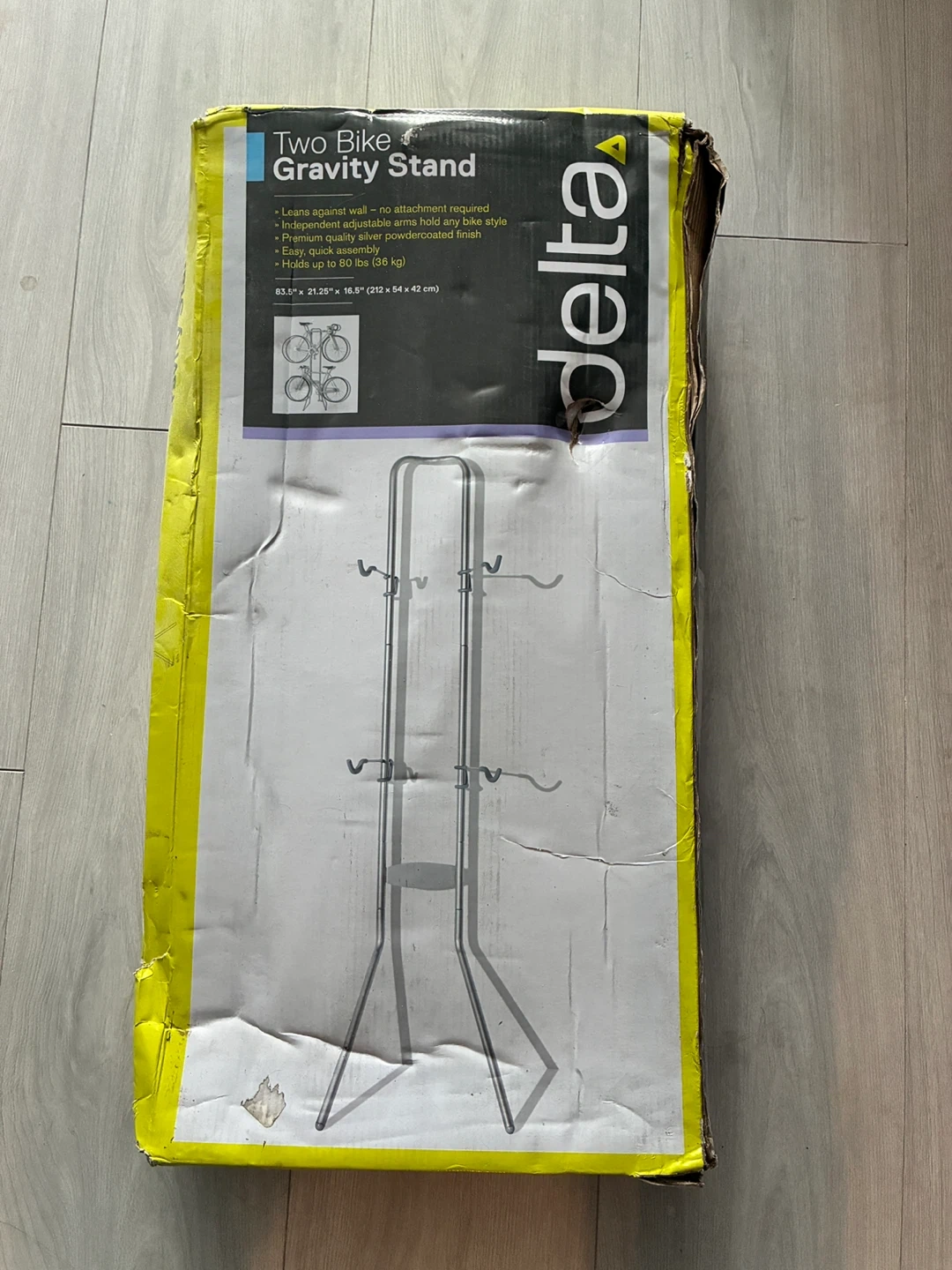 This Delta Two Bike Gravity Stand is designed to lean against your wall and uses gravity to keep your bikes secure. It features instant adjustability with padded hooks that move up or down. Quick assembly goes together in minutes with only a screwdriver. Includes 2 extra gravity hooks. Dimensions: 83.5" x 21.25" x 16.5".