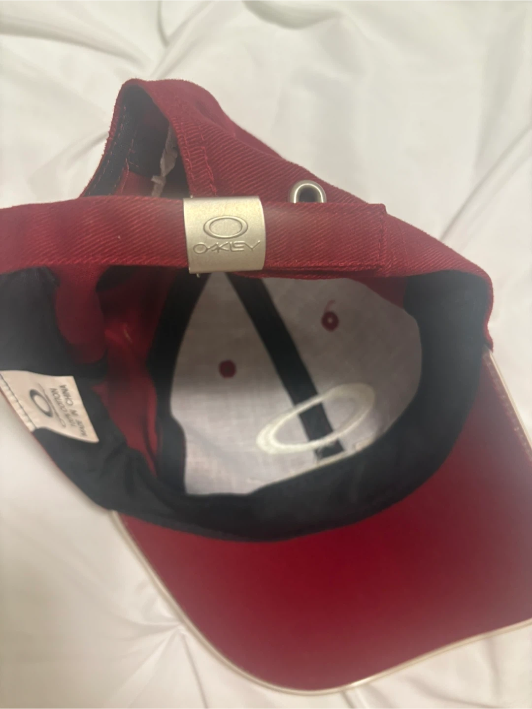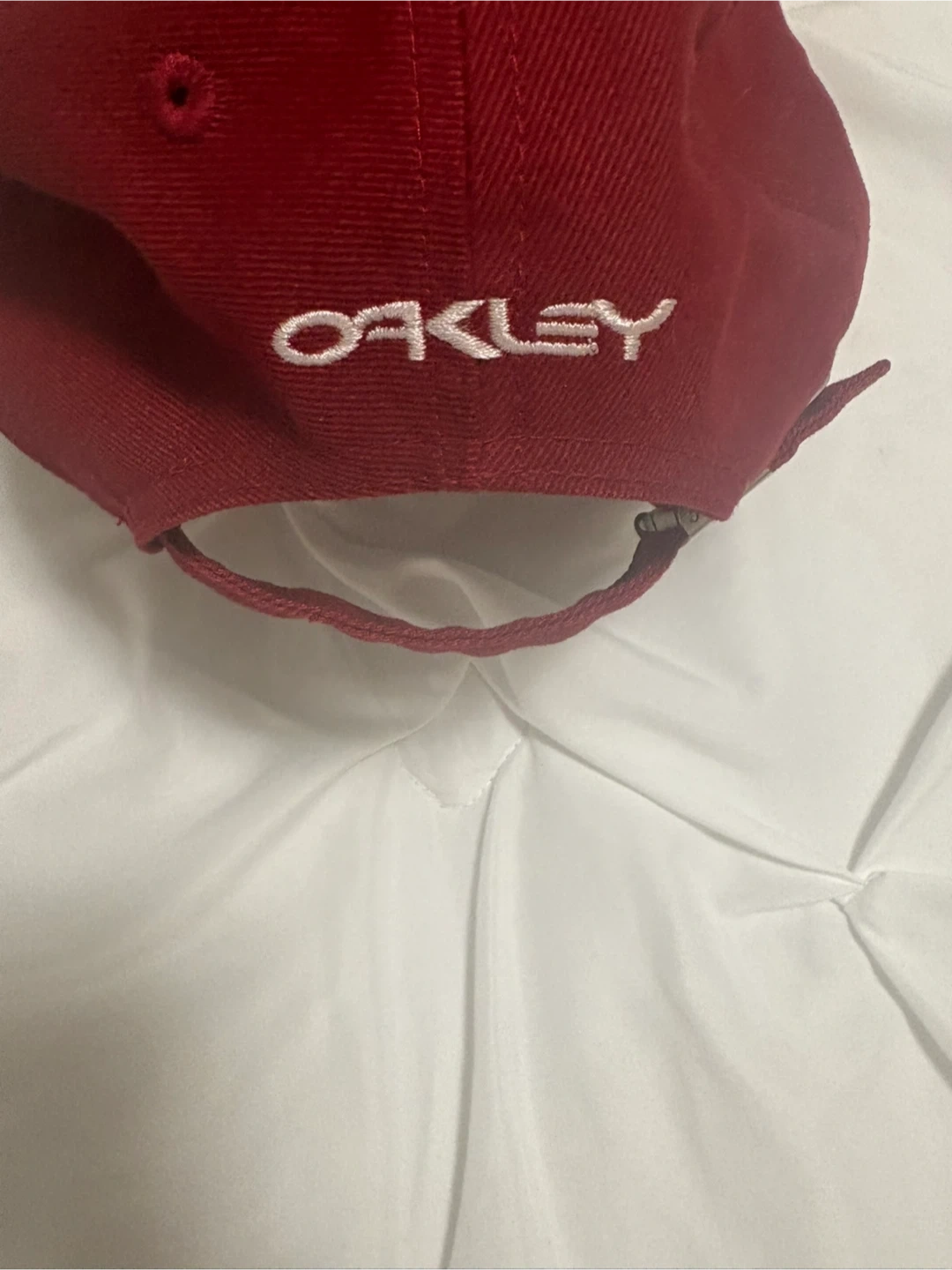 Selling a burgundy Oakley baseball cap! It's in good condition and ready for a new owner. The Oakley logo is embroidered on the front, and 'Okey' is stitched on the side.