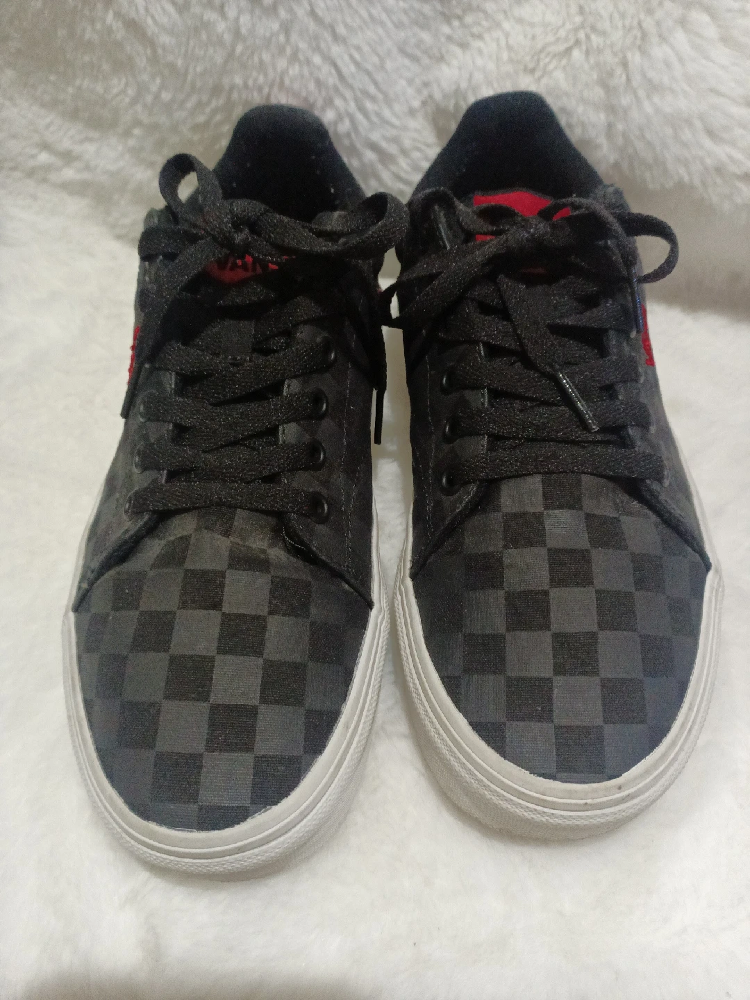 10Selling a pair of Vans sneakers with a cool black checkered pattern! They feature a red accent stripe and the classic Vans logo. These sneakers are in great condition