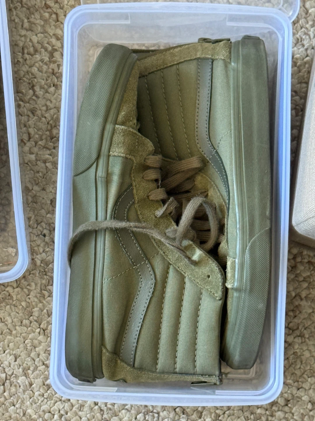 Selling a pair of Vans high-top sneakers in olive green. Barely worn. They are in great condition and ready for a new home!