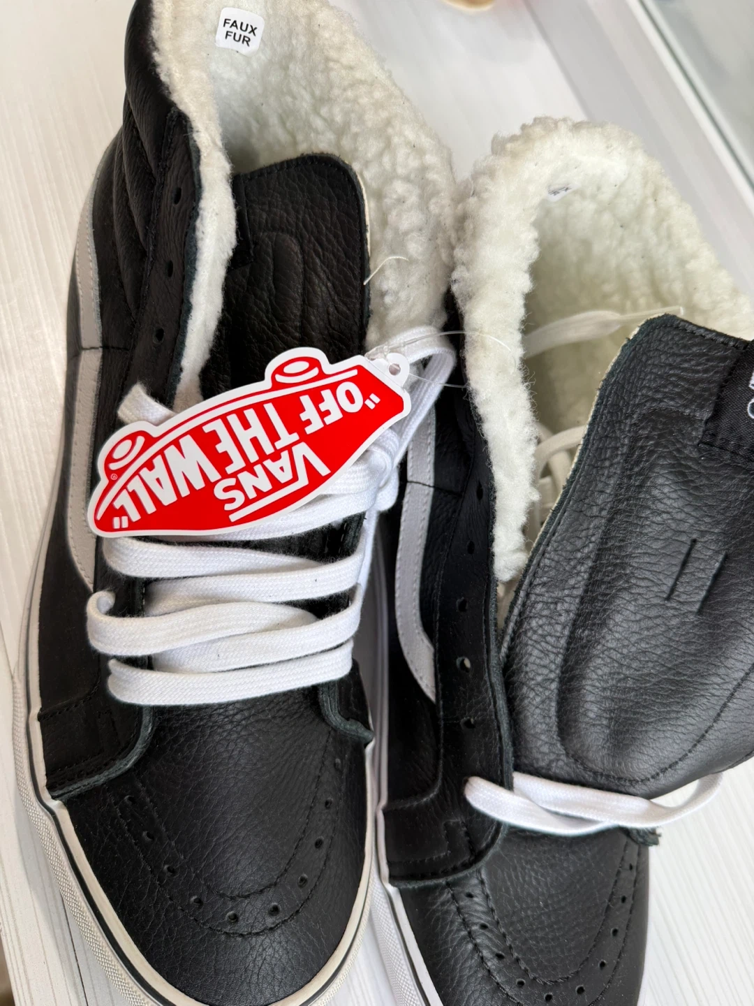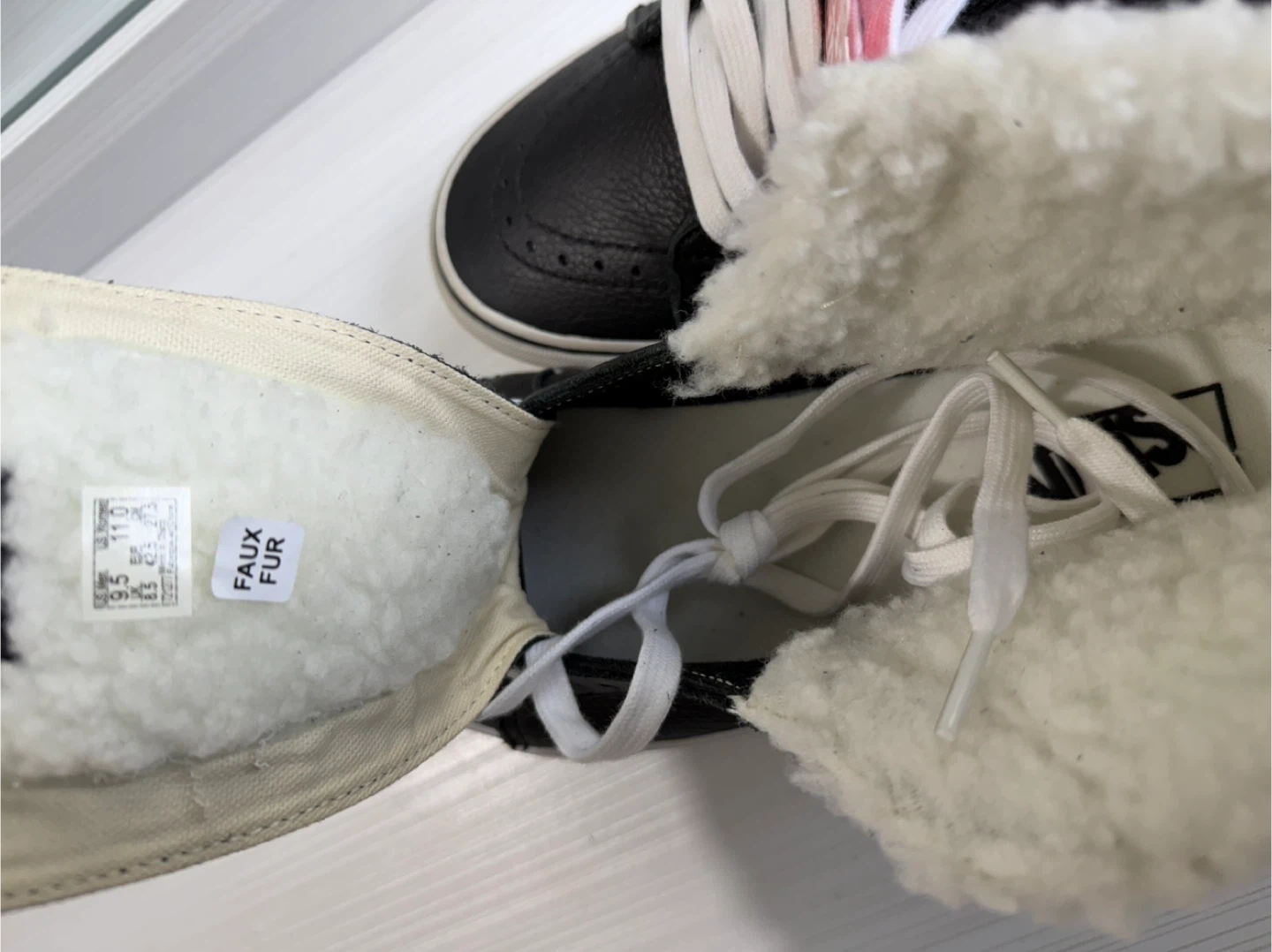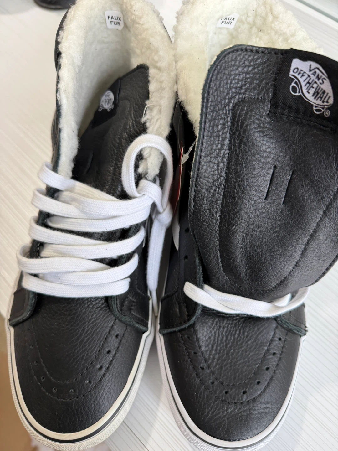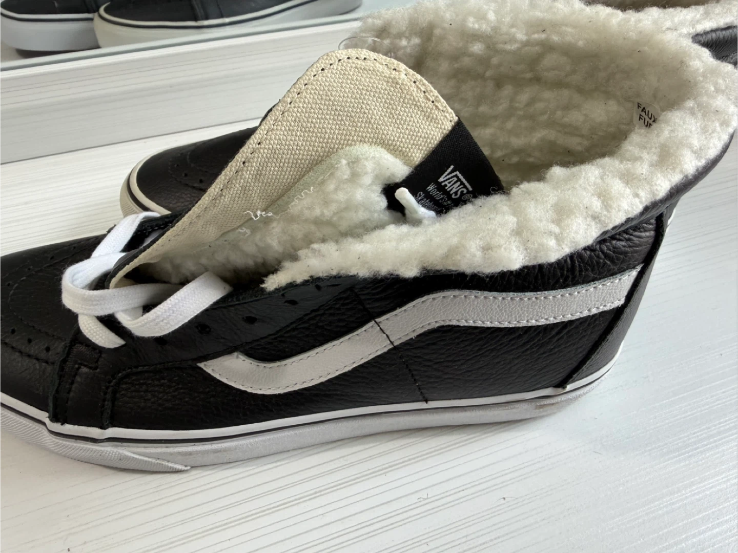 246Selling a pair of Vans Sk8-Hi MTE-2 sneakers. These are black leather with a cozy faux fur lining, perfect for keeping your feet warm! The size is Men's 9.5. They are in great condition and ready for a new home