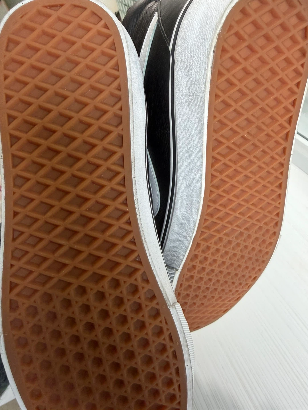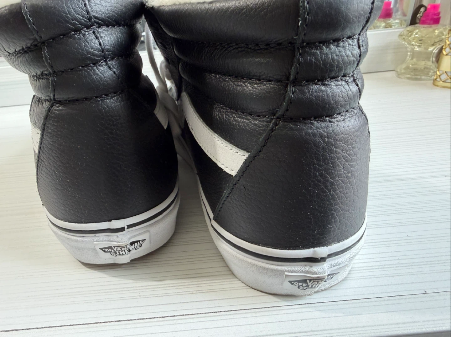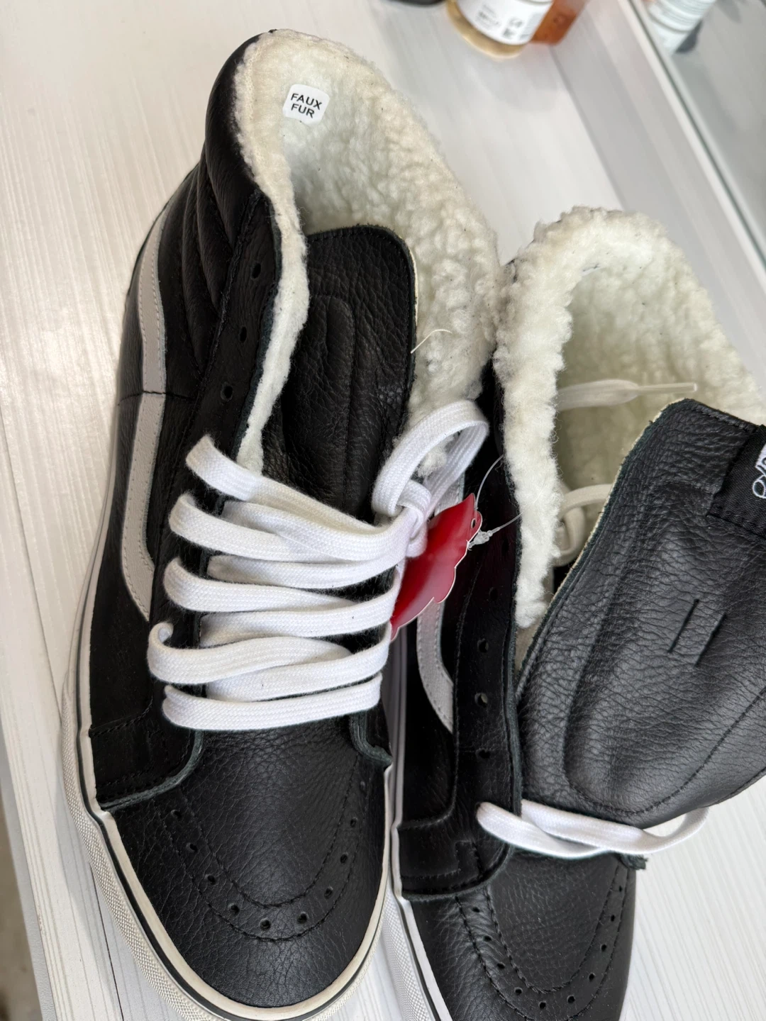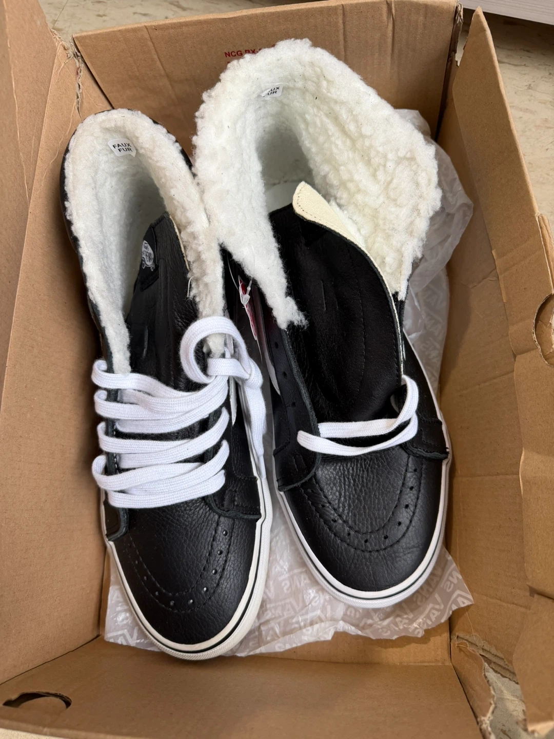 246Selling a pair of Vans Sk8-Hi MTE-2 sneakers. These are black leather with a cozy faux fur lining, perfect for keeping your feet warm! The size is Men's 9.5. They are in great condition and ready for a new home