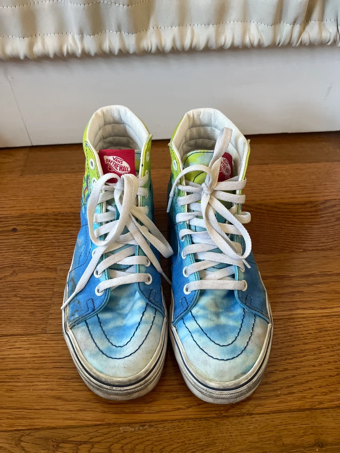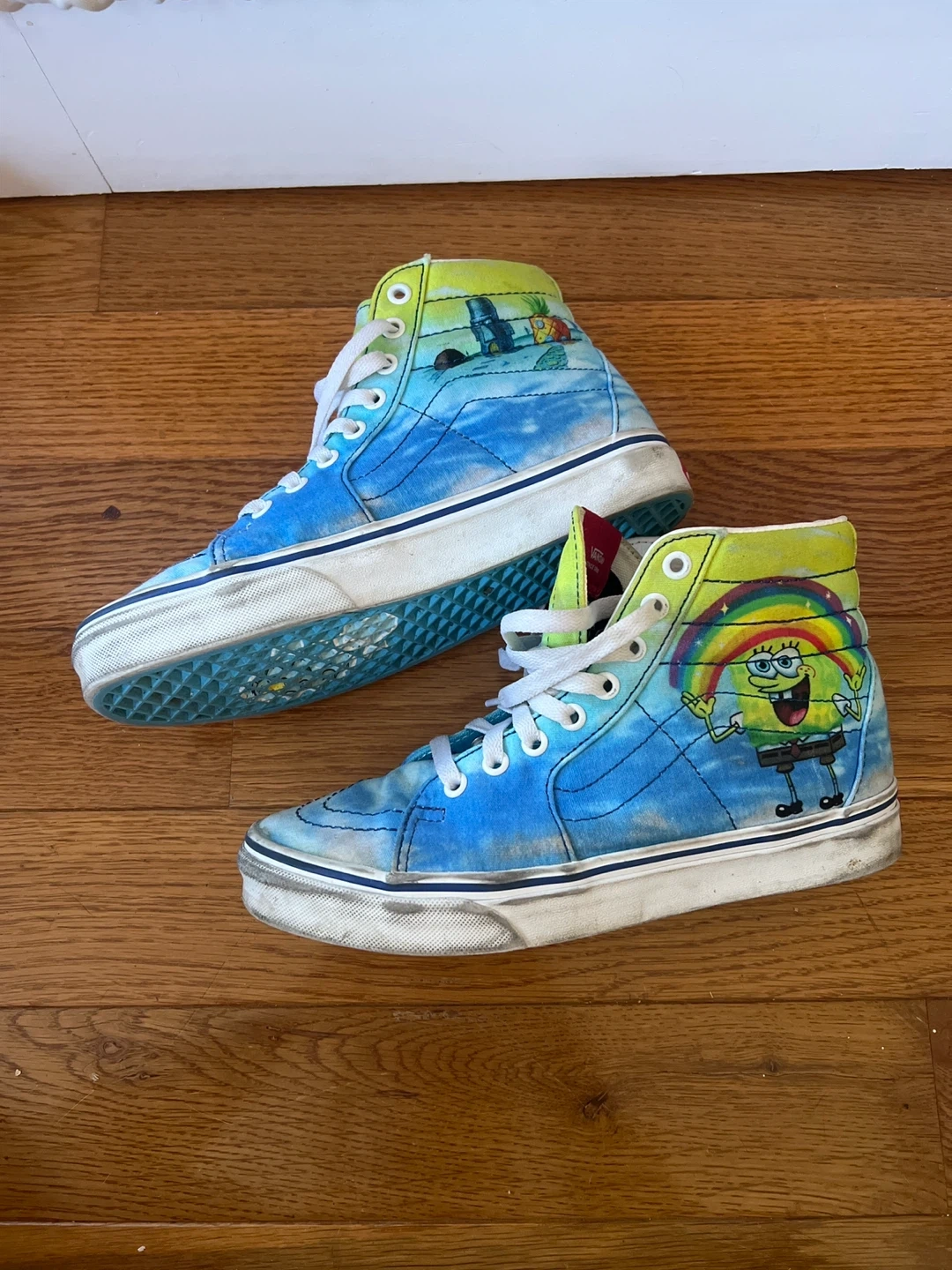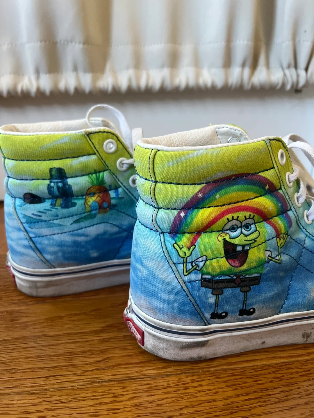 Selling vans sk8-hi high tops featuring the limited edition SpongeBob imagination design. They have been well loved, but have a lot of life left in them!!! They are totally in tact with no tears or fraying, the color is still vibrant, but there are some scuffs along the bottom edge and sole. See photos for condition.