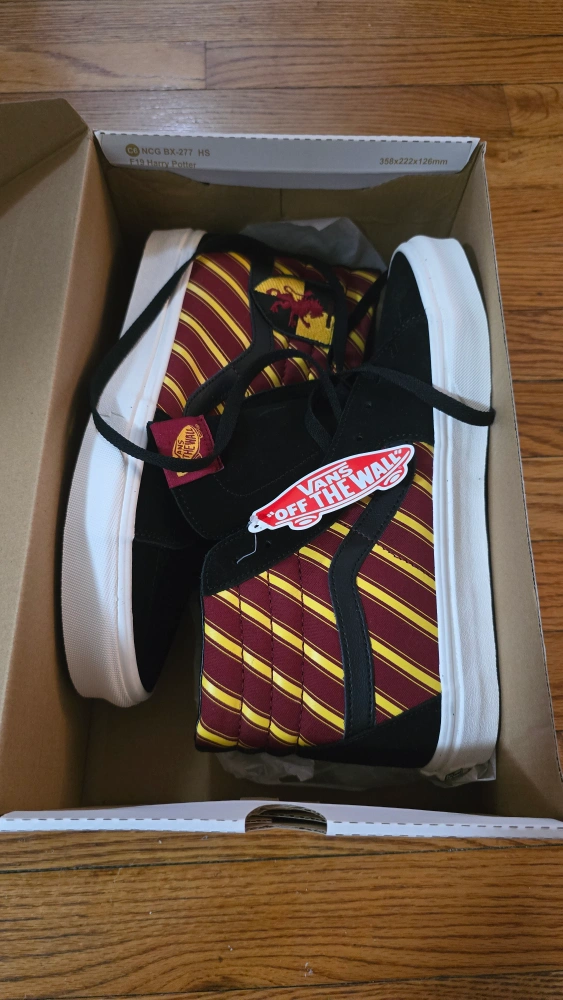 Selling a pair of Vans x Harry Potter Sk8-Hi shoes in the Gryffindor colorway, size 10 US. These are brand new and come with the original box. The shoes feature the Gryffindor colors and crest, making them a must-have for any Harry Potter fan