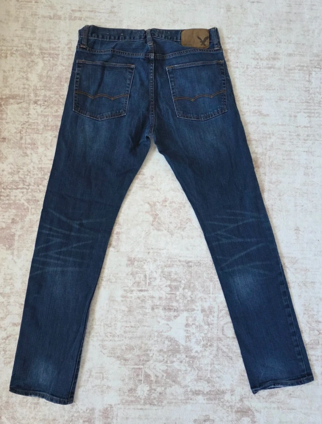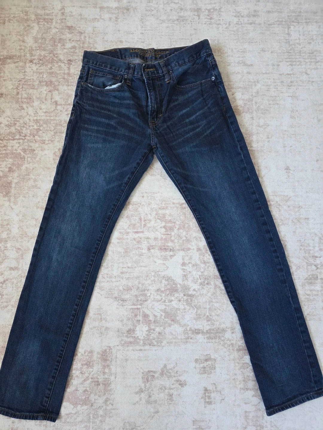 These are American Eagle Outfitters slim fit blue jeans. They're made from denim. The jeans have a classic five-pocket design.