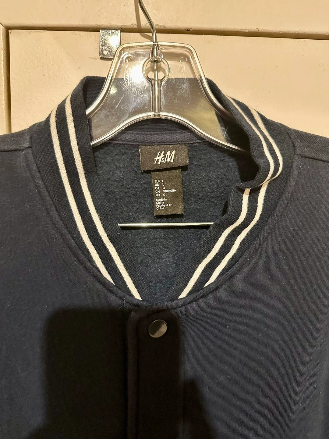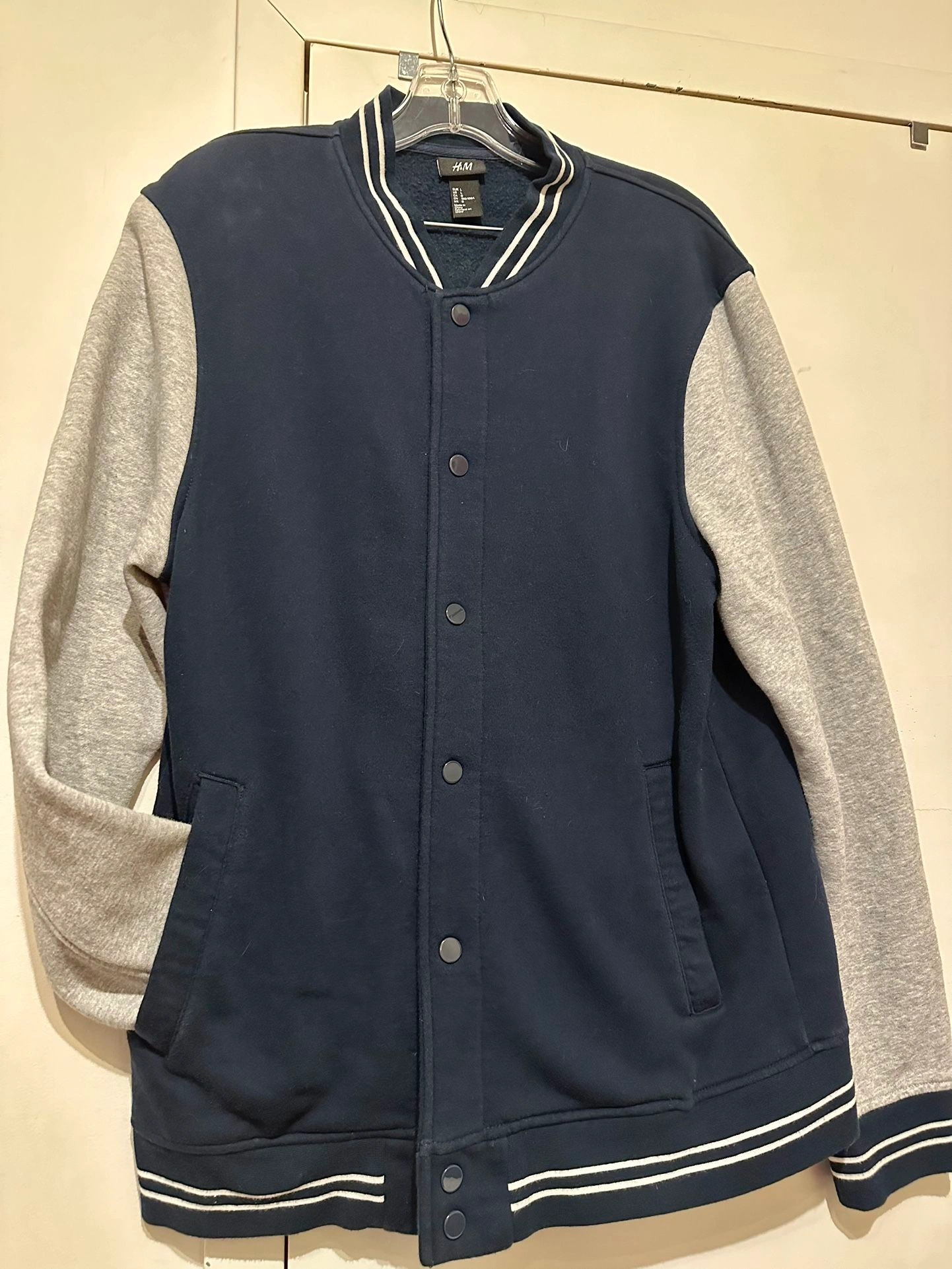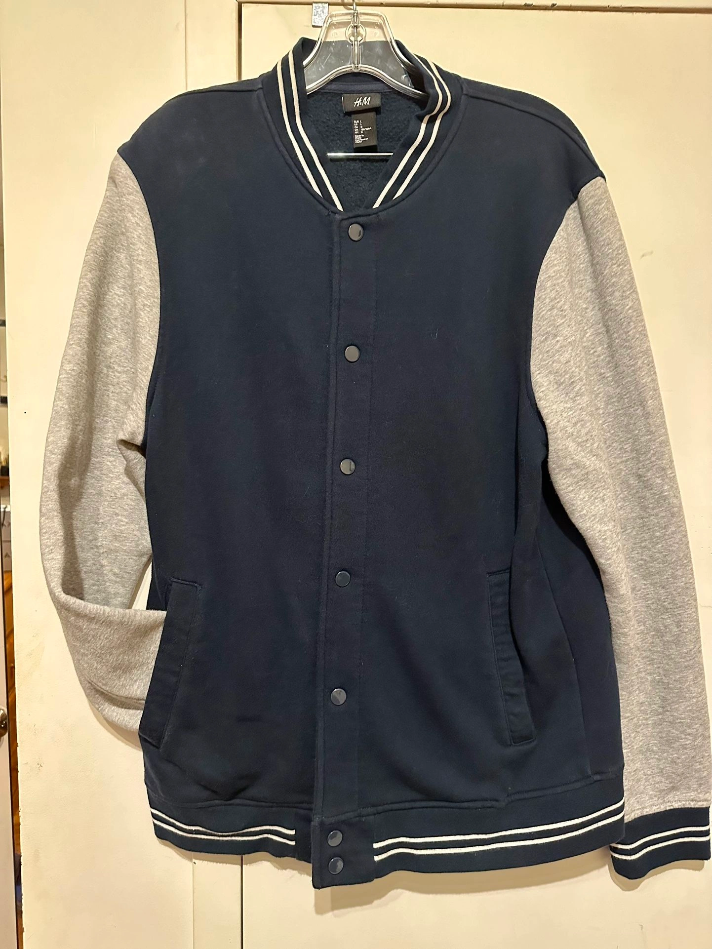 H&M Blue Gray Snap Button Long Sleeve Varsity Jacket. Size Type: Regular, Size: L, Color: Blue, Brand: H & M. Let me know if you're interested!