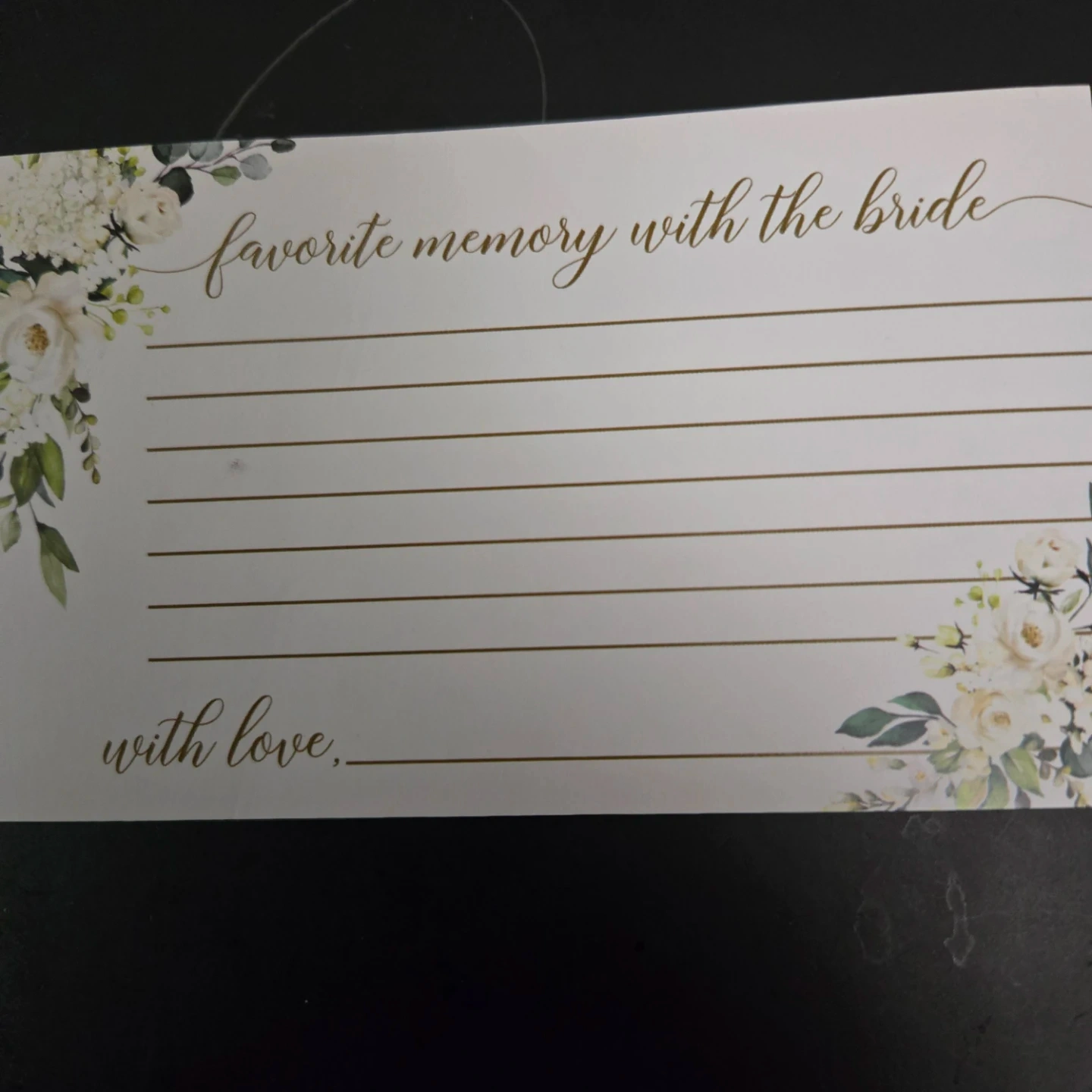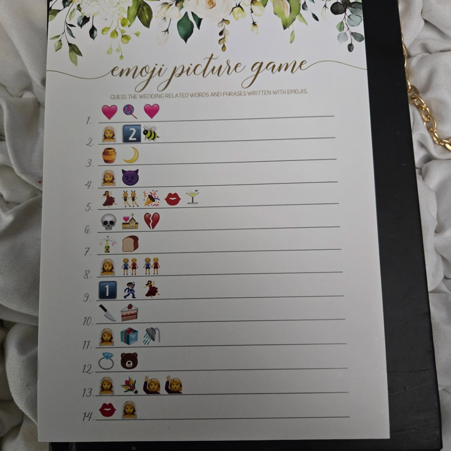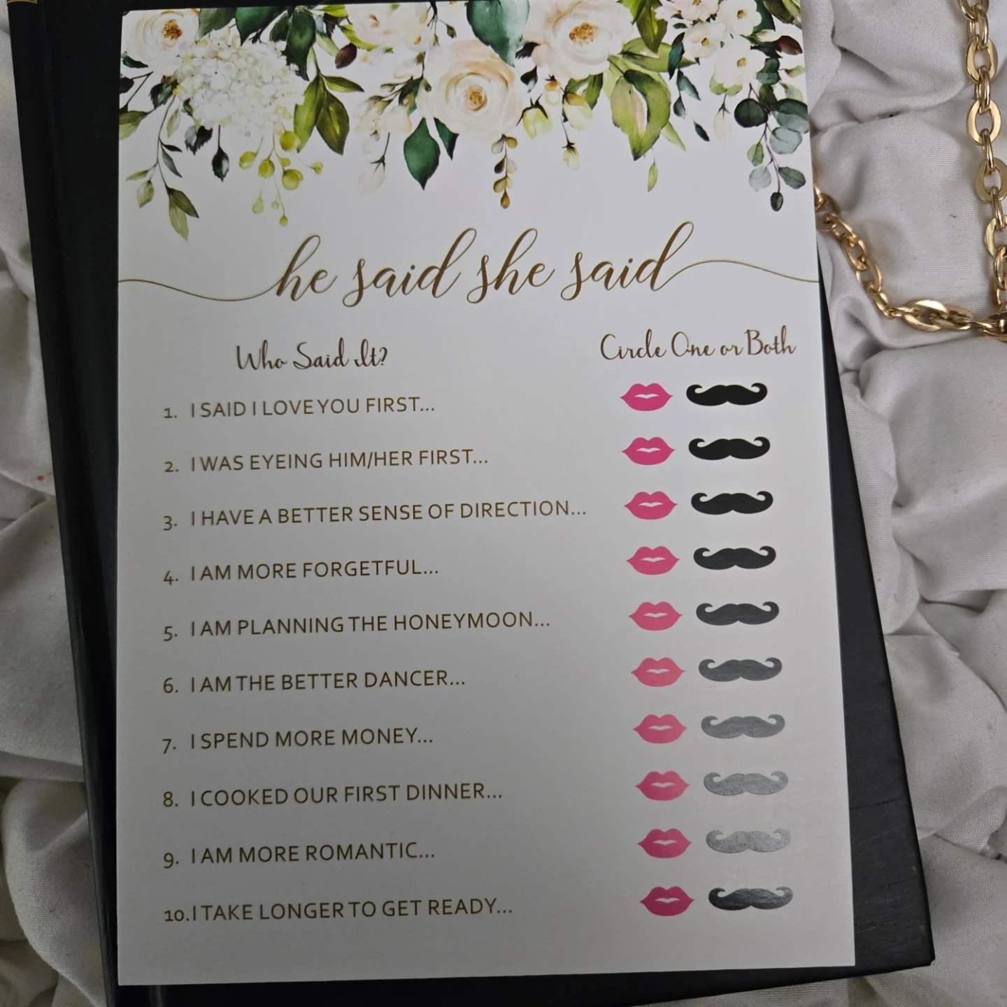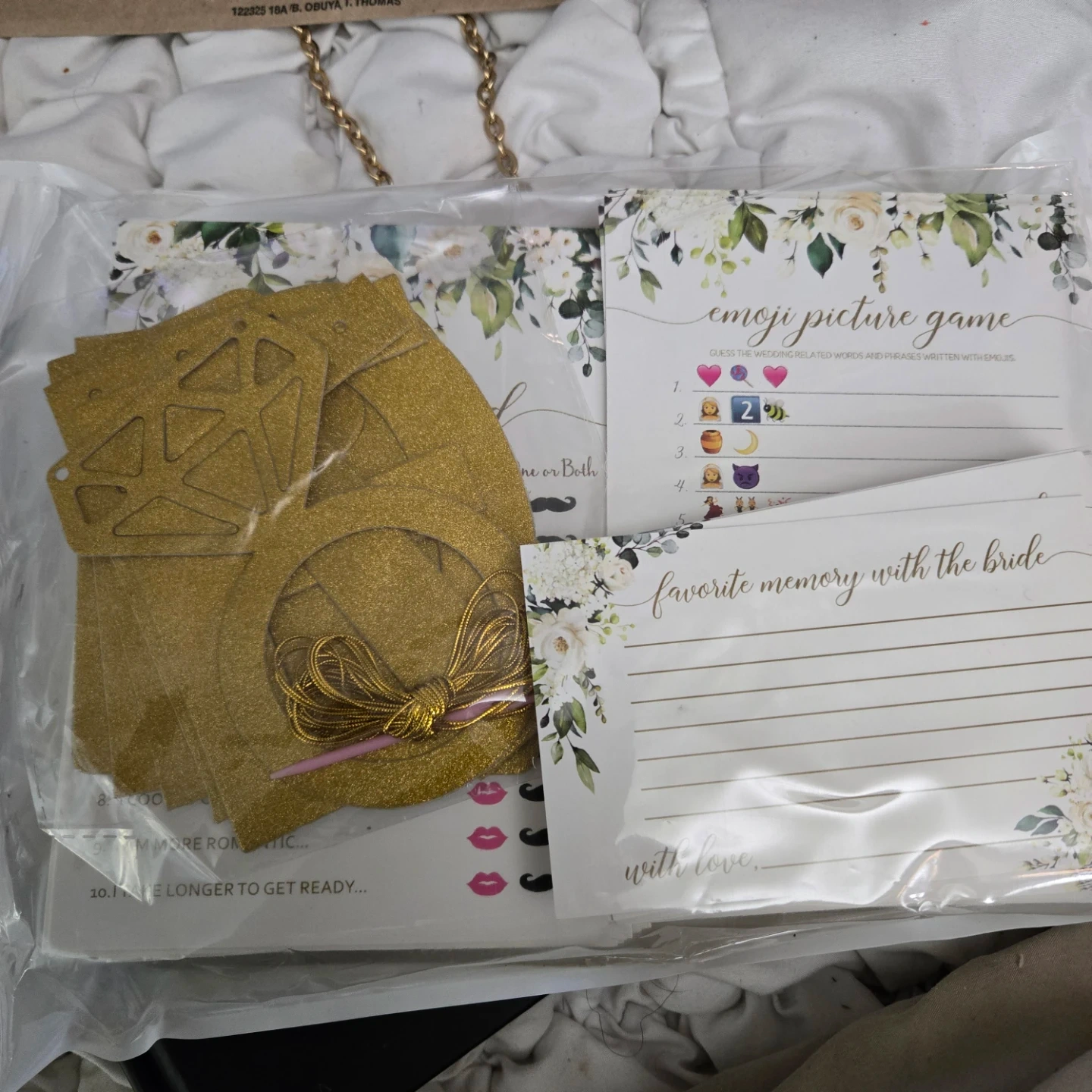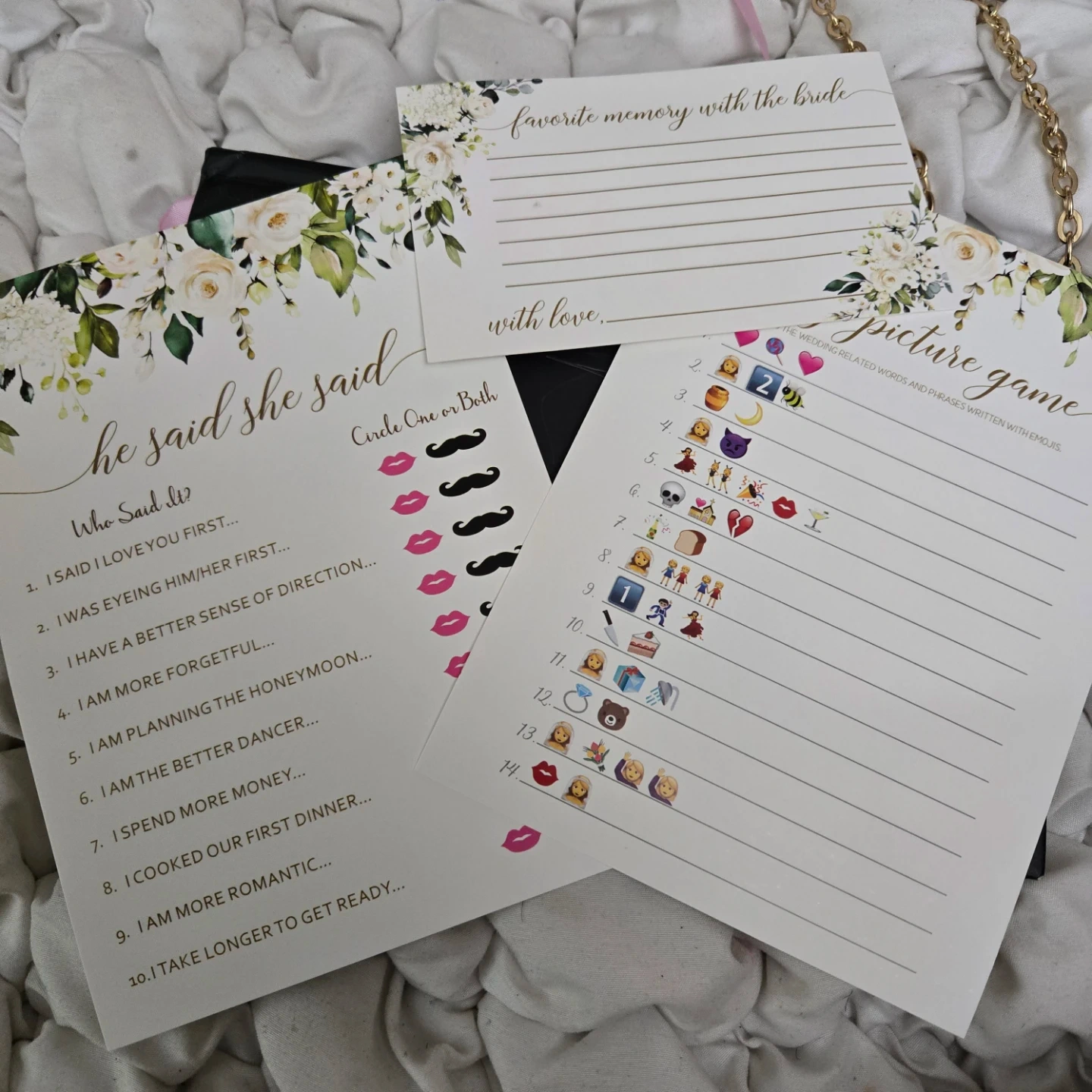 Set includes 'He Said She Said' game cards, 'Emoji Picture Game' cards, and 'Favorite Memory with the Bride' cards. Also includes a gold glitter banner with string. Great for bridal showers!