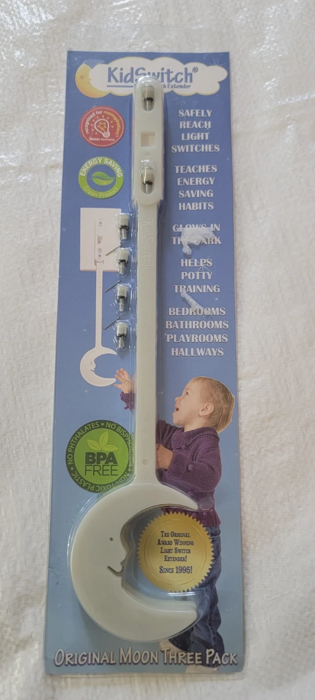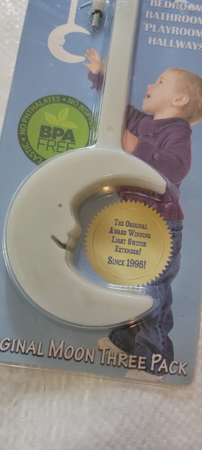 This is a KidSwitch Original Moon Three Pack light switch extender. It's BPA-free and helps kids safely reach light switches. Teach energy-saving habits with this award-winning extender, perfect for bedrooms, bathrooms, and playrooms!