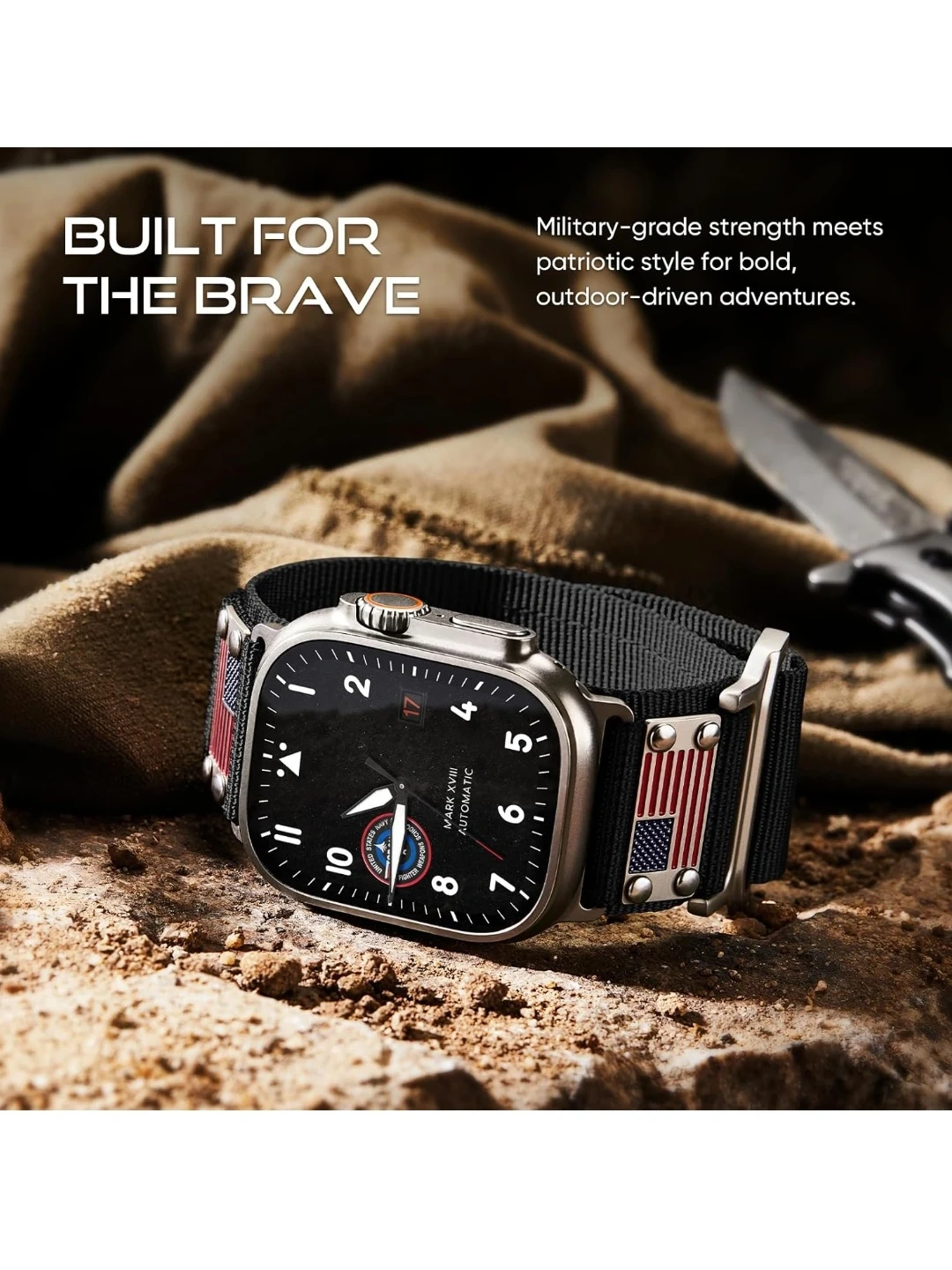 Rugged. Sturdy: Our Apple Watch Ultra 3 band features a durable stainless steel metal connector and shield logo with flag pattern, showcasing a man's bravery and strength. The 30mm ultra-wild Apple Watch Ultra band is a tailored match for any bold soul.