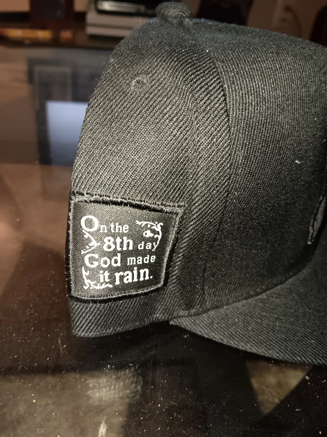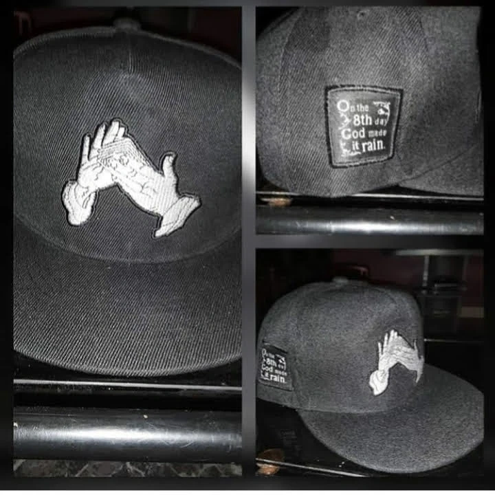 This black snapback hat features an embroidered design of praying hands on the front. A patch on the side reads 'On the 8th day God made it rain.'. Cotton blend material.
