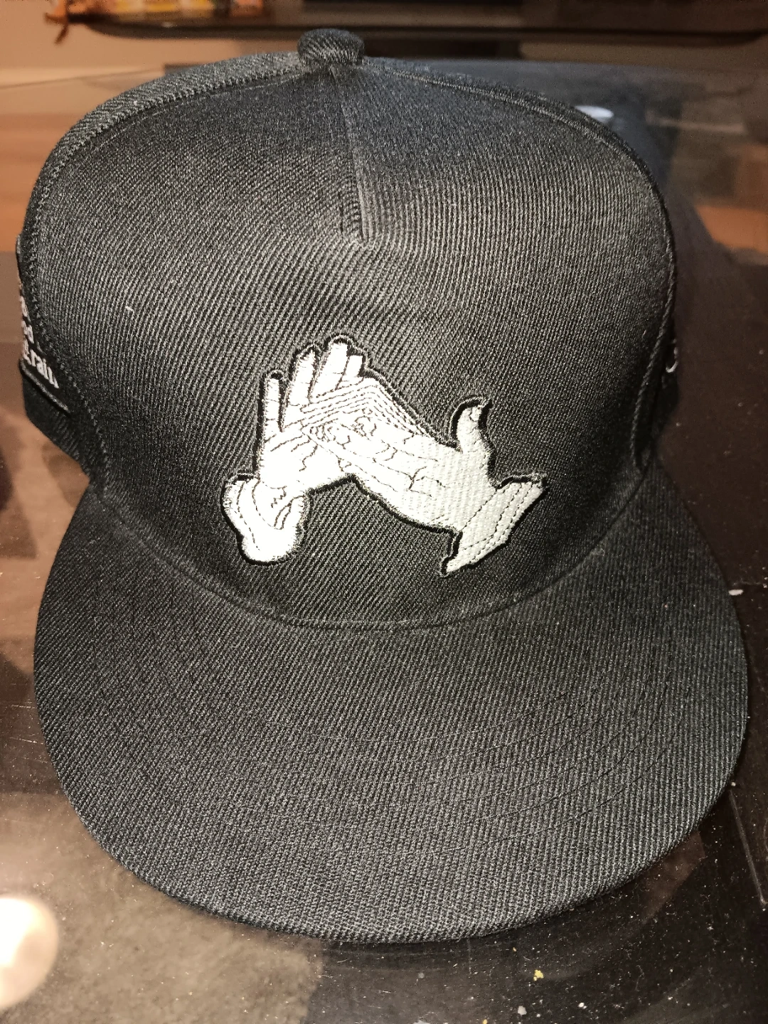 Black Snapback Hat with Embroidered Hands and Text