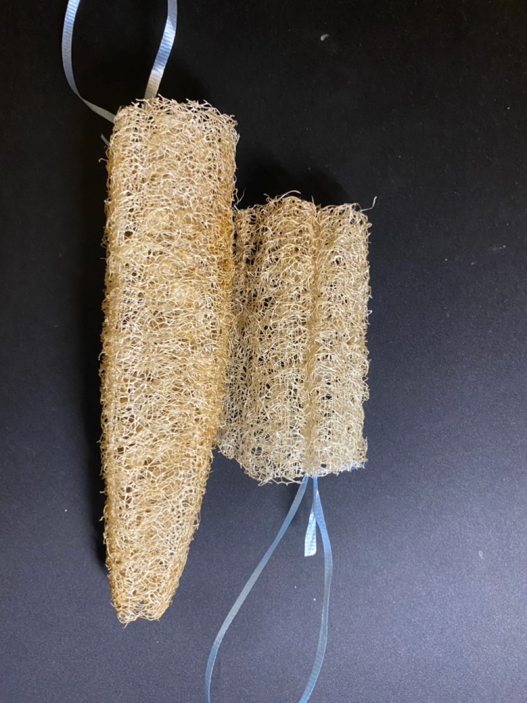 Two natural loofahs, different sizes. Each tied with a light blue ribbon. Great for bath or spa. These were homegrown in my garden.