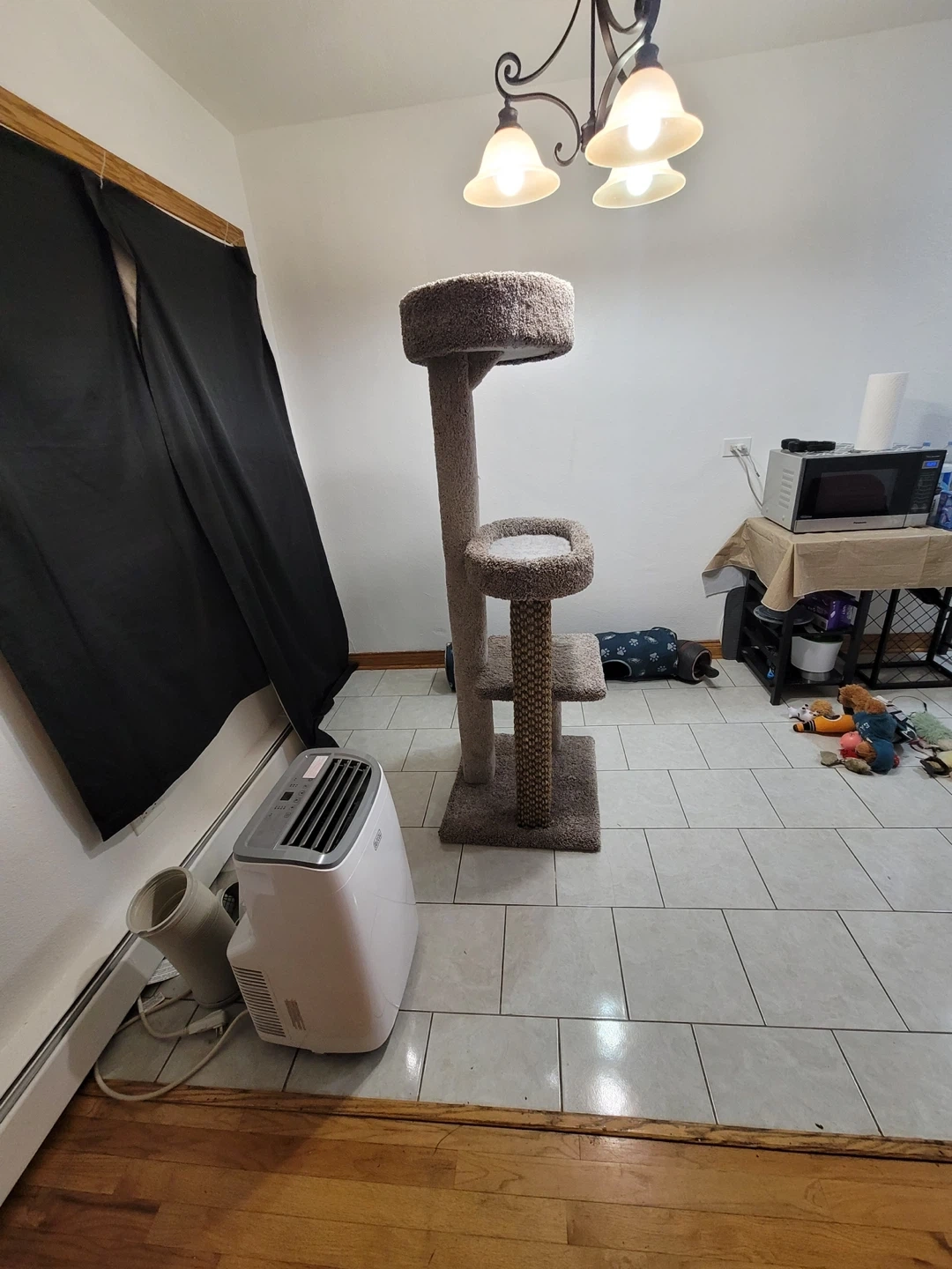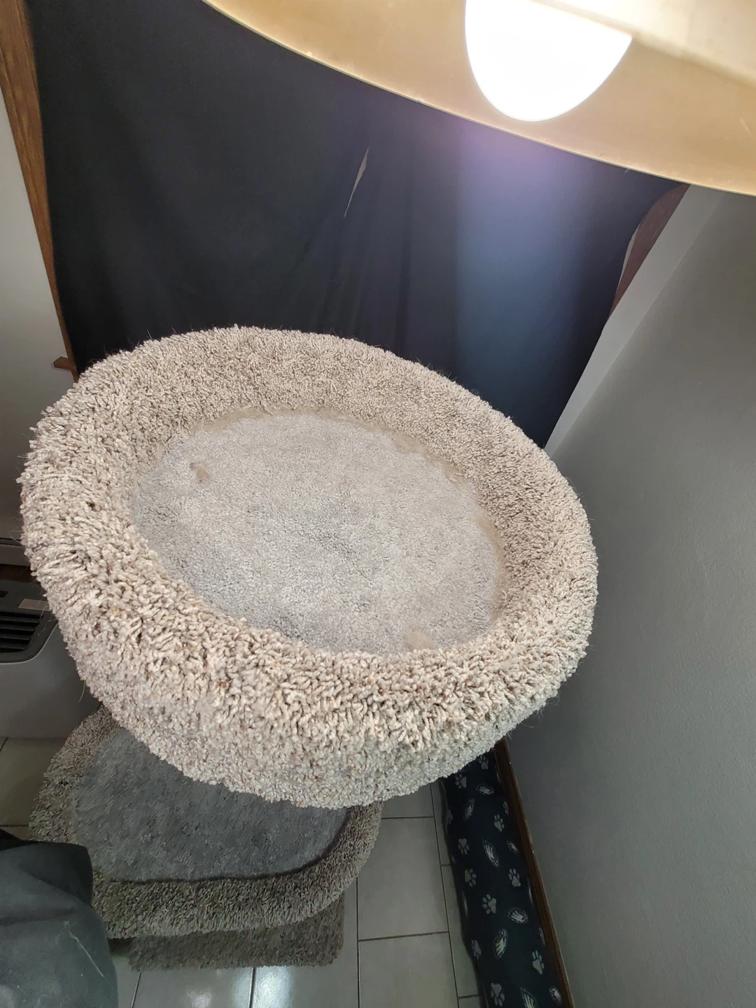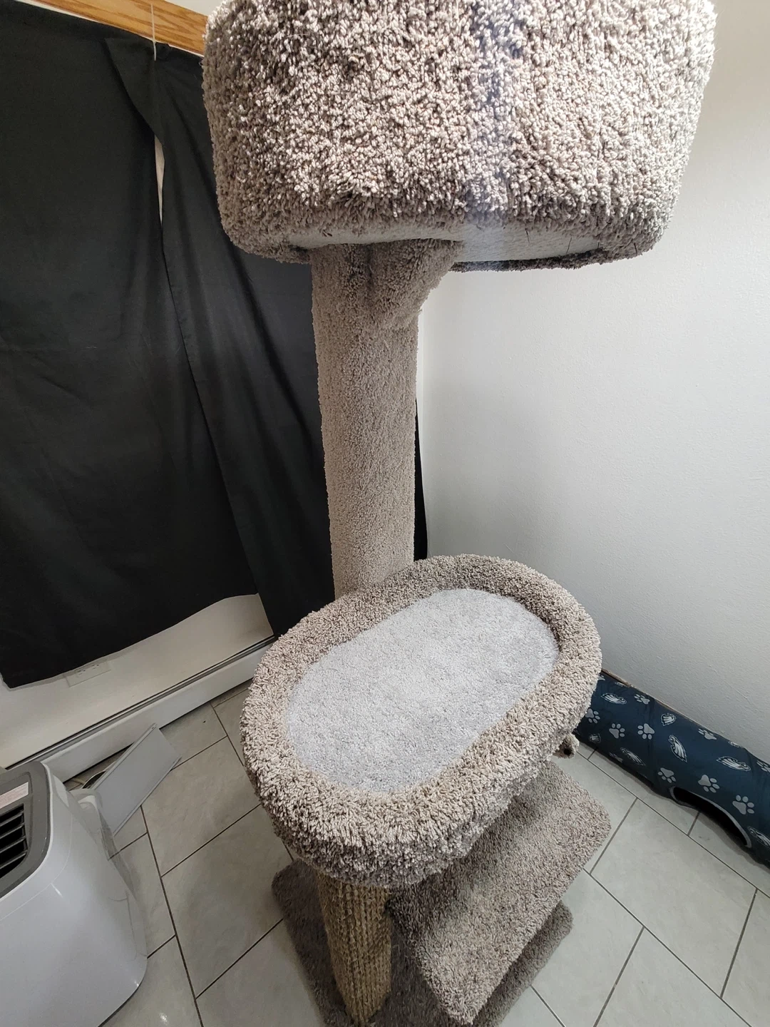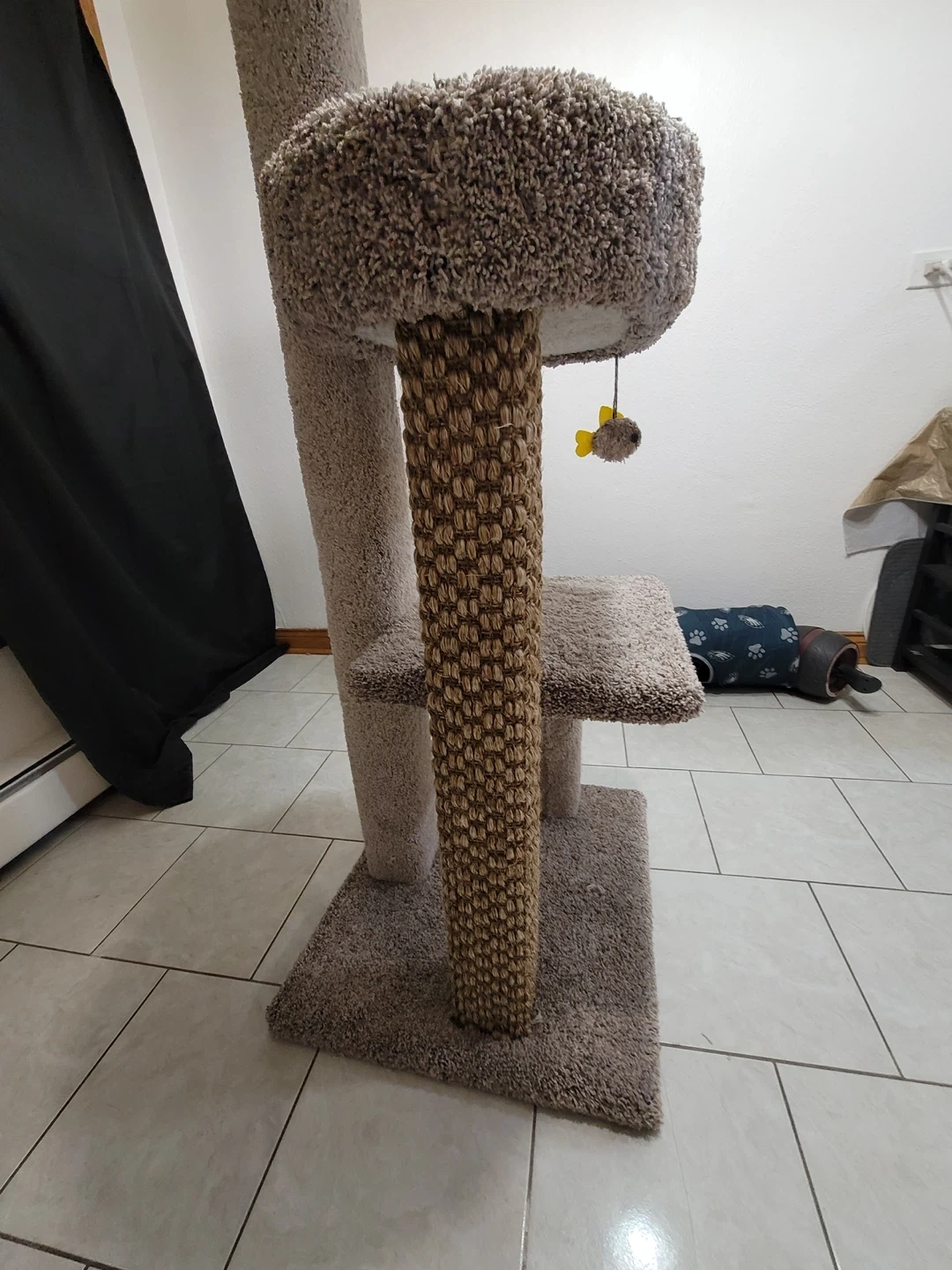 Up for sale is this barely used cat tree. We bought two originally but our kitties now live together at my fiancée’s home. We no longer need this one. Really tall and sturdy. It is a great value, that’s why we got two. This multi-level cat tree condo tower provides a fun and engaging space for your feline friends. It features plush carpeting for comfort and scratching posts for their natural instincts. It's stable and sturdy, offering vertical space for climbing and lounging. Measures 65” in height and 2’ x 2’ ft at the base. Feel free to contact us with questions. Easy local pickup location by midway airport. Thank you.