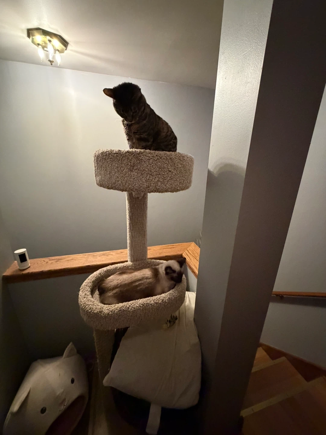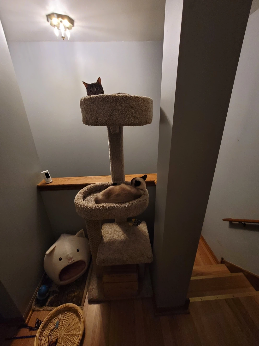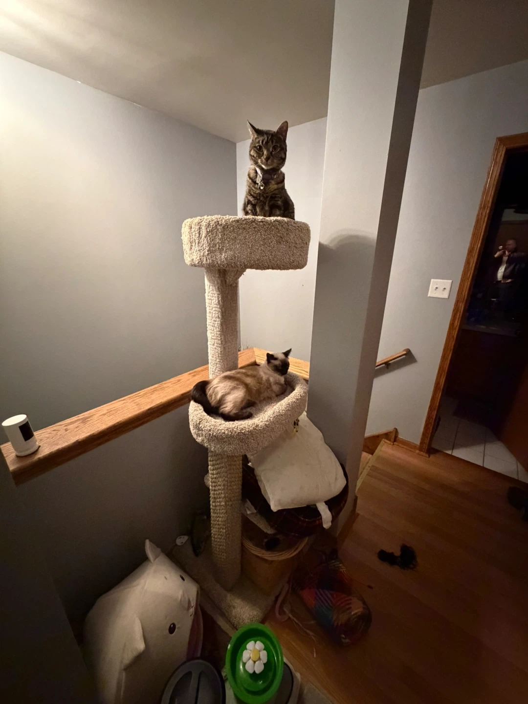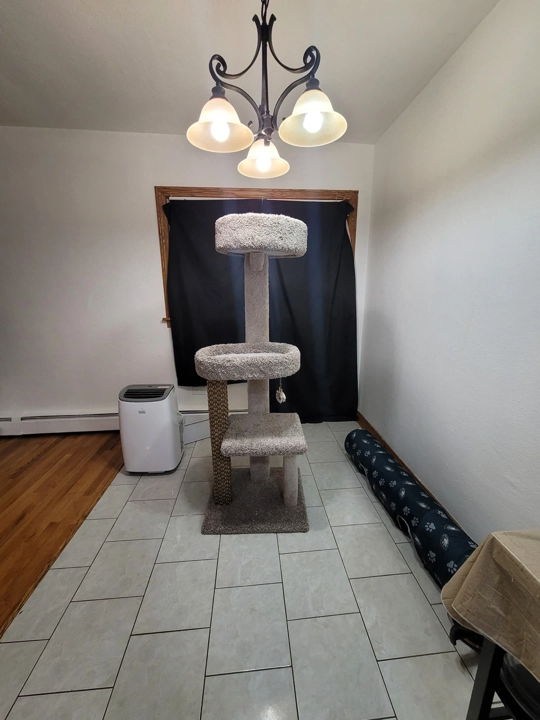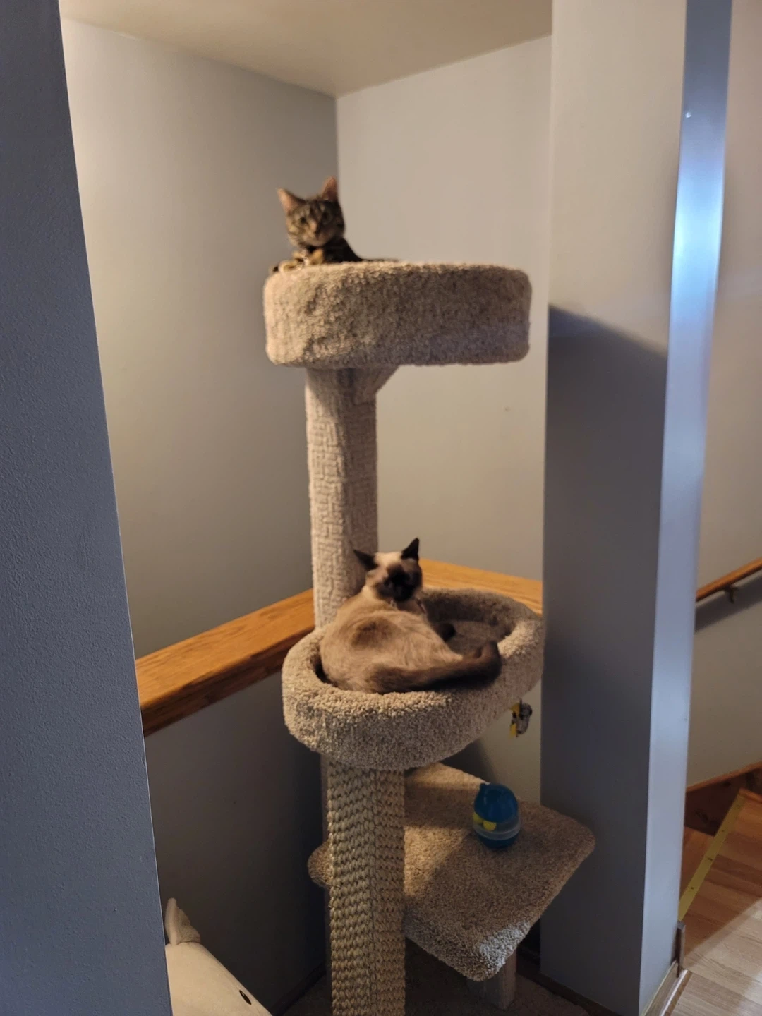 Up for sale is this barely used cat tree. We bought two originally but our kitties now live together at my fiancée’s home. We no longer need this one. Really tall and sturdy. It is a great value, that’s why we got two. This multi-level cat tree condo tower provides a fun and engaging space for your feline friends. It features plush carpeting for comfort and scratching posts for their natural instincts. It's stable and sturdy, offering vertical space for climbing and lounging. Measures 65” in height and 2’ x 2’ ft at the base. Feel free to contact us with questions. Easy local pickup location by midway airport. Thank you.