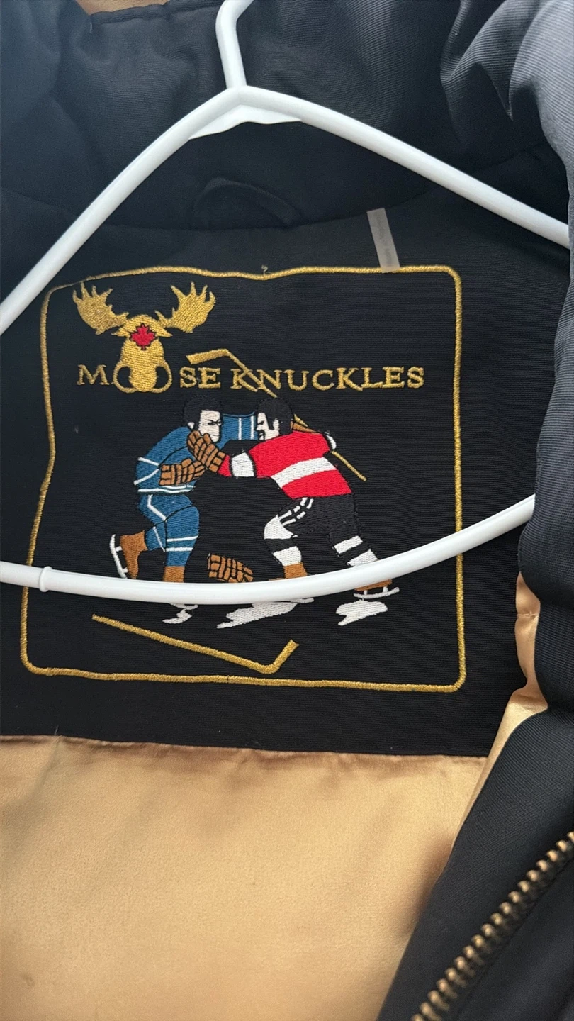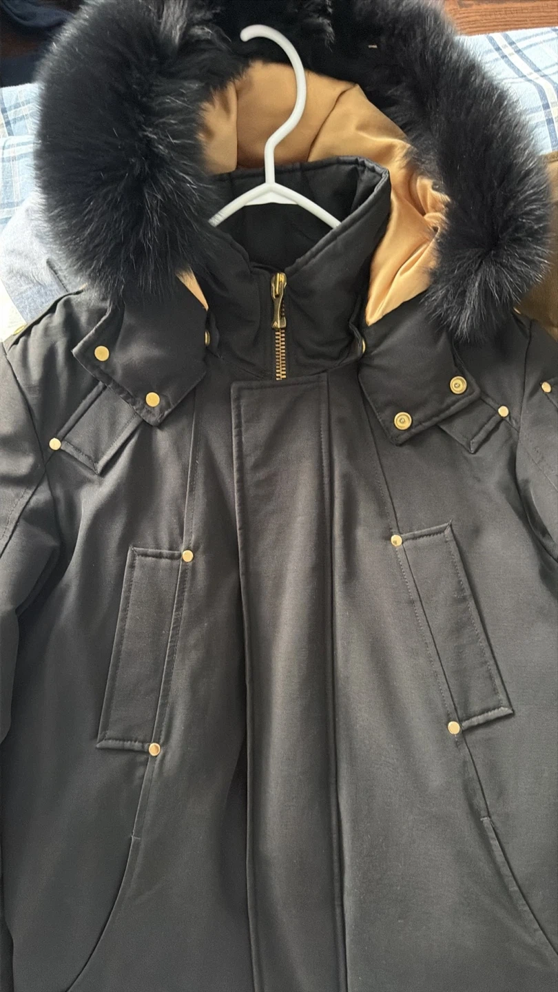 This real and authentic black Moose Knuckles bomber jacket is built for the cold. It features a signature embroidered patch on the chest and a luxurious fur-lined hood. It's warm and stylish for winter weather!