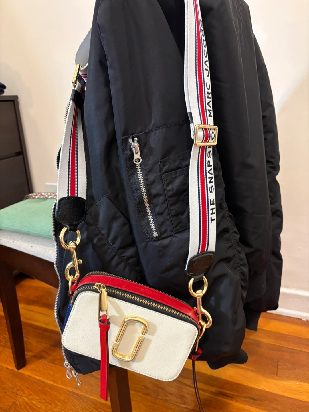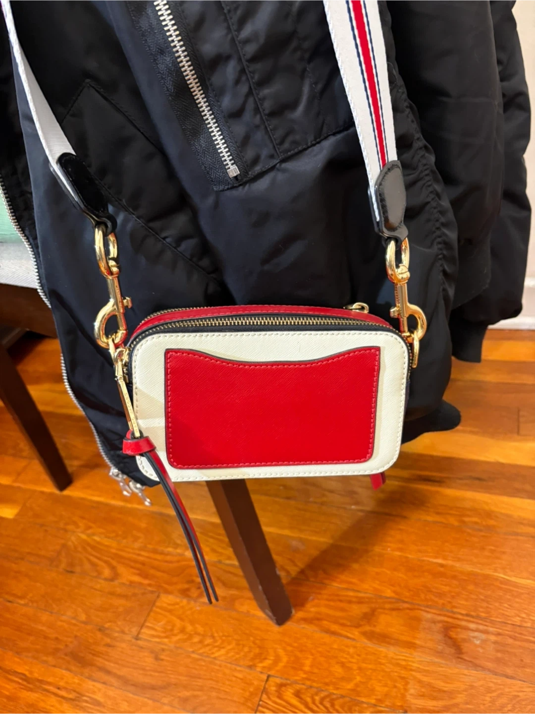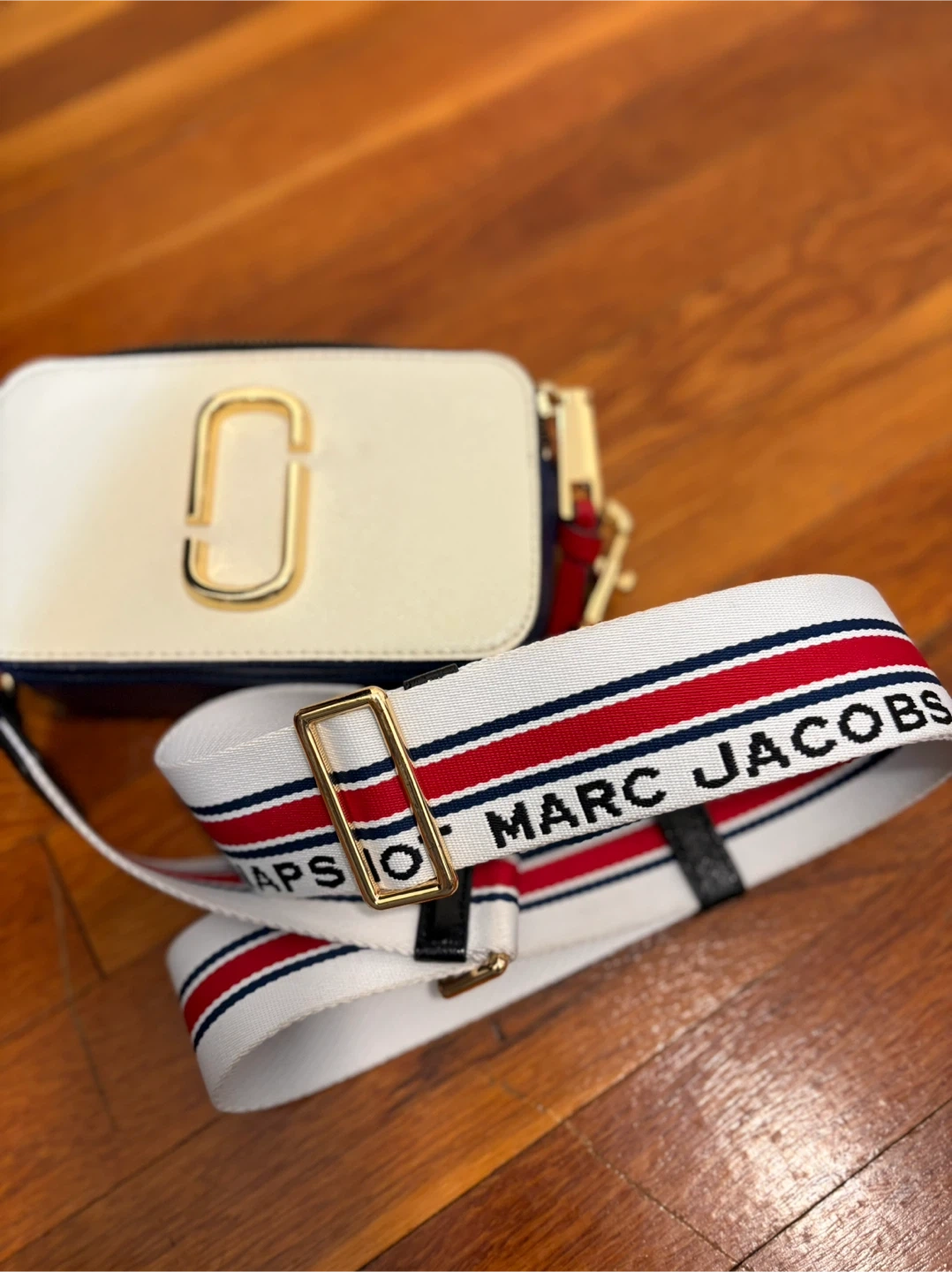 This is a Marc Jacobs Snapshot camera bag. It features a white, red, and blue color-blocked design with gold hardware. The bag comes with a detachable striped strap.