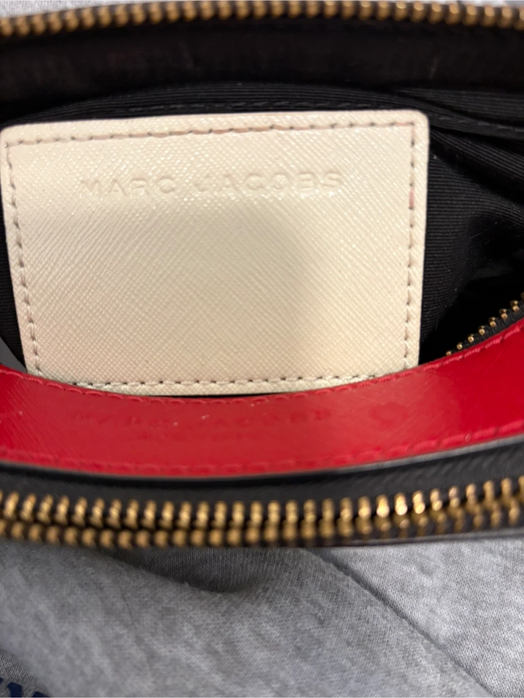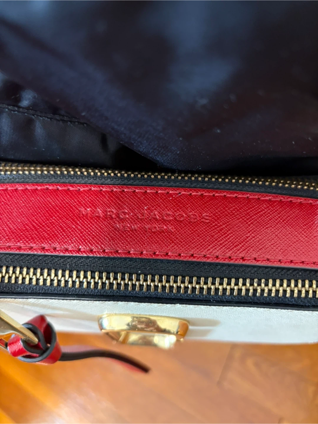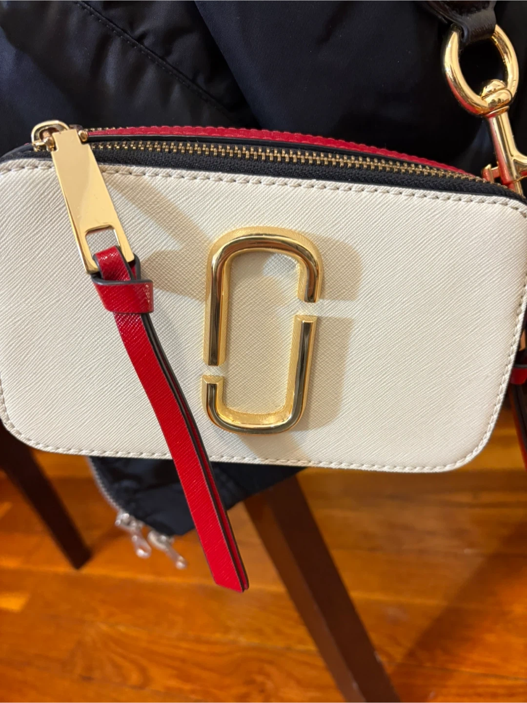 This is a Marc Jacobs Snapshot camera bag. It features a white, red, and blue color-blocked design with gold hardware. The bag comes with a detachable striped strap.