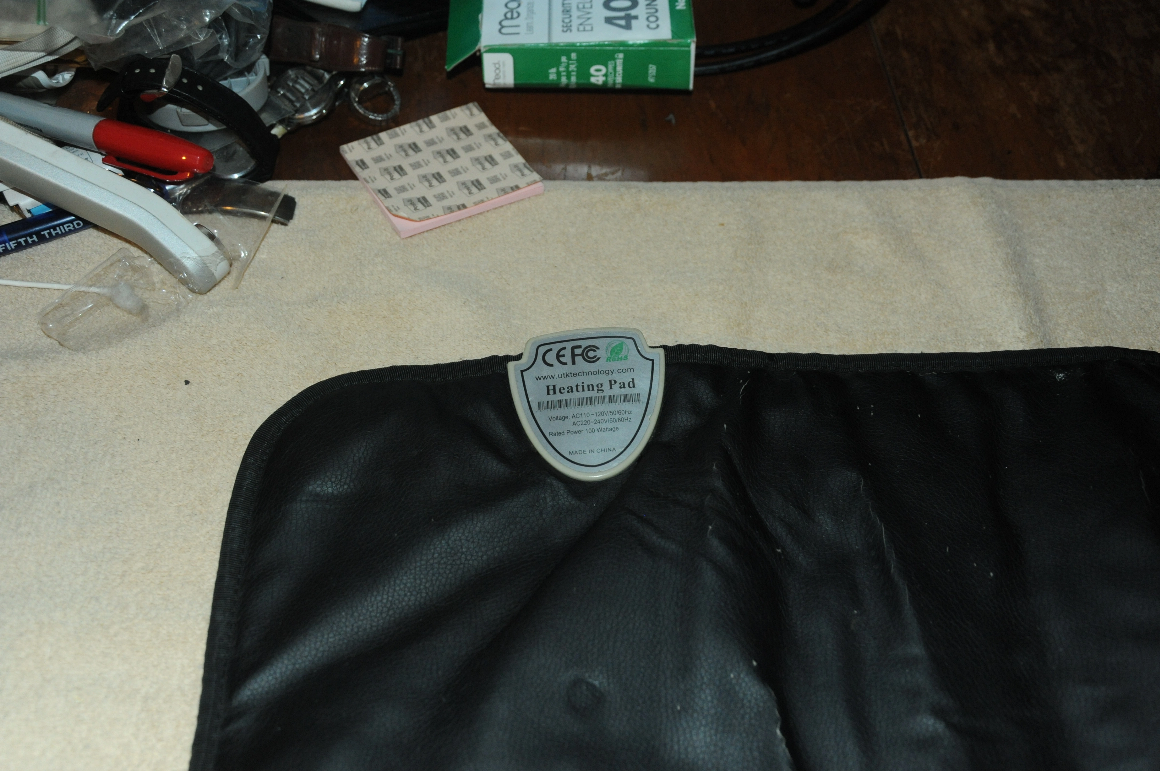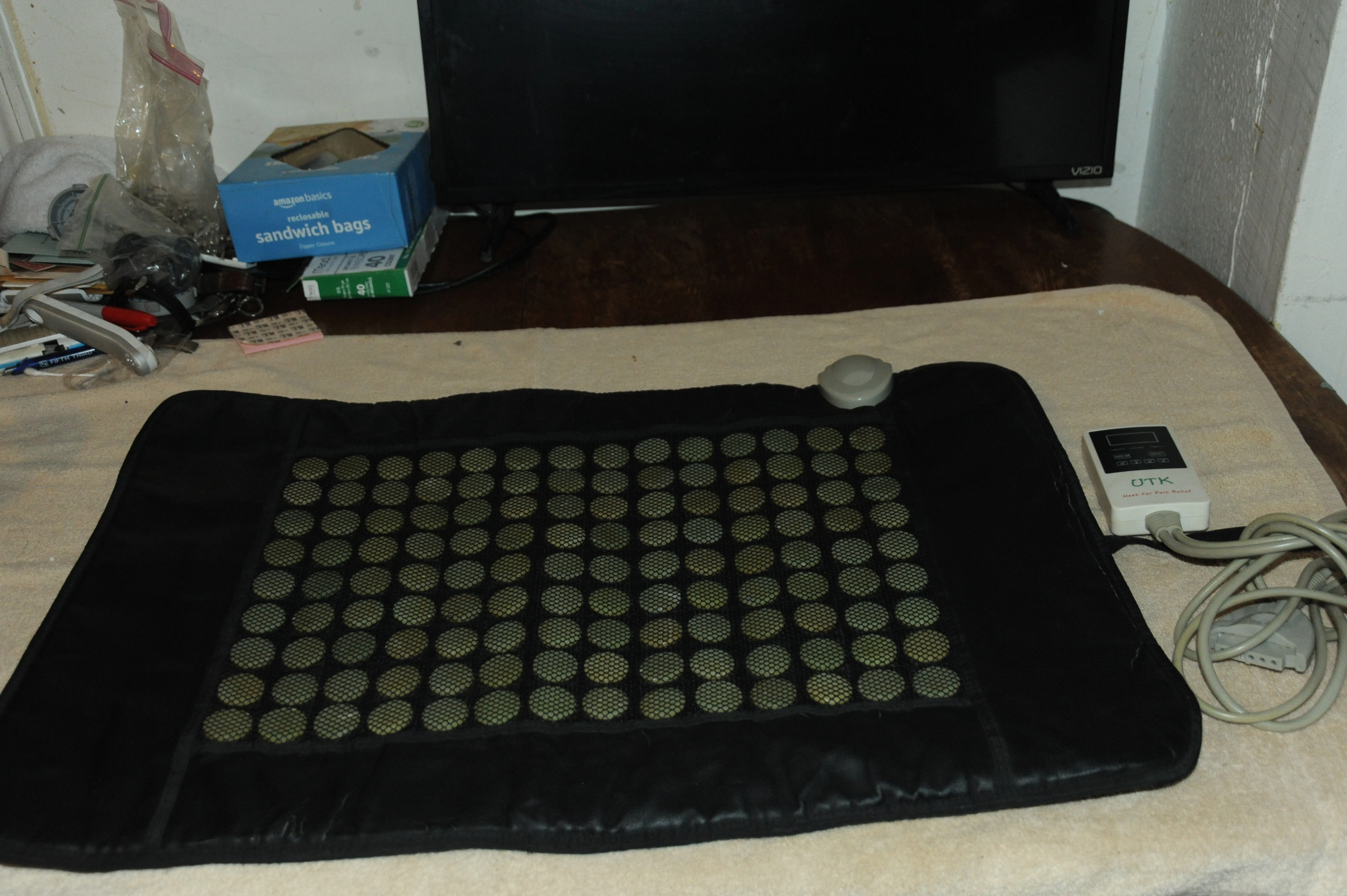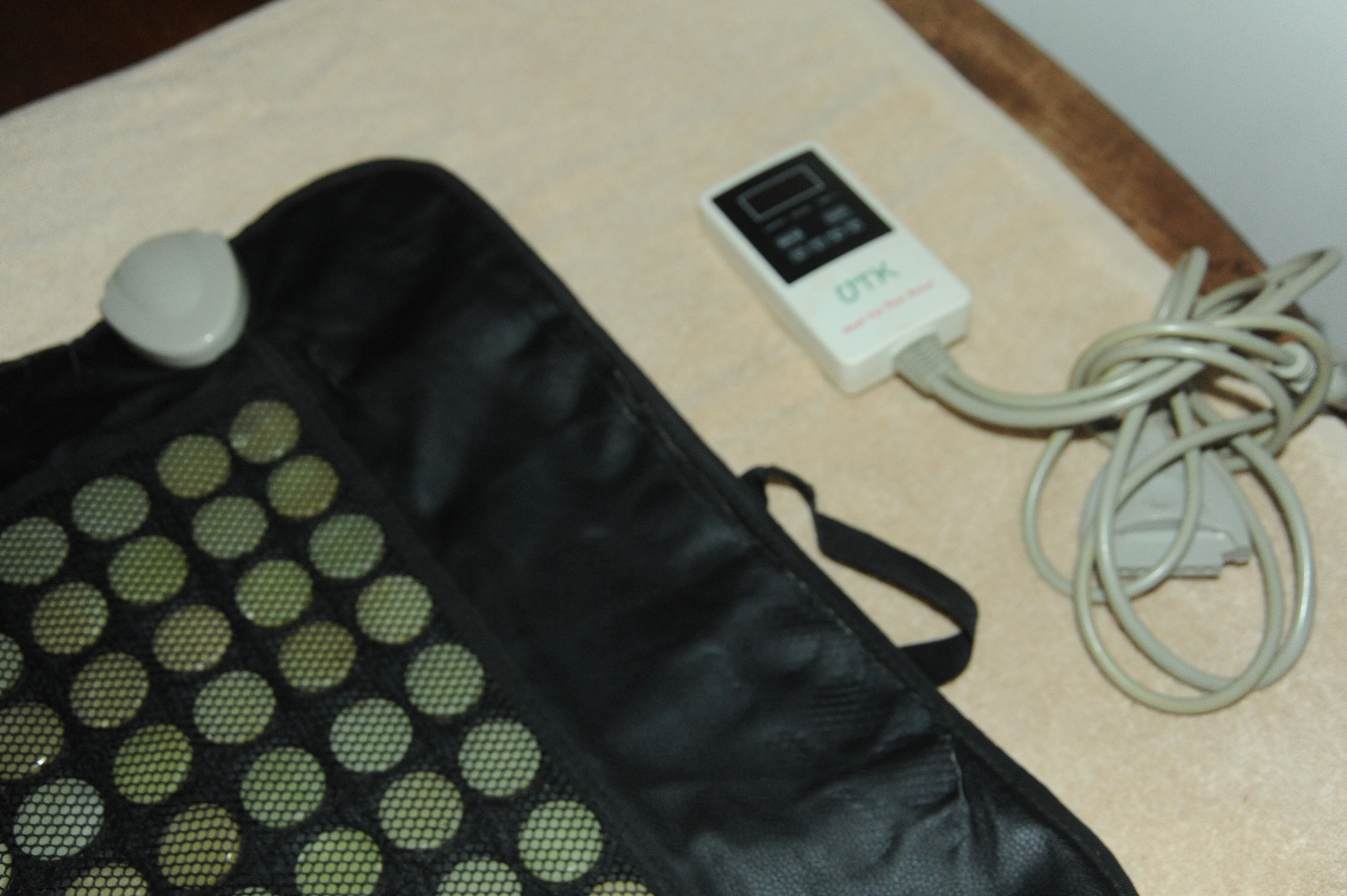 This is a UTK Heat For Pain Relief heating pad. It has a controller to adjust the heat settings for pain relief. There is some wear around the edges but it is fully functional.