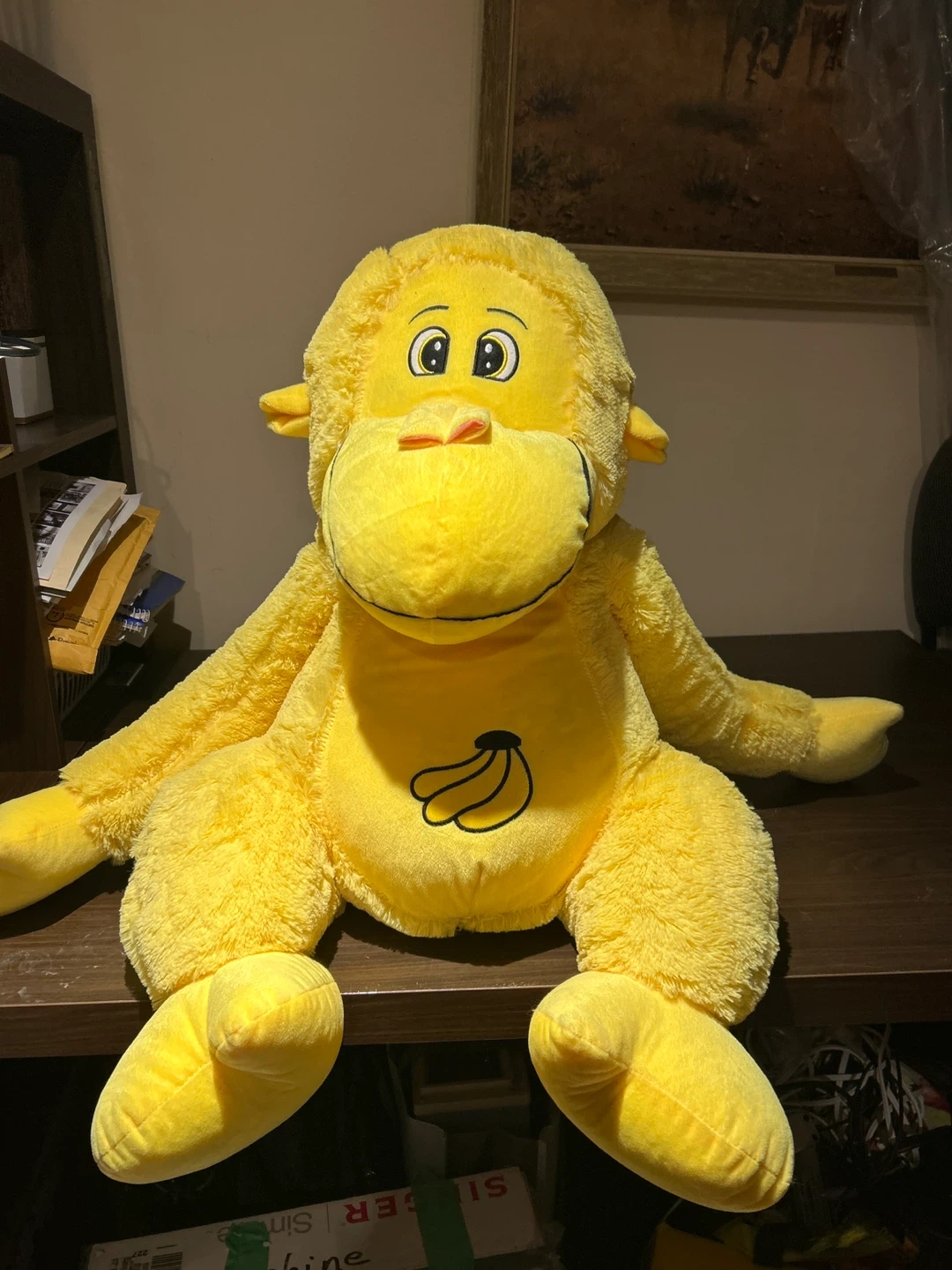 This is a fun, bright yellow plush monkey toy. It features a cute face and a small bunch of bananas embroidered on its belly. It's soft and huggable, perfect for kids or as a playful decoration! Its fuzzy material is lovely to touch.