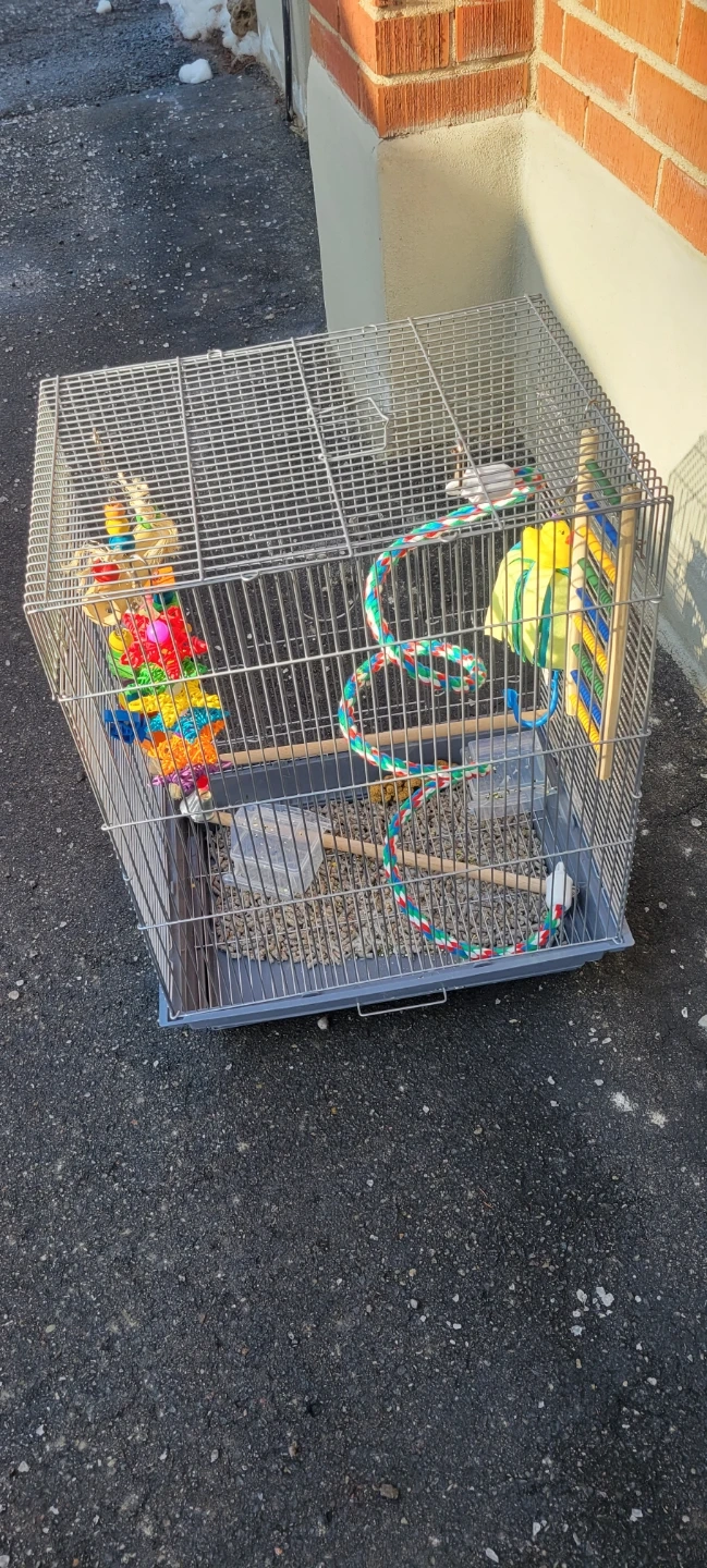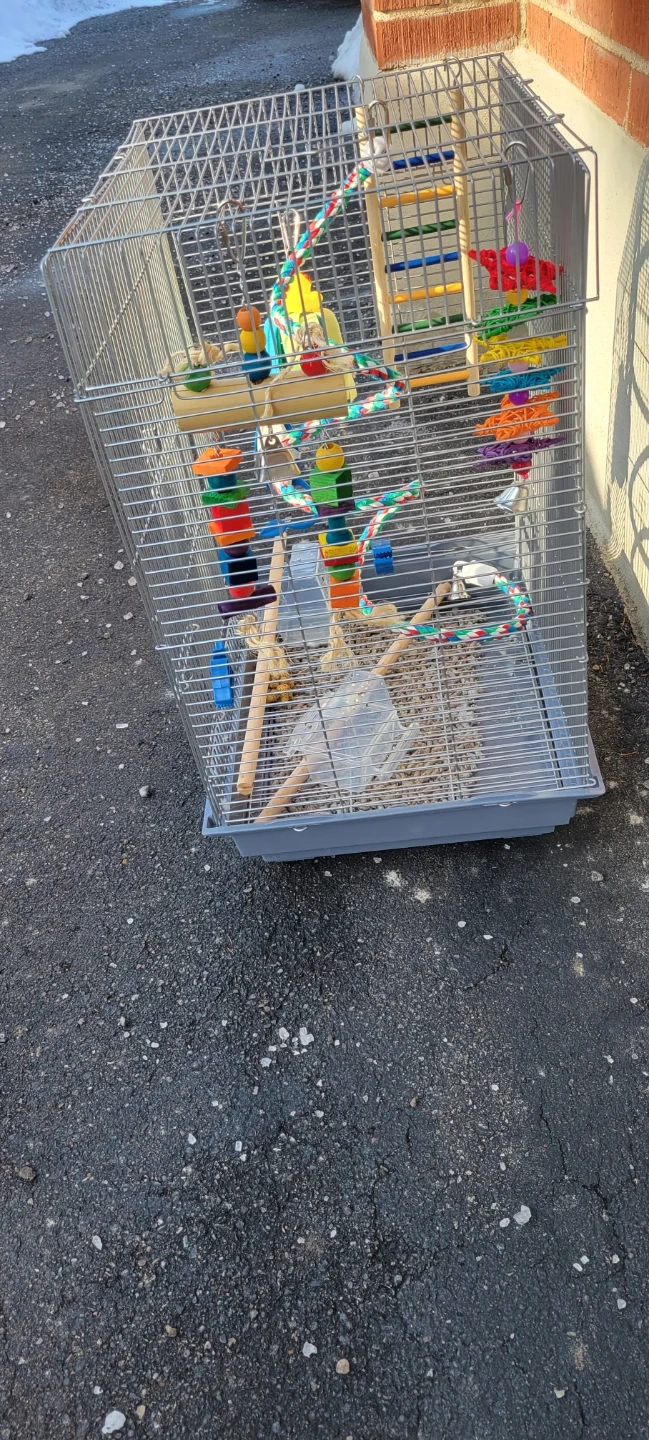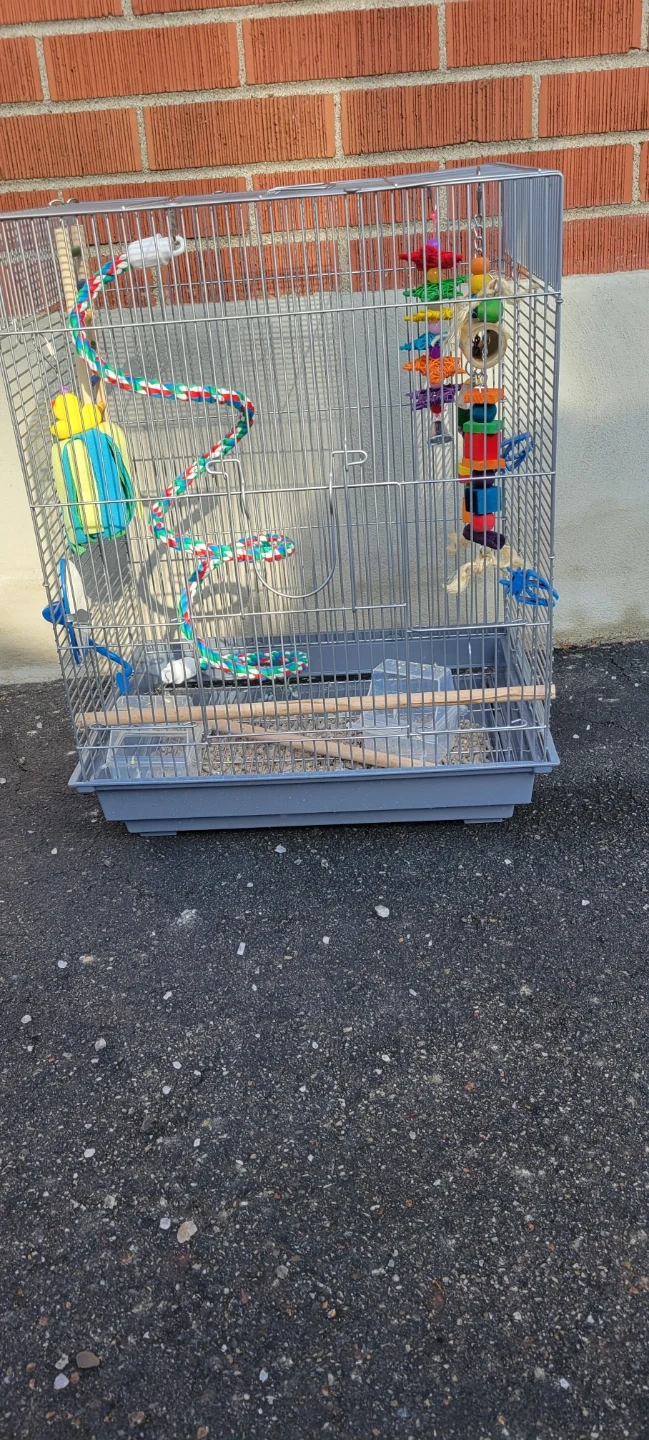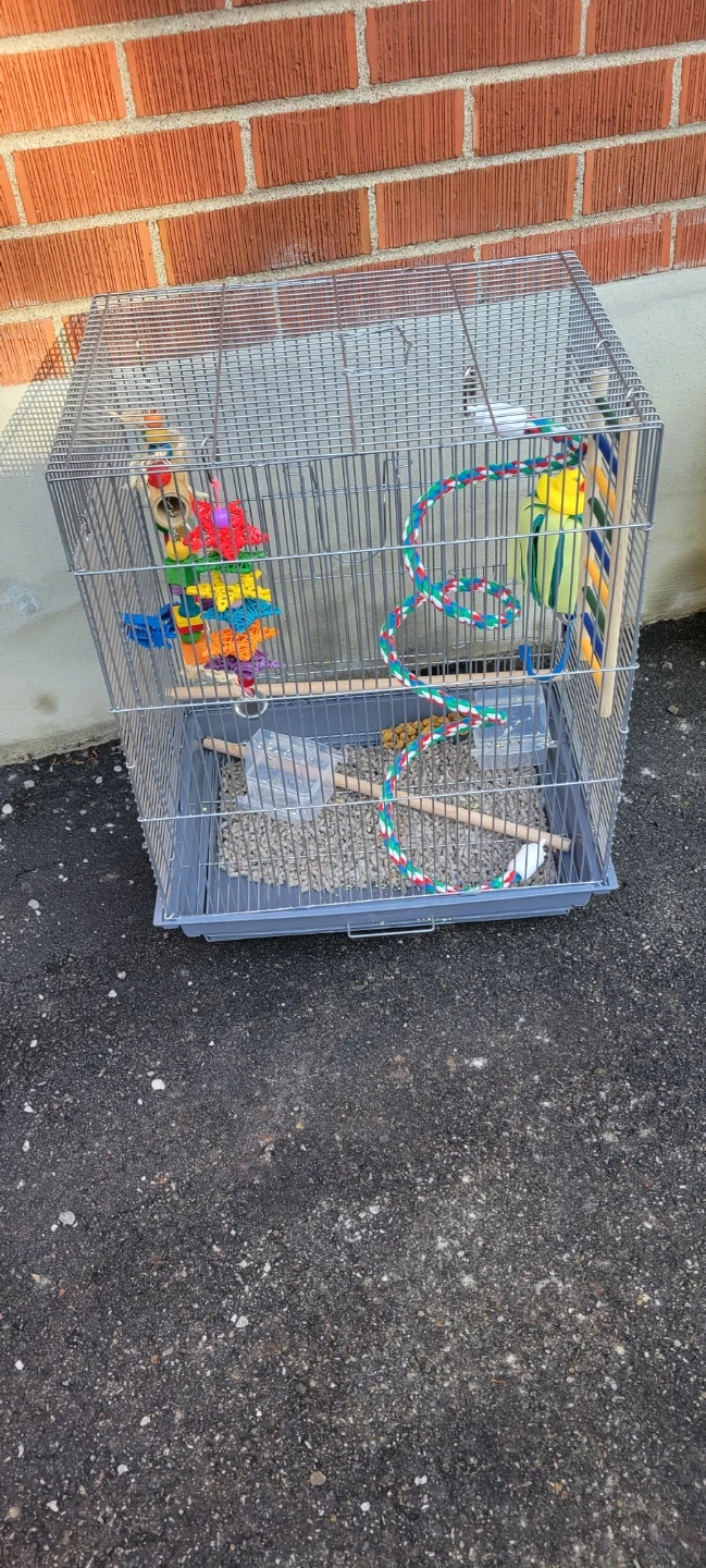 This is a metal bird cage with multiple toys and perches included. It has a pull-out tray for easy cleaning. It's suitable for small birds.my aunt bought this less than a week ago at pet smart along with 2 birds. She can't have them where she lives .could only return birds cost $163 t tax for everything pictured.