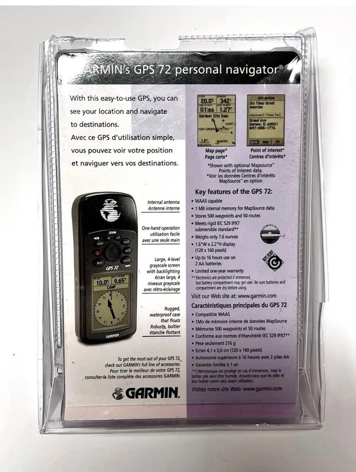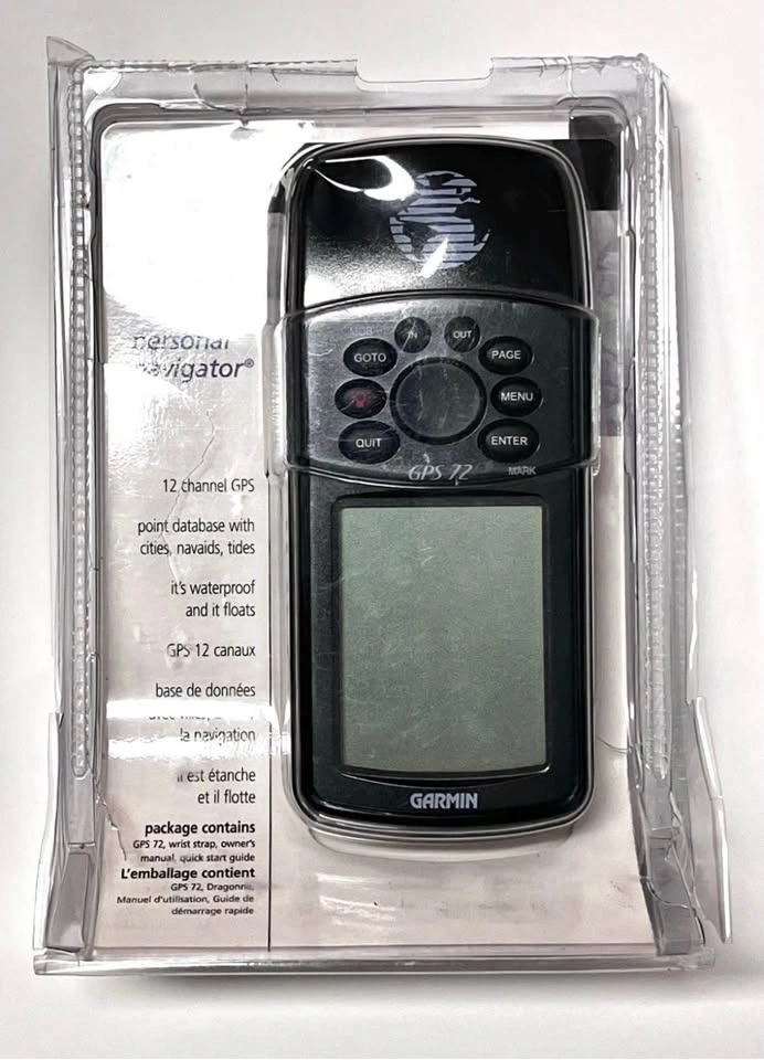 Garmin GPS 72 handheld GPS unit in great cosmetic and working condition. Fully tested – powers on and functions as it should. Original packaging included. Clean screen and housing with minimal signs of use. Ideal for marine navigation, hiking, and outdoor activities. Included in this sale: Garmin GPS 72 handheld unit, Original Packaging, Original manuals. Features: Rugged handheld GPS, Waterproof (IPX7), WAAS-enabled GPS receiver. Uses 2×AA batteries (included).