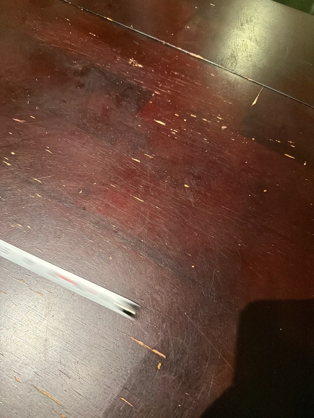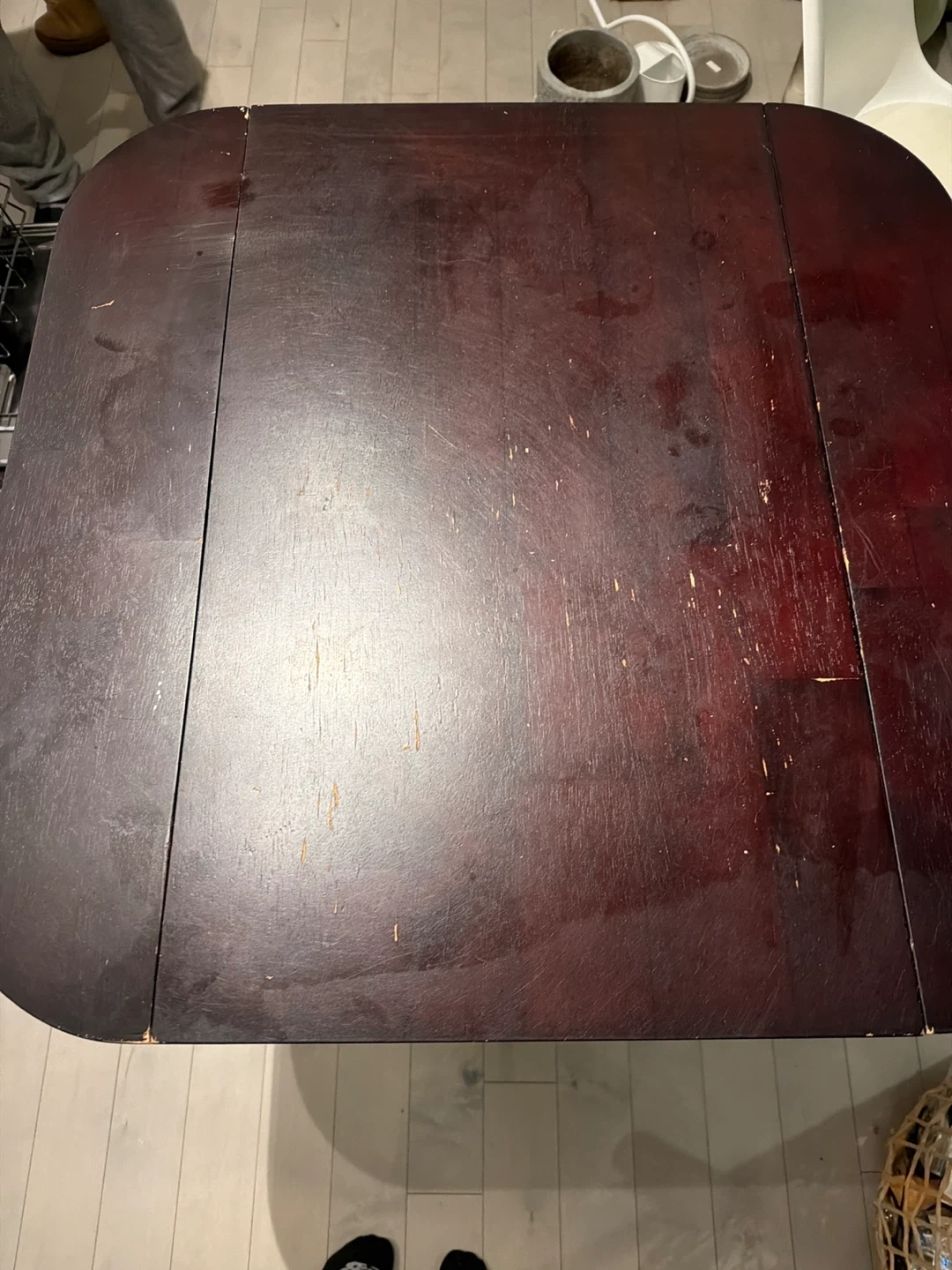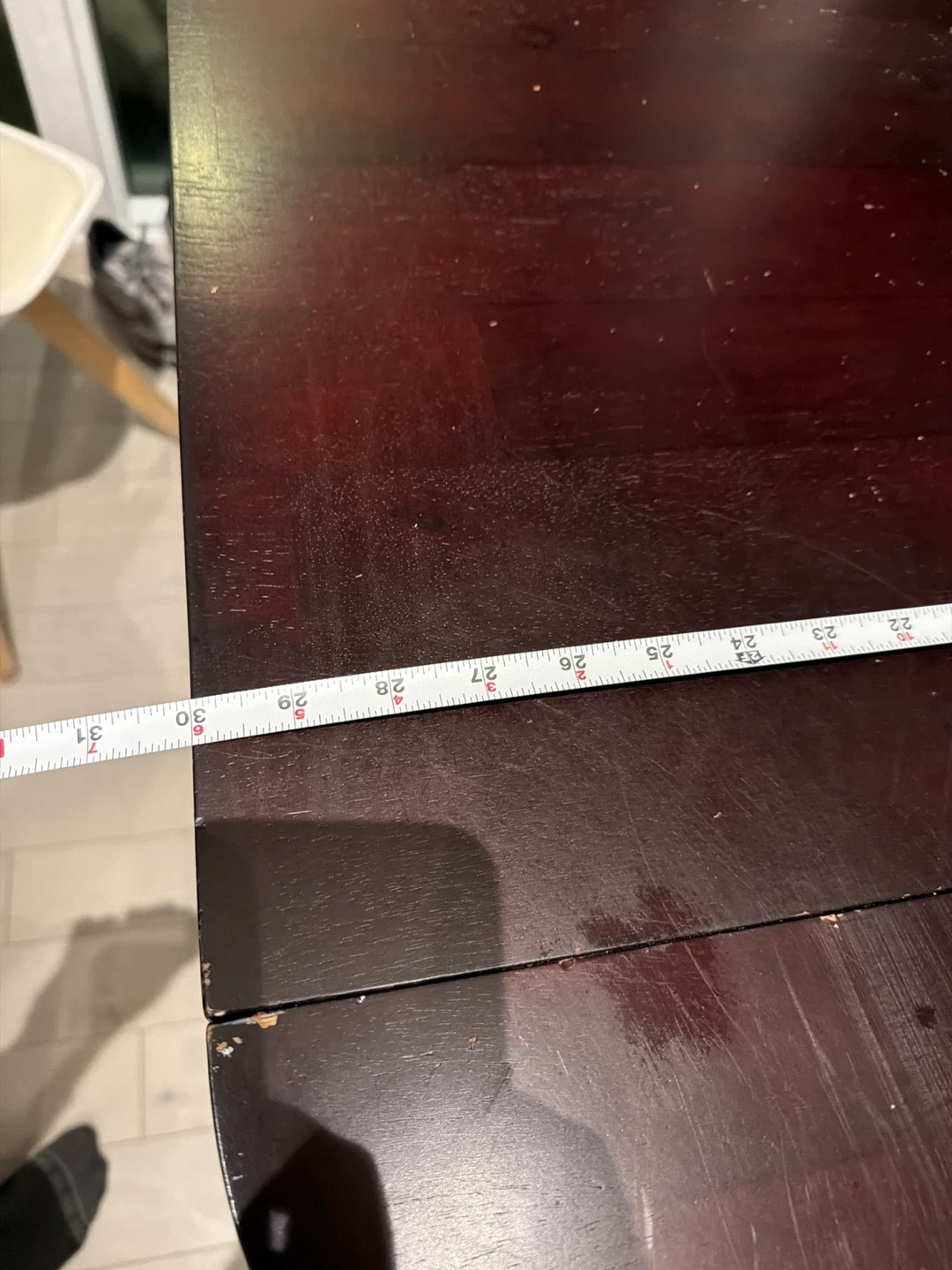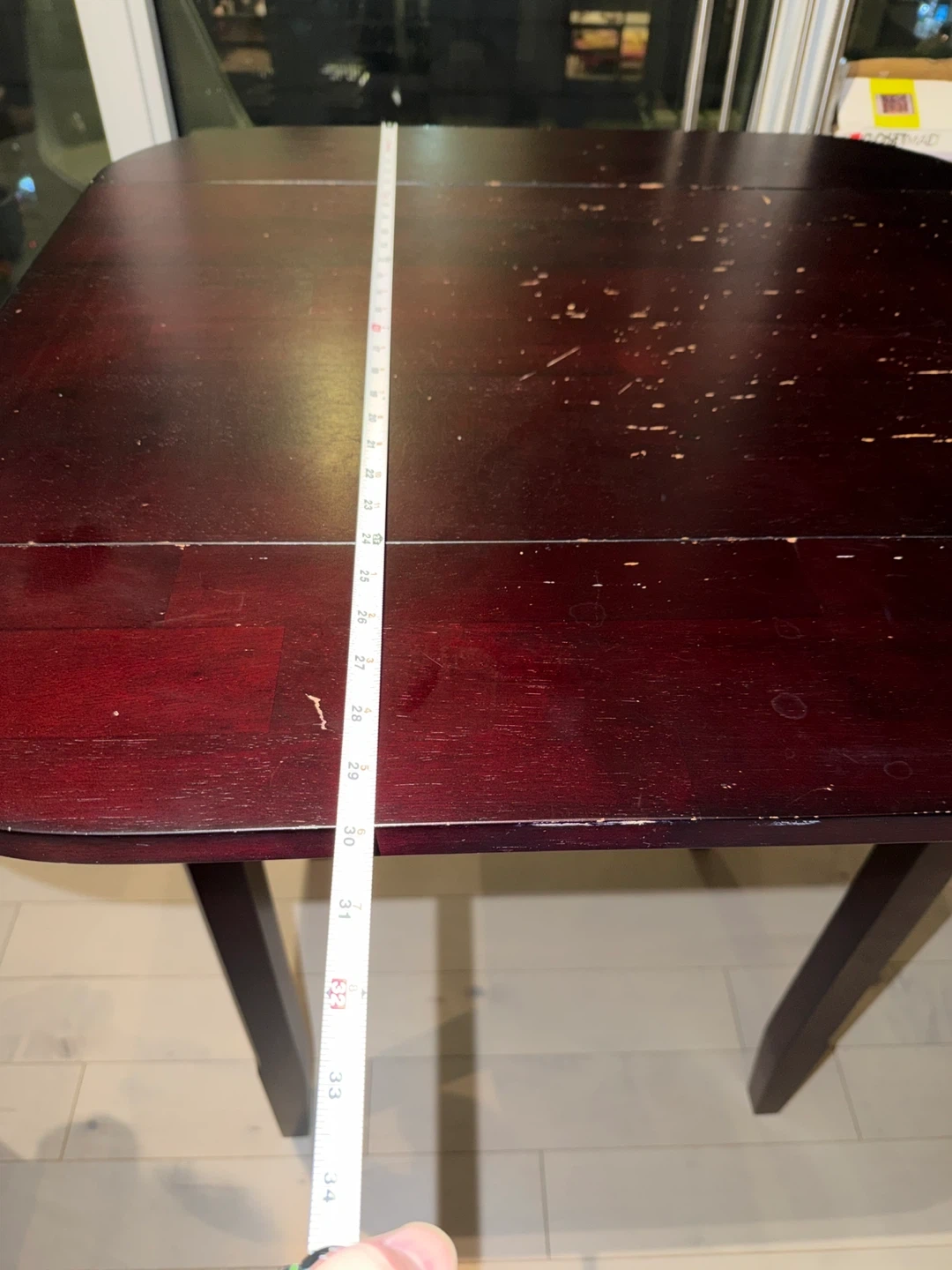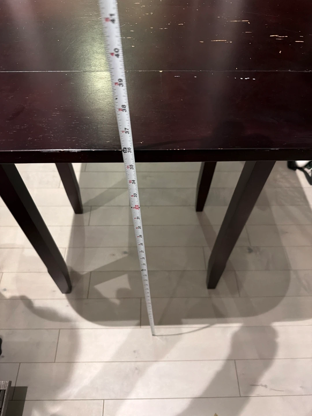 Selling a dark wood dining table. It measures approximately 36 inches in length and 30 inches in width. It has some signs of use.