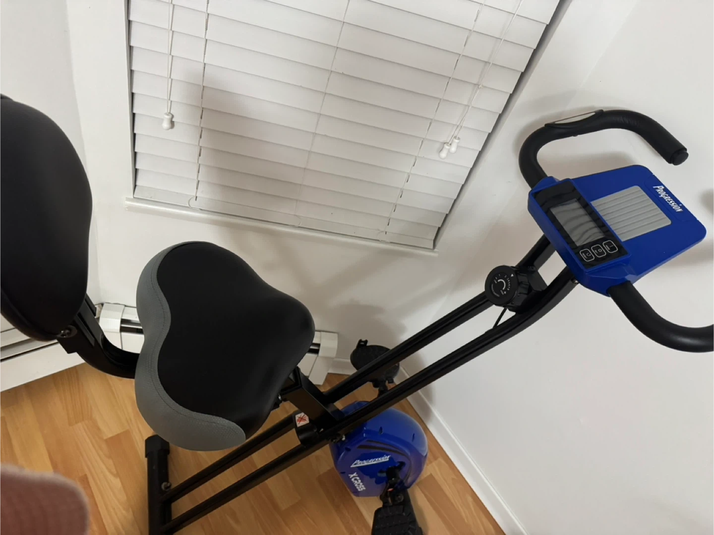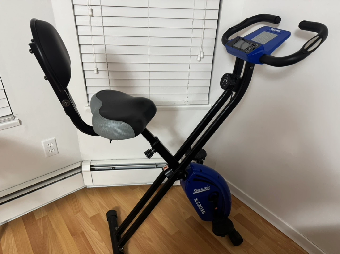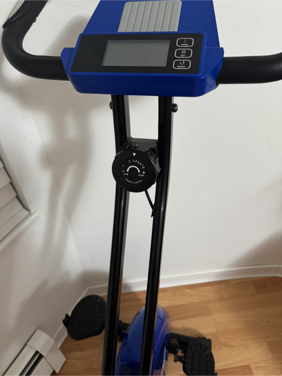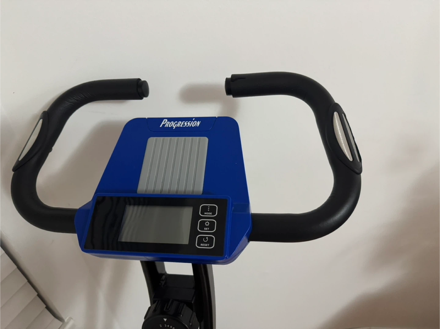 This Progression XCR55 exercise bike is blue and black. It features a tension control knob with adjustable levels from low to high. The display console shows workout stats.