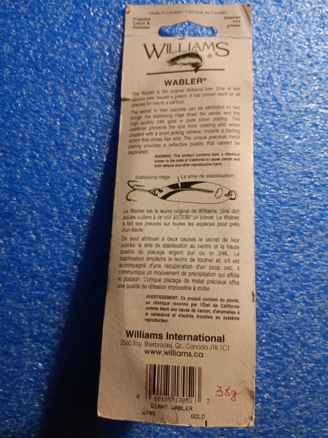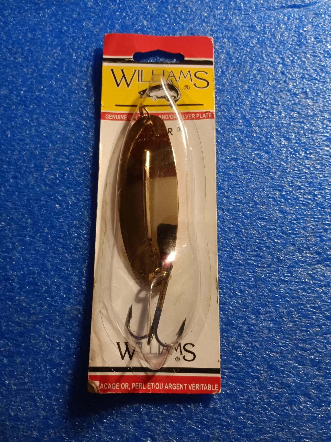 This is a gold Williams Wabbler fishing lure. It's designed to attract fish with its wiggling action and reflective finish. This lure is great for anglers looking to add a classic to their tackle box.