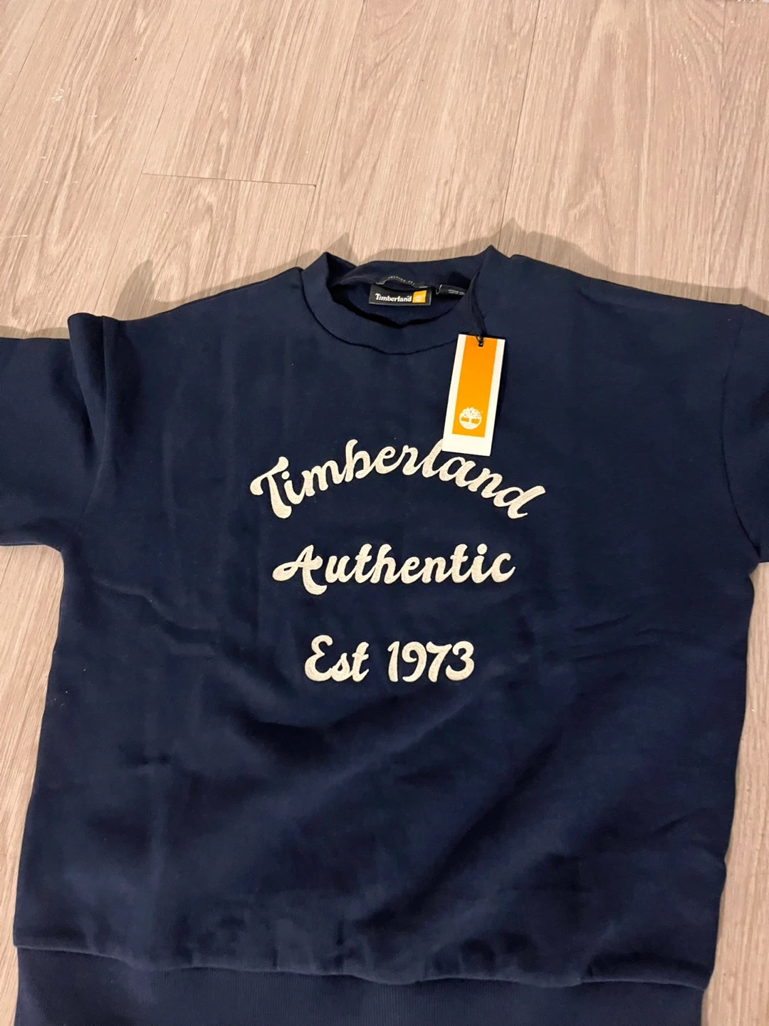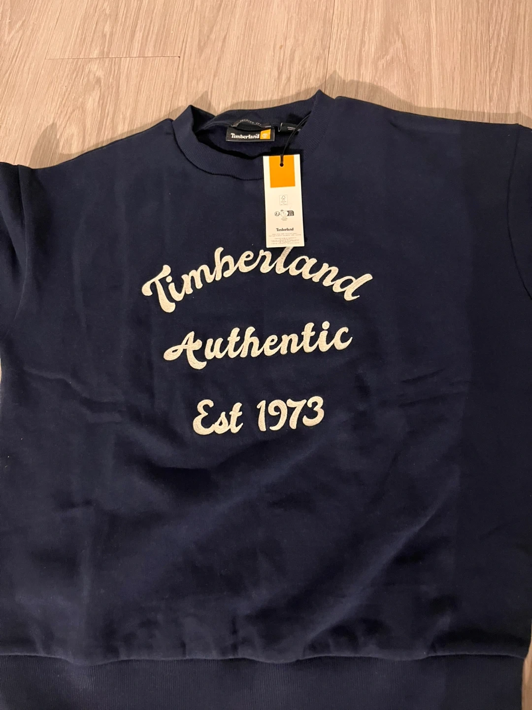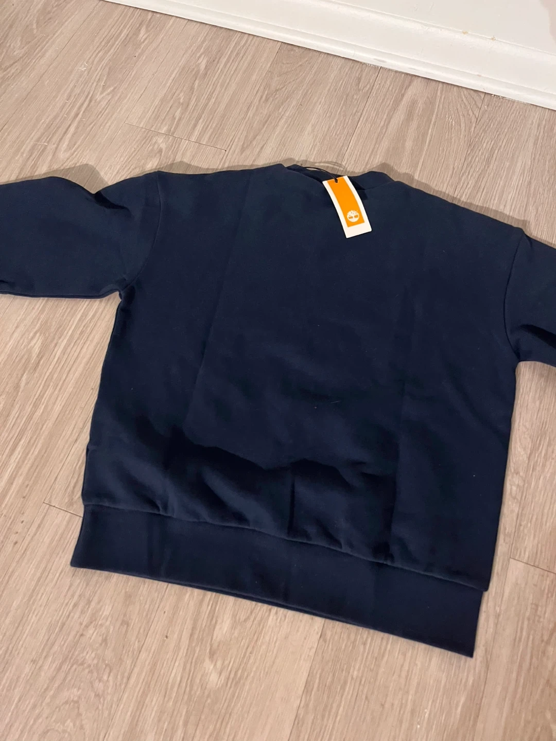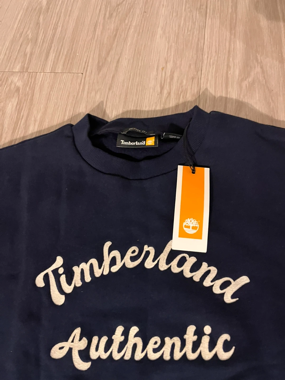 Selling a brand new with tags Timberland Authentic crewneck sweatshirt. It's a stylish and comfortable piece, perfect for everyday wear. The sweatshirt is a classic navy color with the Timberland logo embroidered on the front.
