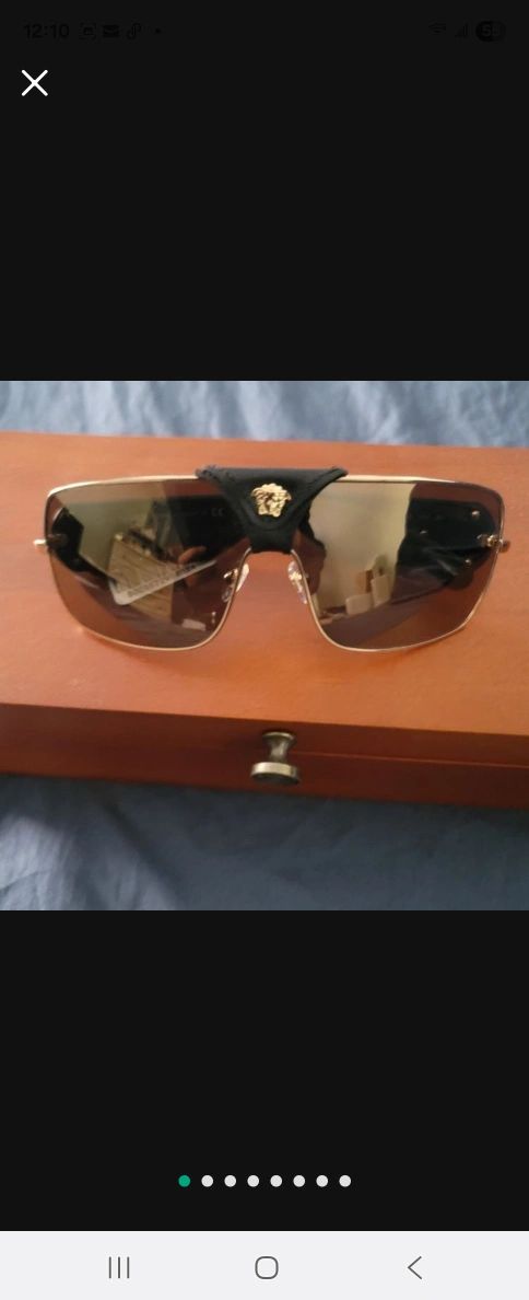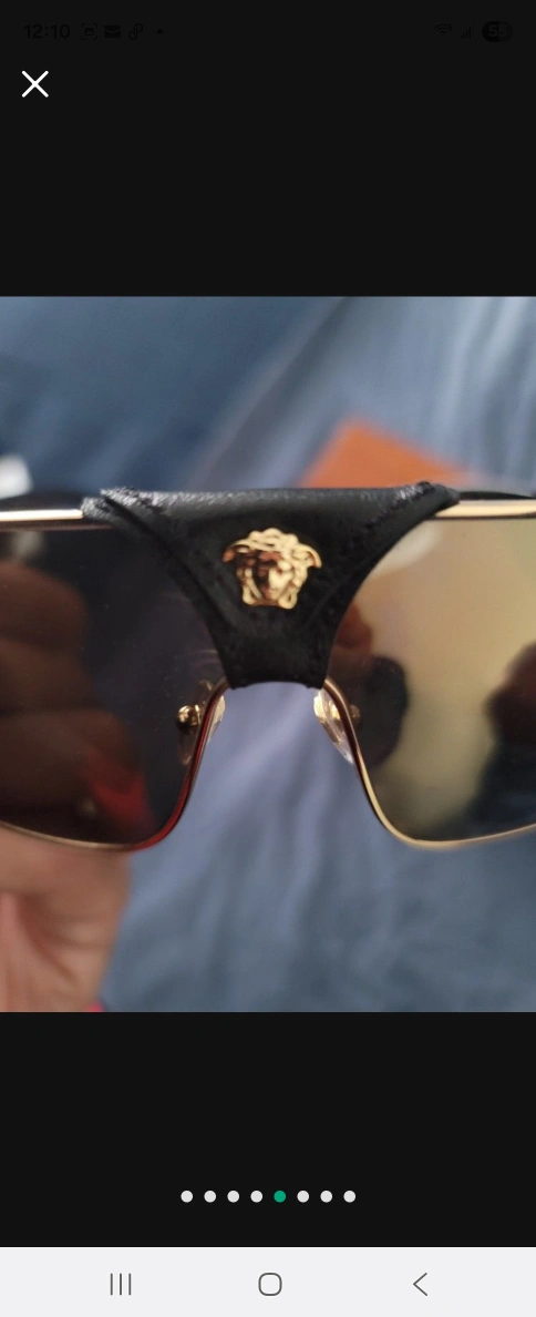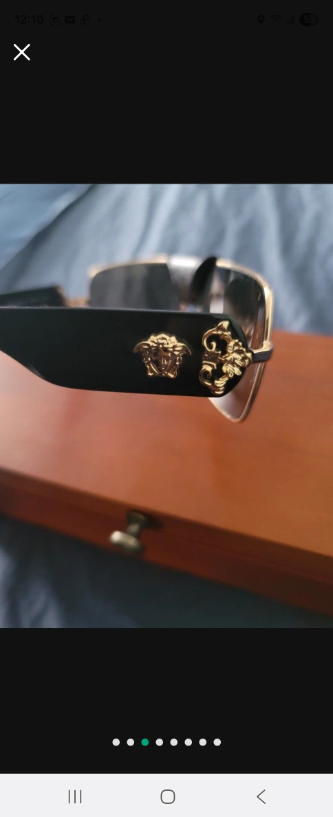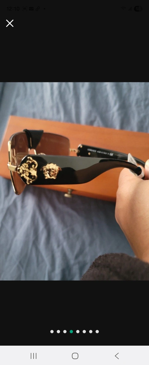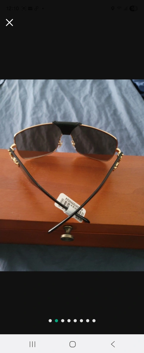 Sunglasses with gold-colored rims. Black arms and nose bridge. Golden emblems on the sides and bridge. They can be worn to the beach or the pool for extra comfort.