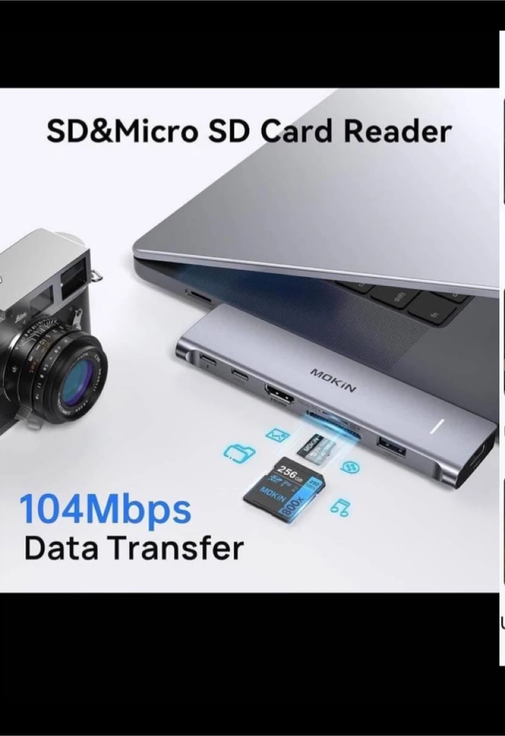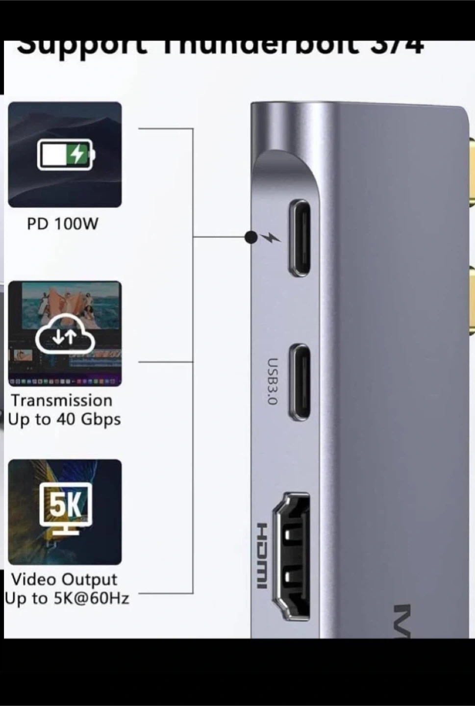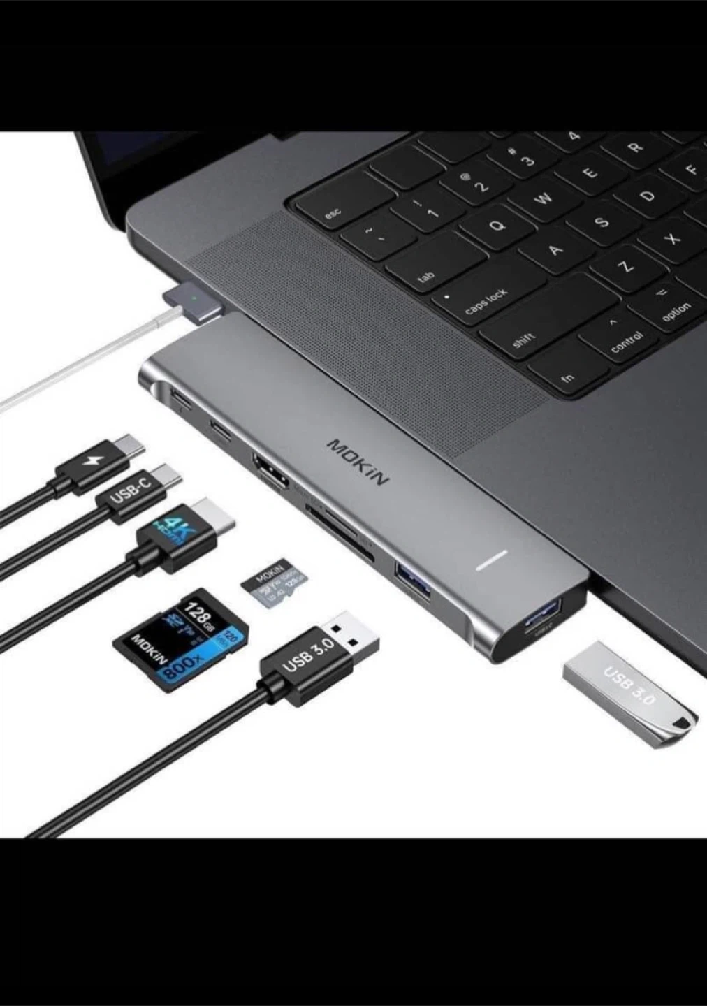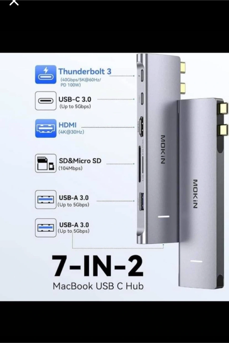 This MOKIN USB C hub is designed for MacBooks. It features Thunderbolt 3 with 100W PD, USB-C 3.0 up to 5Gbps, HDMI at 4K@30Hz, and an SD/Micro SD card reader with 104Mbps data transfer. It also includes two USB-A 3.0 ports. This adapter expands your MacBook's connectivity options!