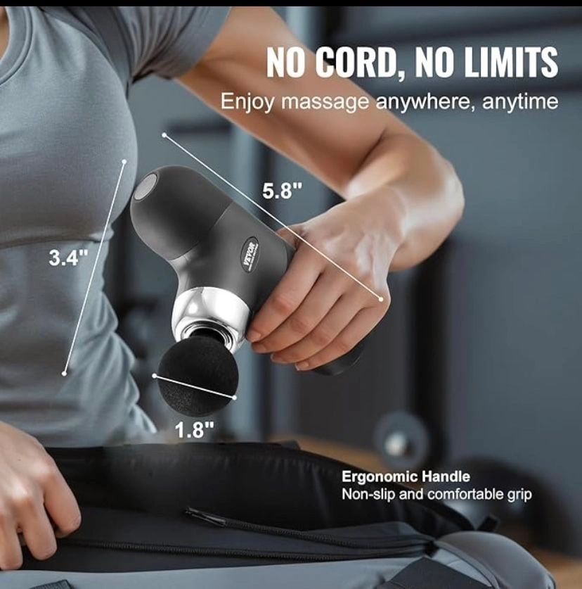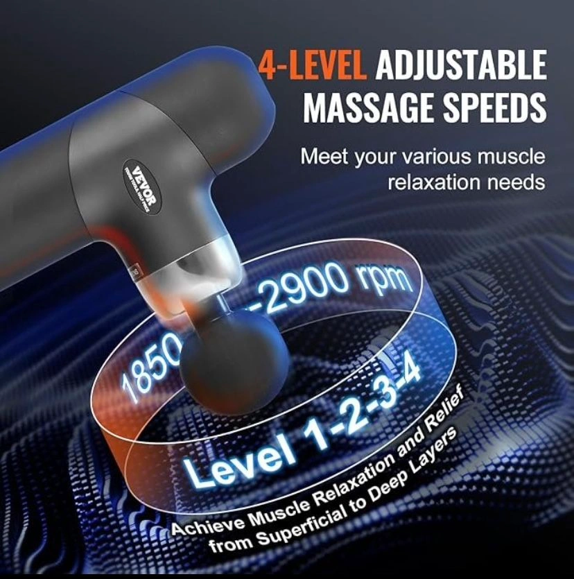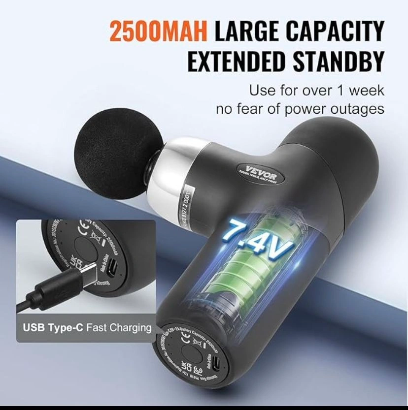 Compact & Portable: Lightweight and ergonomic design. Easily fits into the included storage bag, ideal for gym, sports, office, or home. Great gift for special occasions. Customizable Settings: 4 speed levels (1850rpm to 2900rpm) and 4 interchangeable massage heads for a personalized experience. Long Battery Life: 7.4V 2500mAh battery lasts up to 1 week with 30 minutes of daily use. USB-Type C charging with a 15-minute auto shut-off for safety. Versatile Muscle Relief: Includes 4 heads for targeting different muscle groups. Effective for pain relief, muscle awakening, and post-workout recovery.