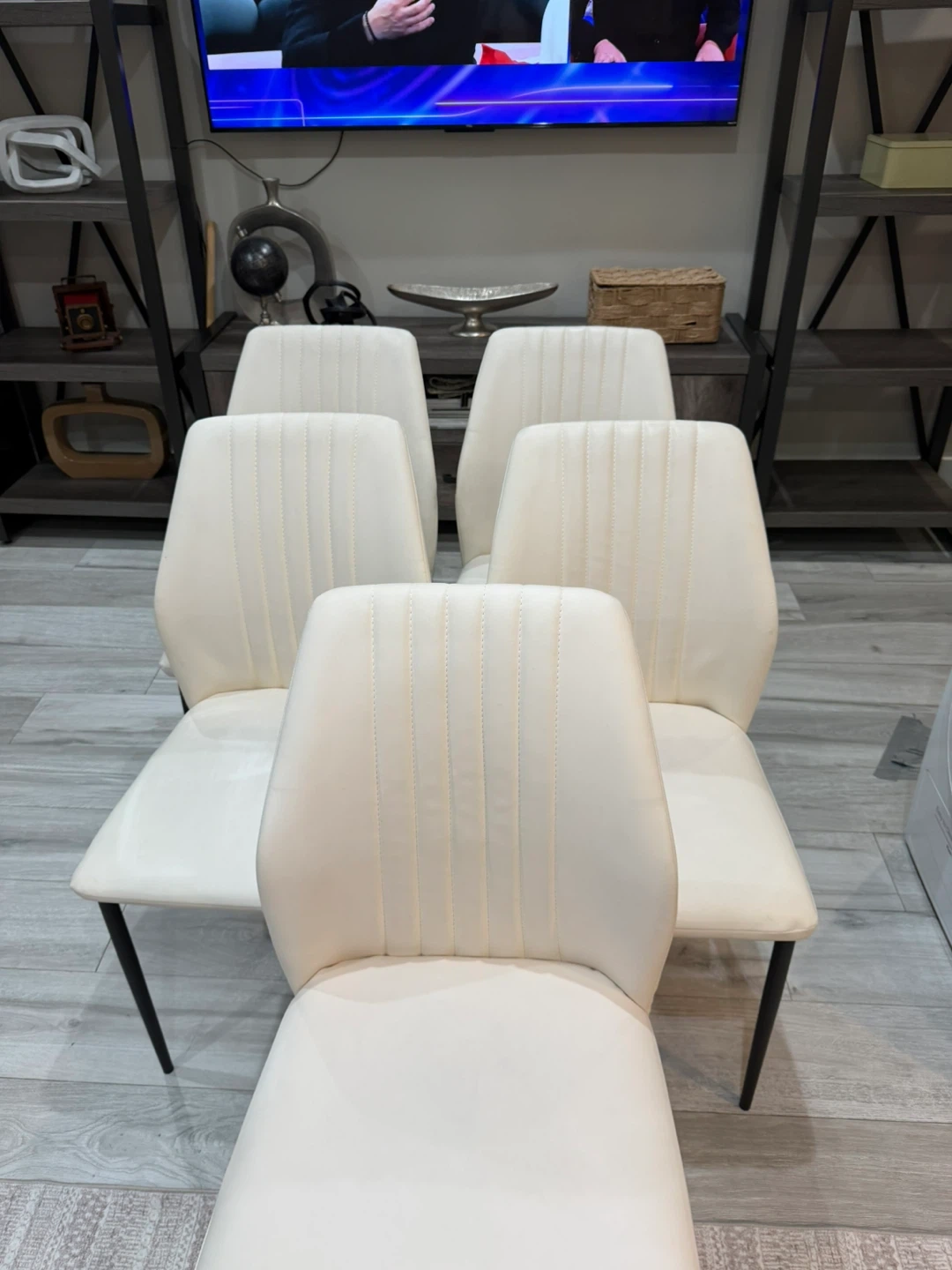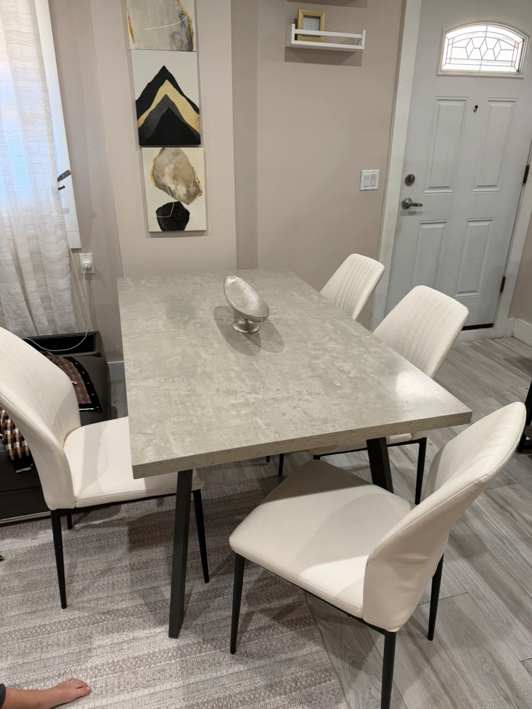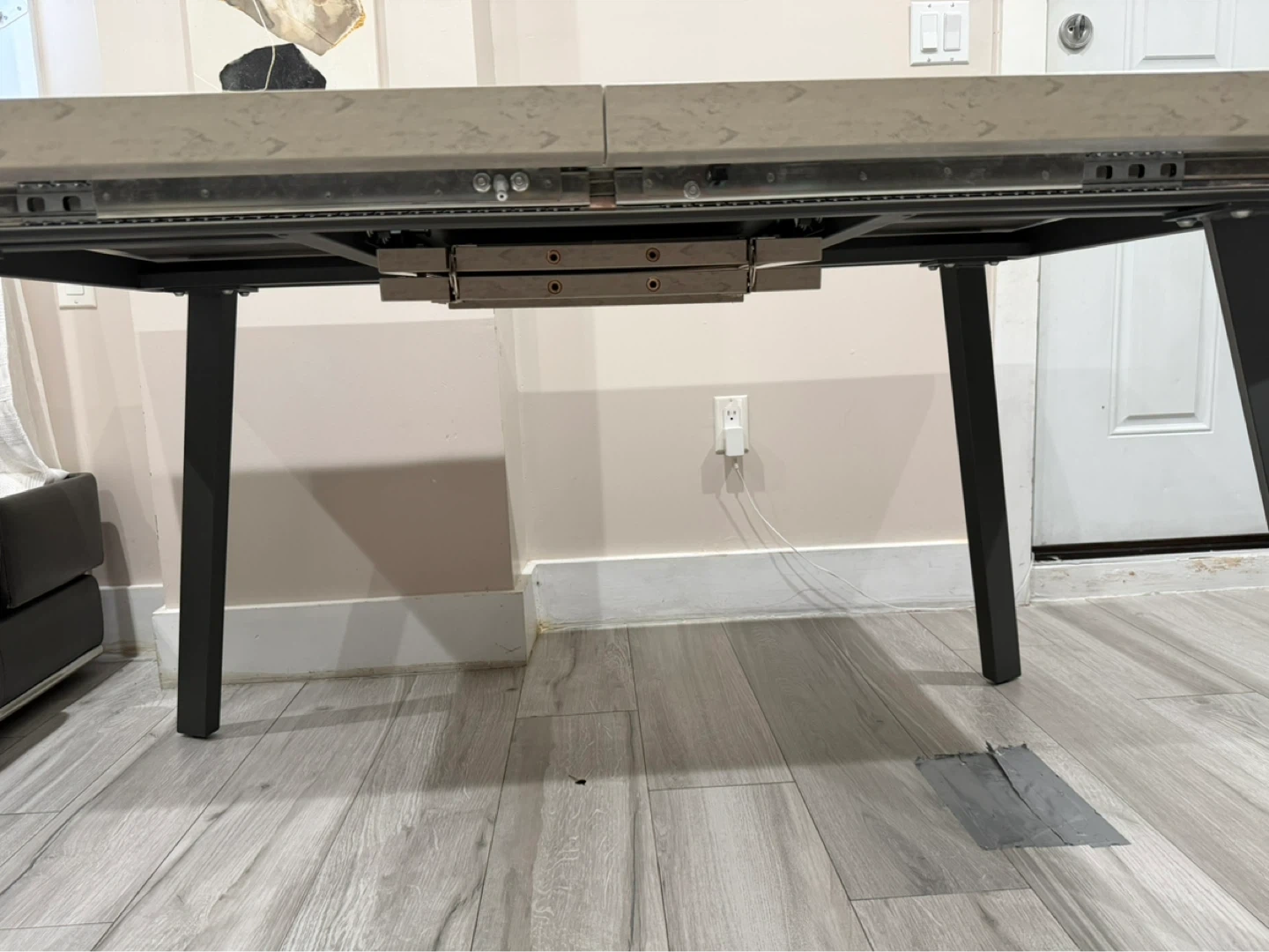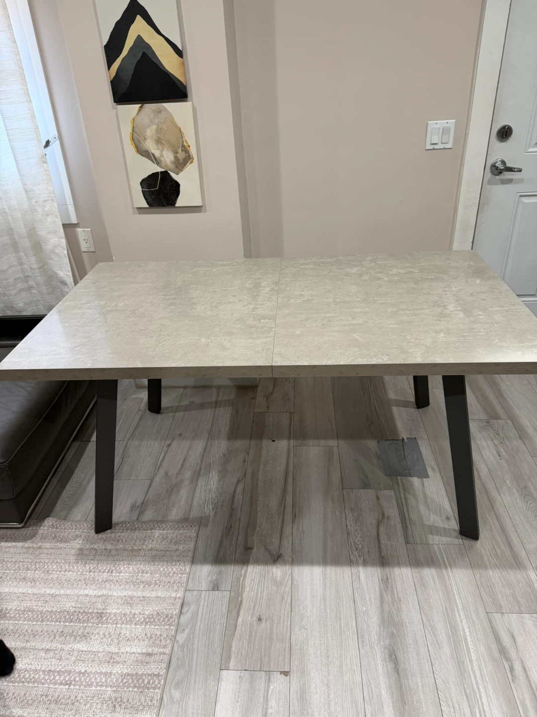This dining table features a grey stone-look top with a retractable extension leaf. It's supported by dark metal legs. The table comfortably seats four but can expand to accommodate more guests. Chairs are included in the price.