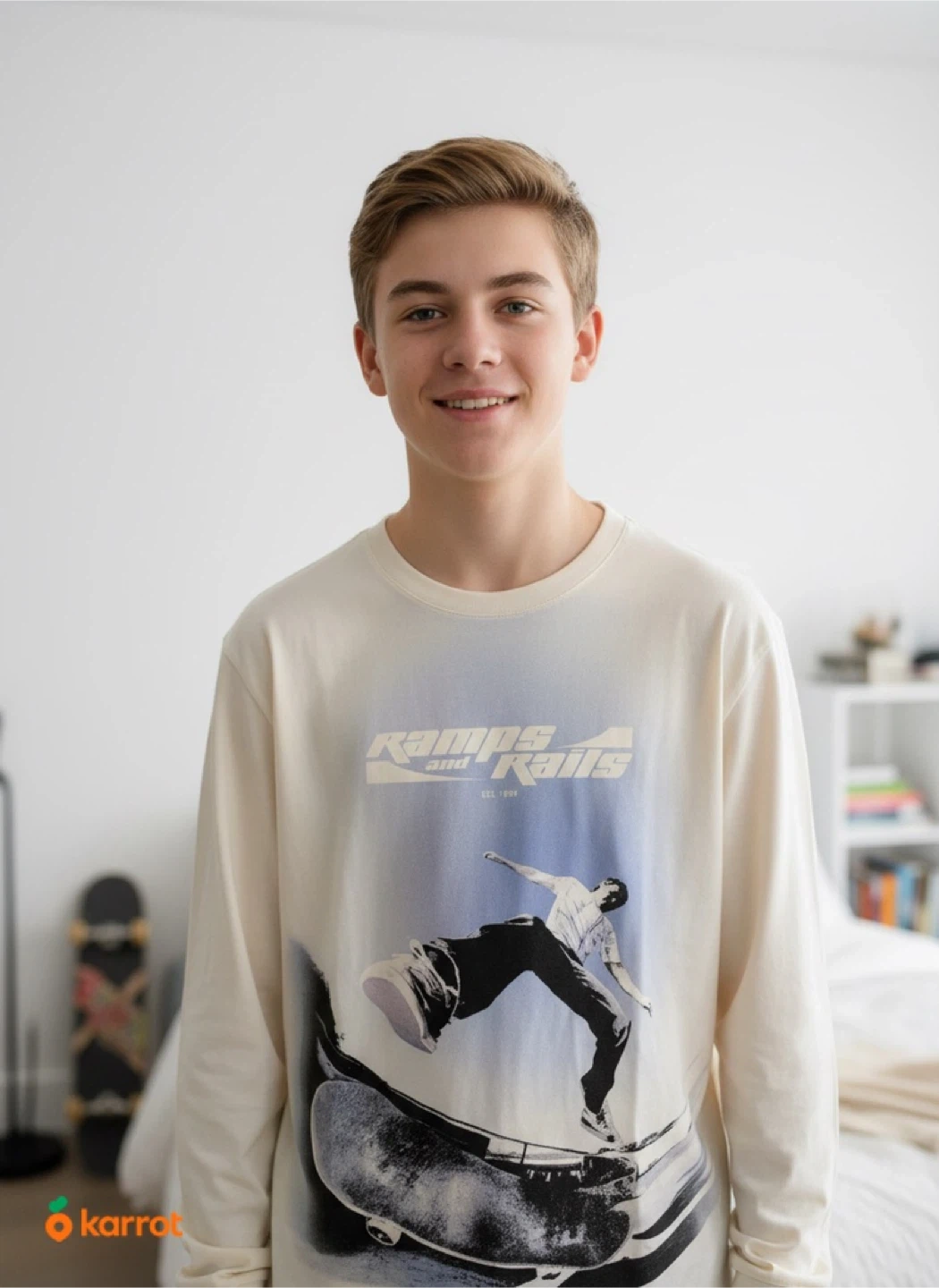 Cream-coloured long sleeve t-shirt from Old Navy. Features a 'Ramps and Rails' graphic with a skateboarder. Size XL Youth (14-16). Cotton blend material. retails price 19.99