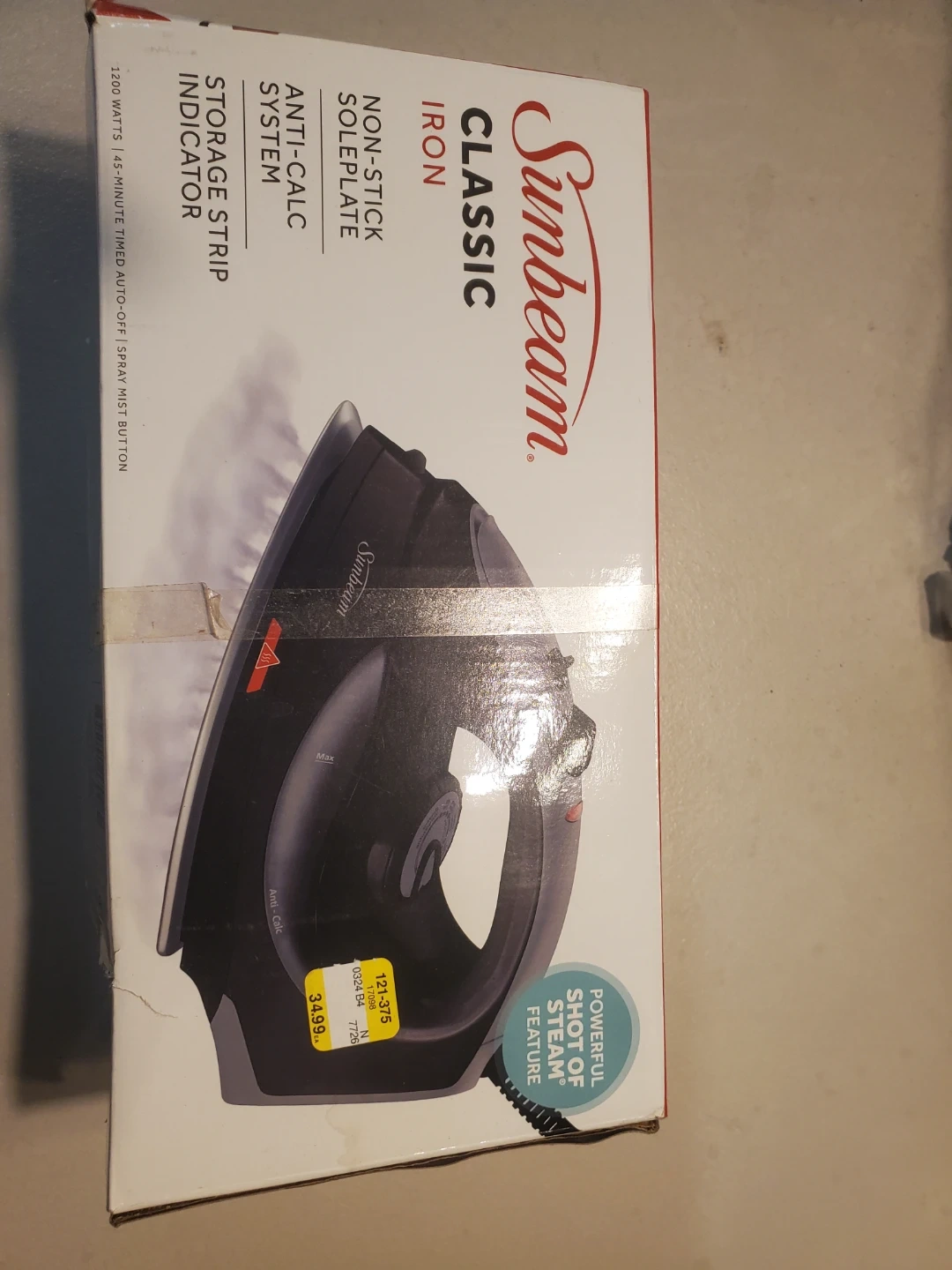 This Sunbeam Classic iron features a non-stick soleplate and anti-calc system. It includes a storage strip indicator and a 45-minute timed auto-off. Powerful shot of steam feature!