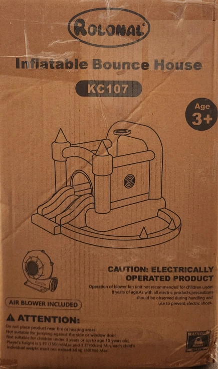 Selling a Rolonal Inflatable Bounce House, model KC107! It's perfect for kids ages 3 and up. This electrically operated product comes with an air blower. The box is included!