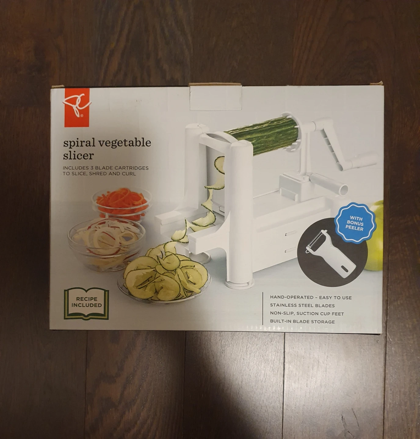 This spiral vegetable slicer includes 3 blade cartridges for slicing, shredding, and curling. It's hand-operated with stainless steel blades and non-slip suction cup feet. Built-in blade storage is included, This slicer is great for preparing vegetables for salads or garnishes.