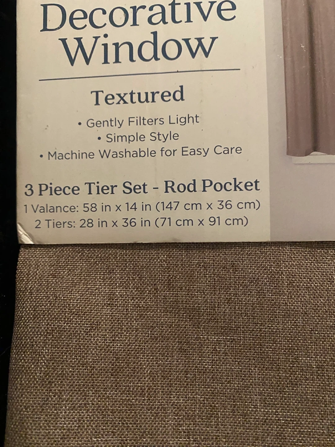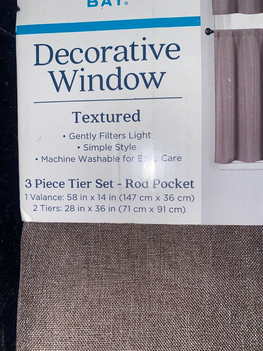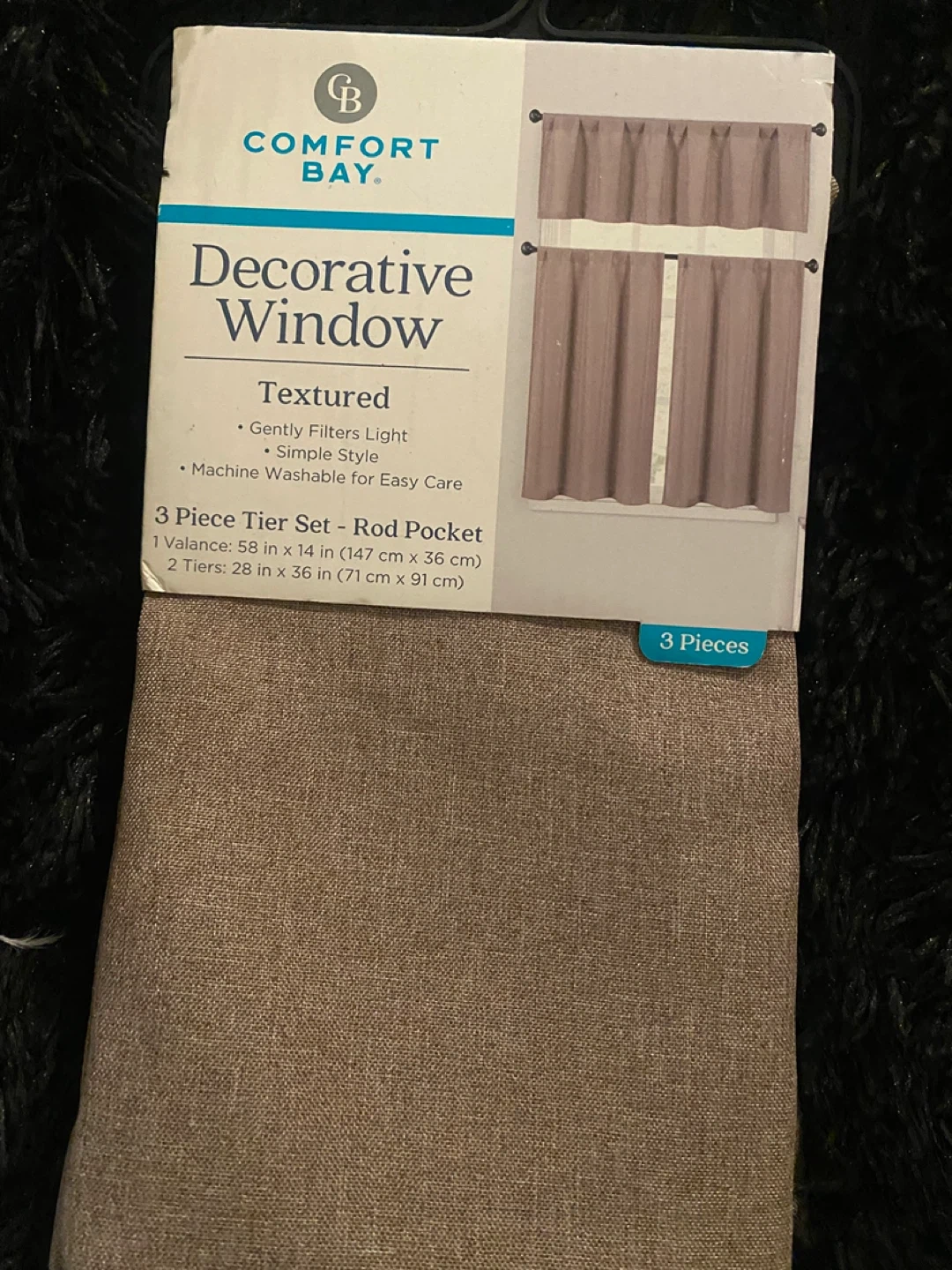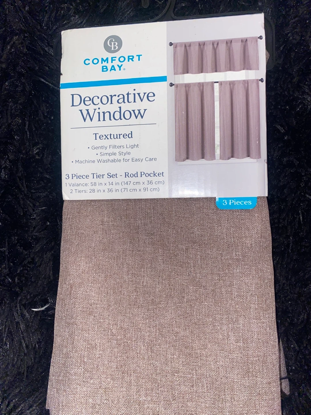 This is a 3-piece decorative window tier set from Comfort Bay. It includes 1 valance measuring 58 x 14 inches (147 cm x 36 cm) and 2 tiers measuring 28 x 36 inches (71 cm x 91 cm). These textured curtains gently filter light and are machine washable for easy care. They're a simple style for any room!