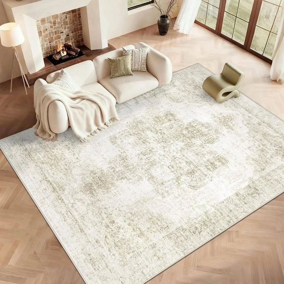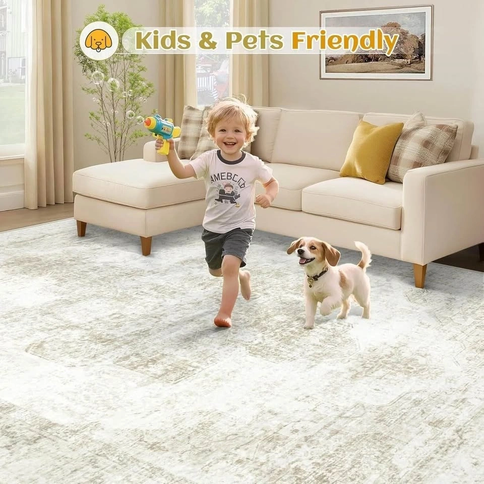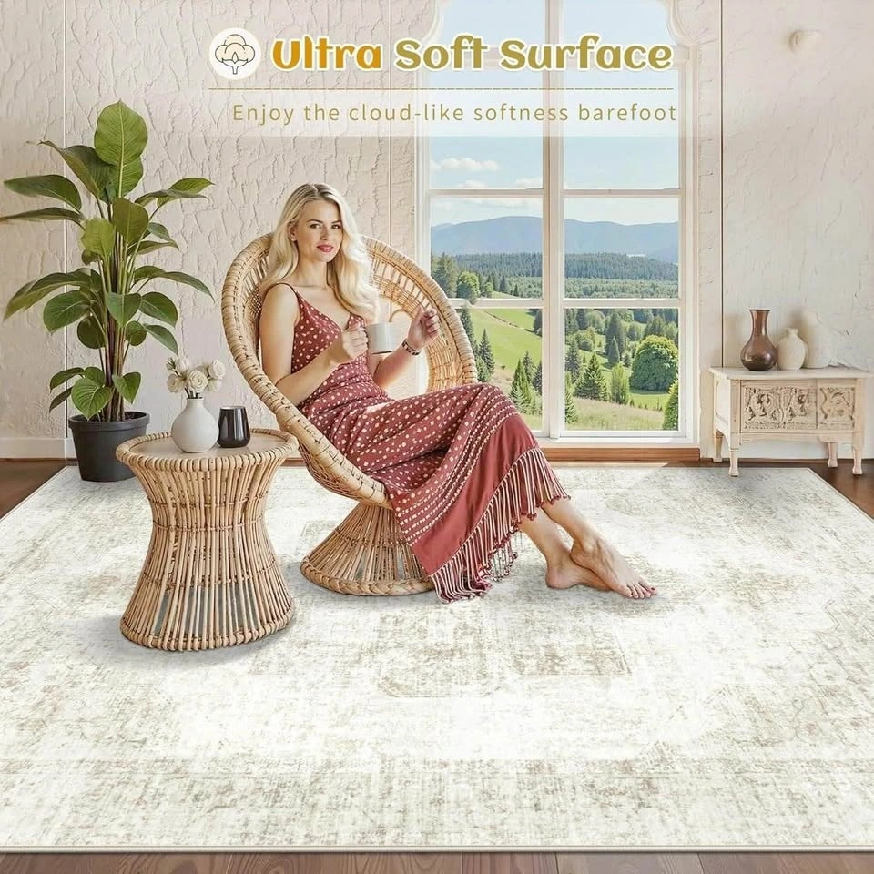 This 9x12 area rug is machine washable and easy to clean. Just toss it in the washing machine or wipe for spot cleaning. It dries fast and is stain-resistant. The surface is soft and skin-friendly, making it great for kids and pets. It has a non-slip backing that keeps it securely in place on any floor type. The low-pile, anti-shedding construction is durable for high traffic areas. It's also foldable for easy storage. The vintage boho medallion design is perfect for living rooms, bedrooms, or playrooms, and blends well with retro or boho decor. It's lightweight and easy to move. Upon unboxing, temporary creases may be present but will smooth out within 24-48 hours.