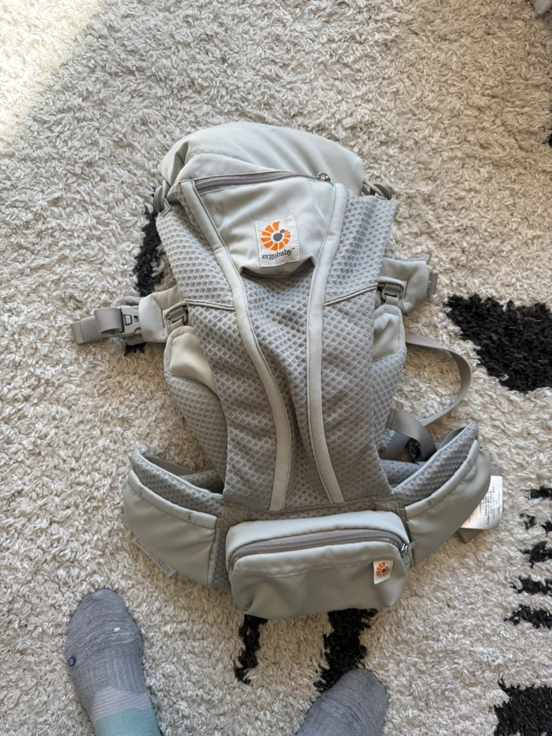 This Ergobaby baby carrier is a comfortable and adjustable way to carry your little one. It's gray and made with breathable mesh fabric. Includes a zippered pouch for essentials. Brand new never used