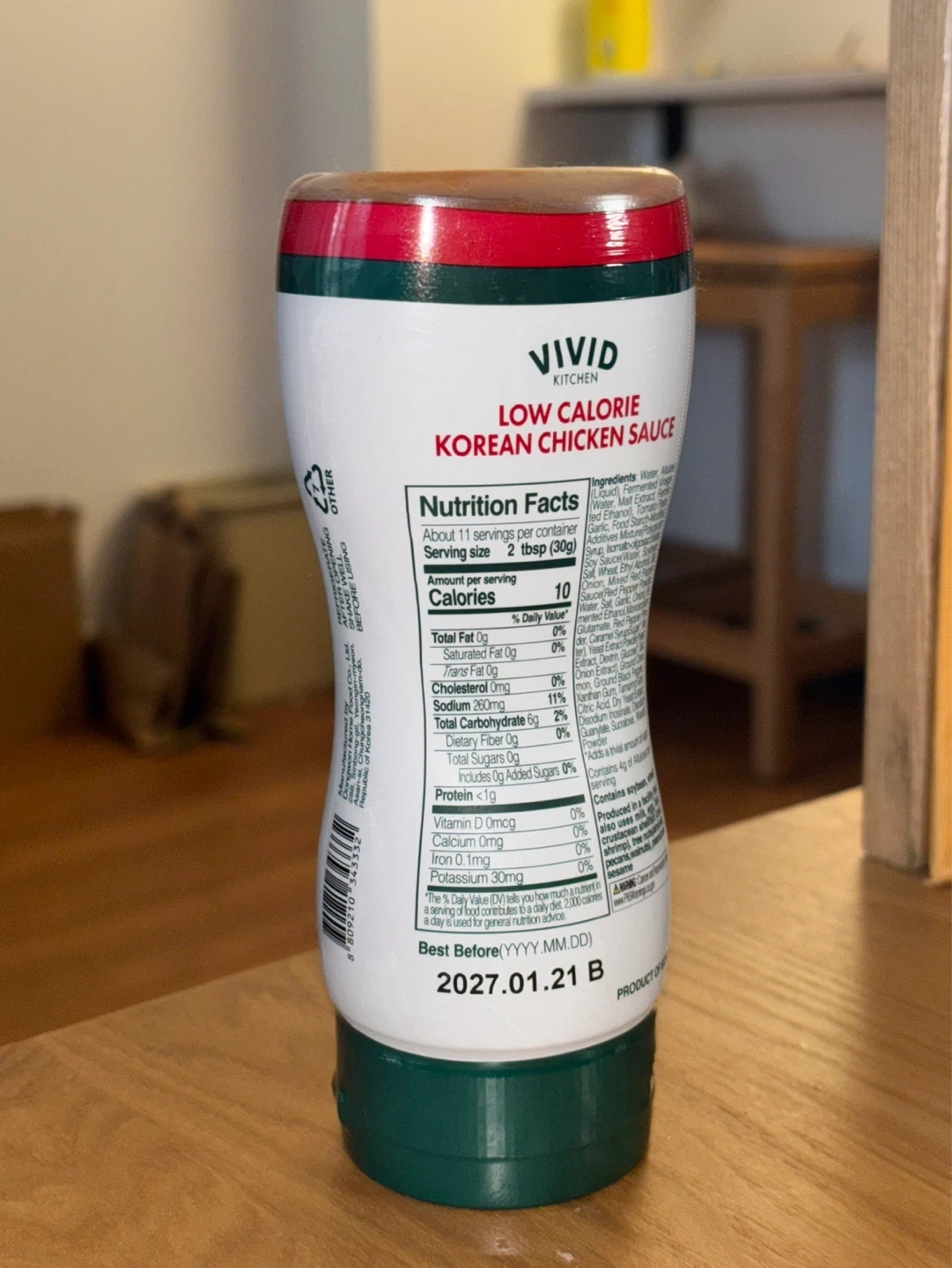 Vivid Kitchen low calorie Korean chicken sauce. Contains 0g sugar per serving. Best before 2027.01.21. 저당 양념치킨 소스