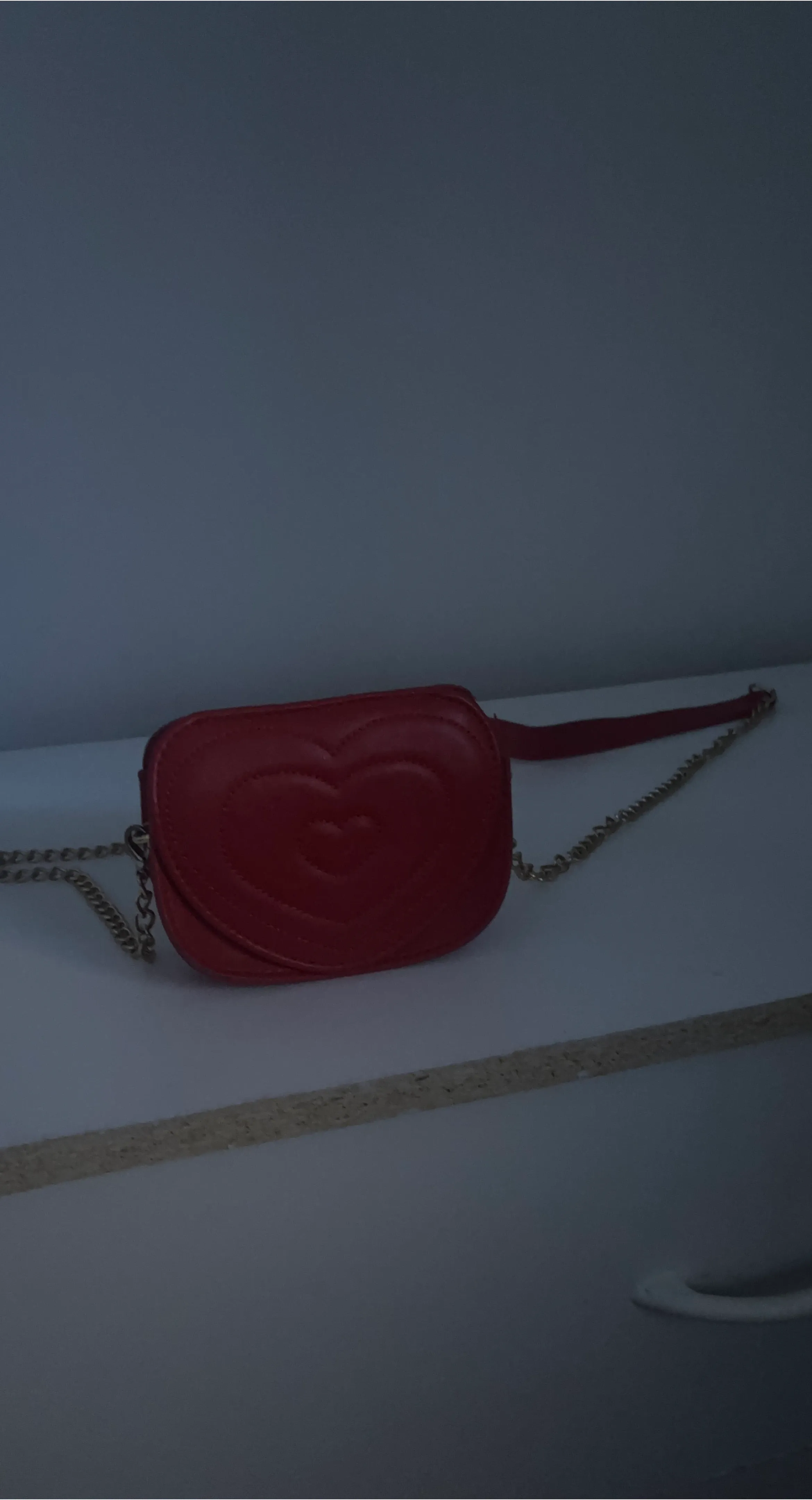 This red crossbody bag features a charming quilted heart design. It has a secure clasp closure and a delicate gold chain strap. This bag is perfect for carrying essentials for a night out or a special occasion!