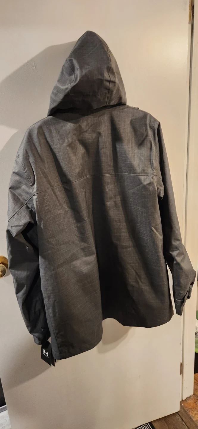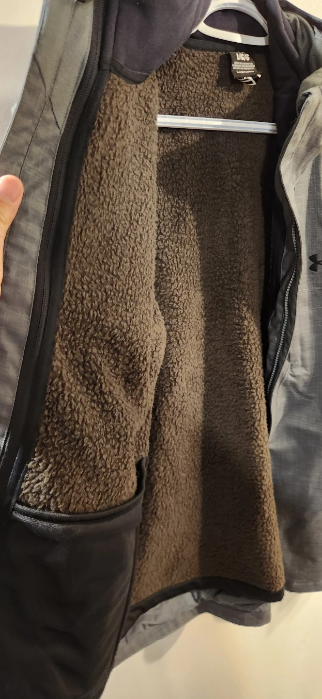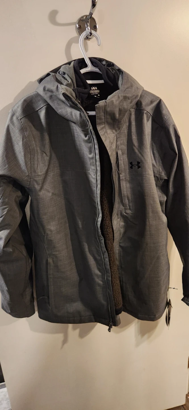 Brand new with tags. This Under Armour jacket is lined with soft fleece for warmth. It's a men's L/G size in a grey textured finish. It comes with a hood for extra protection. Pick up in Orleans.