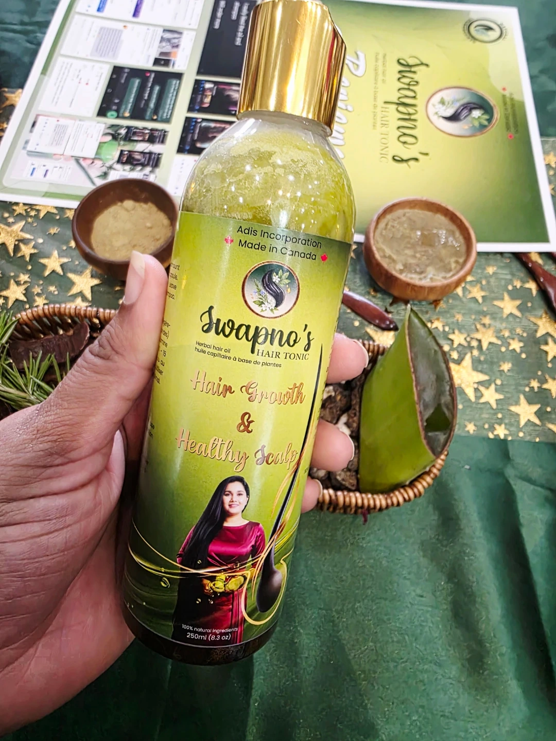 Swapno's Herbal Hair Tonic promotes hair growth and a healthy scalp. It's a 100% natural herbal hair oil, shampoo, and hair mask. This tonic is designed to reduce hair fall and dandruff. 250ml bottle. Approved and licensed in Canada.